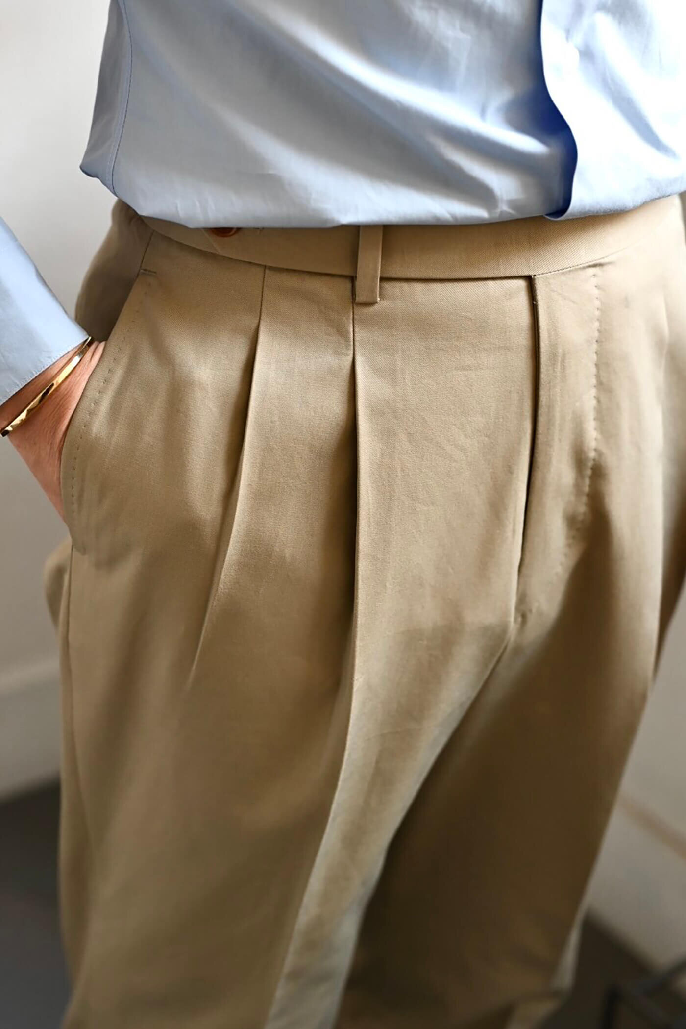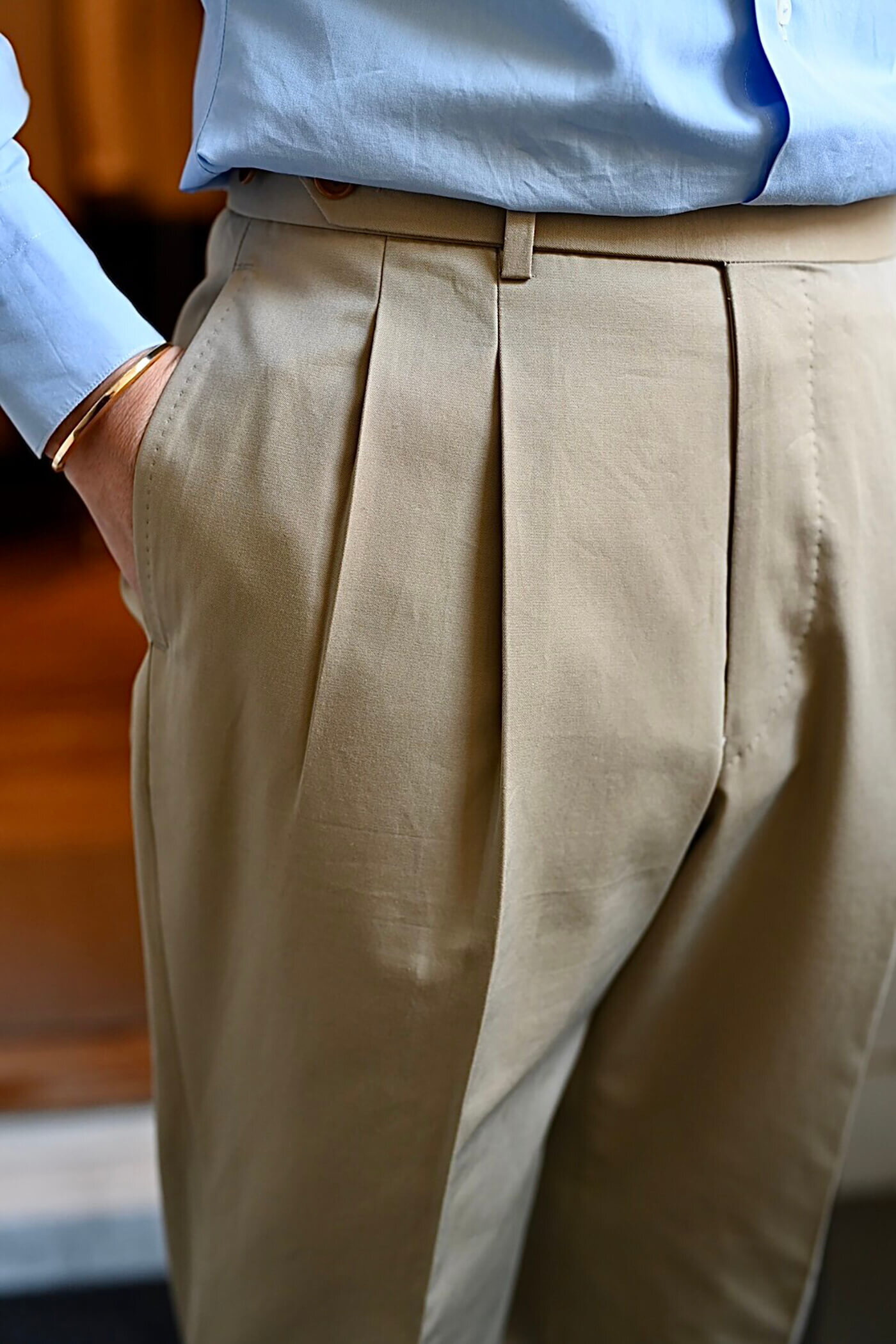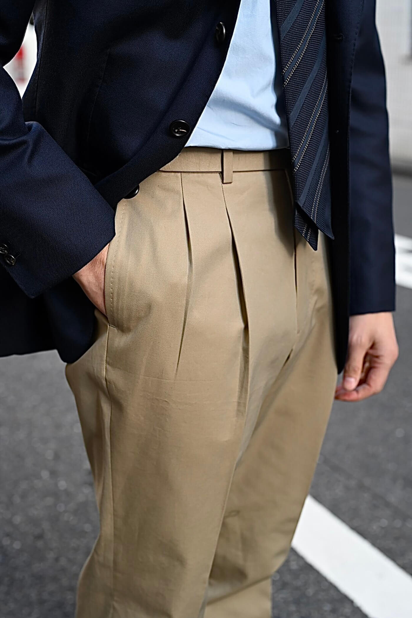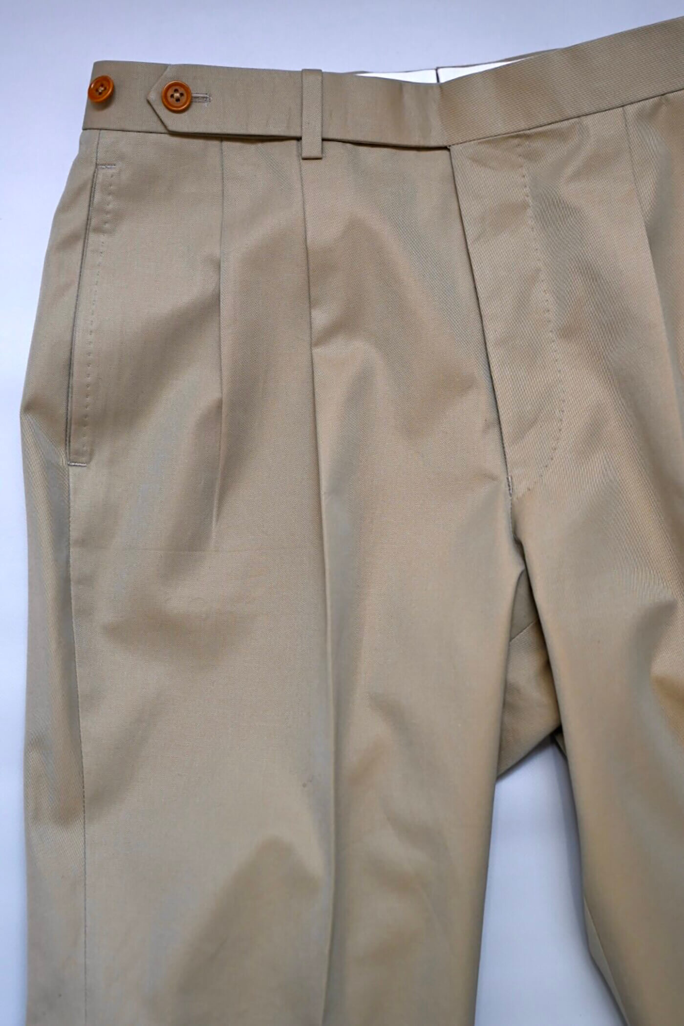 デザインは2プリーツ、ベルトレスの仕様で仕立てました。