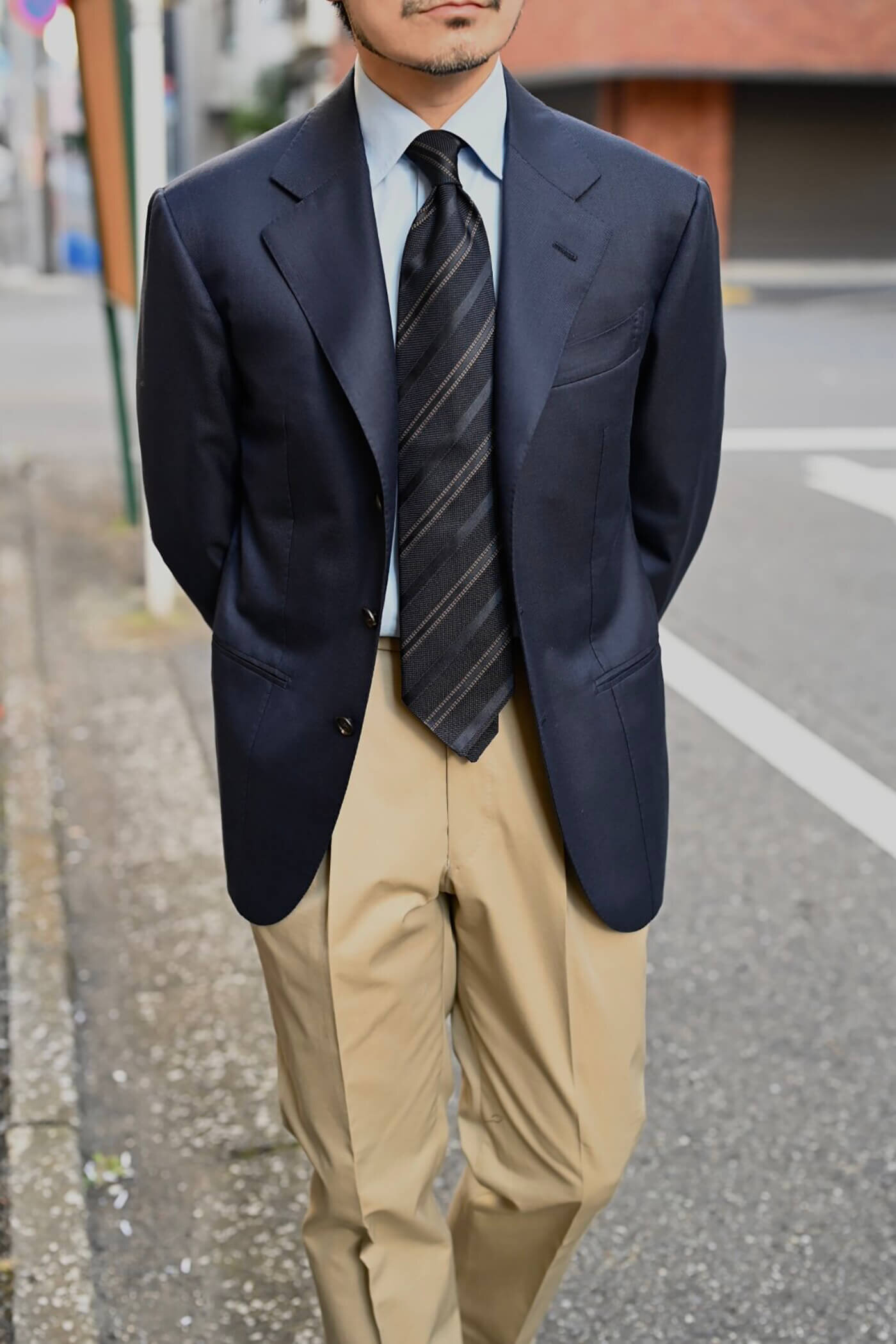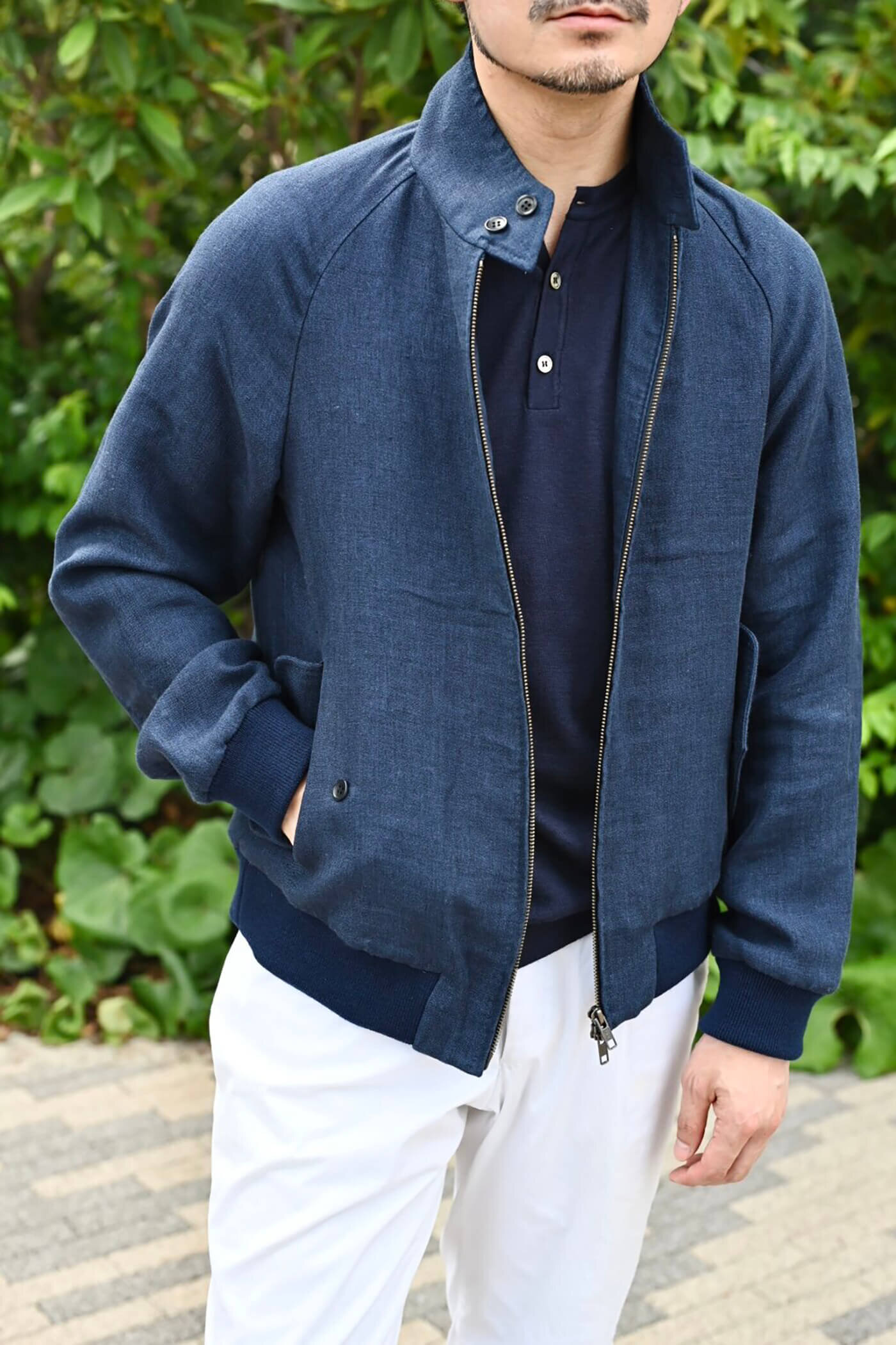 ジャパニーズコットンギャバジンパンツを使ったコーディネート。