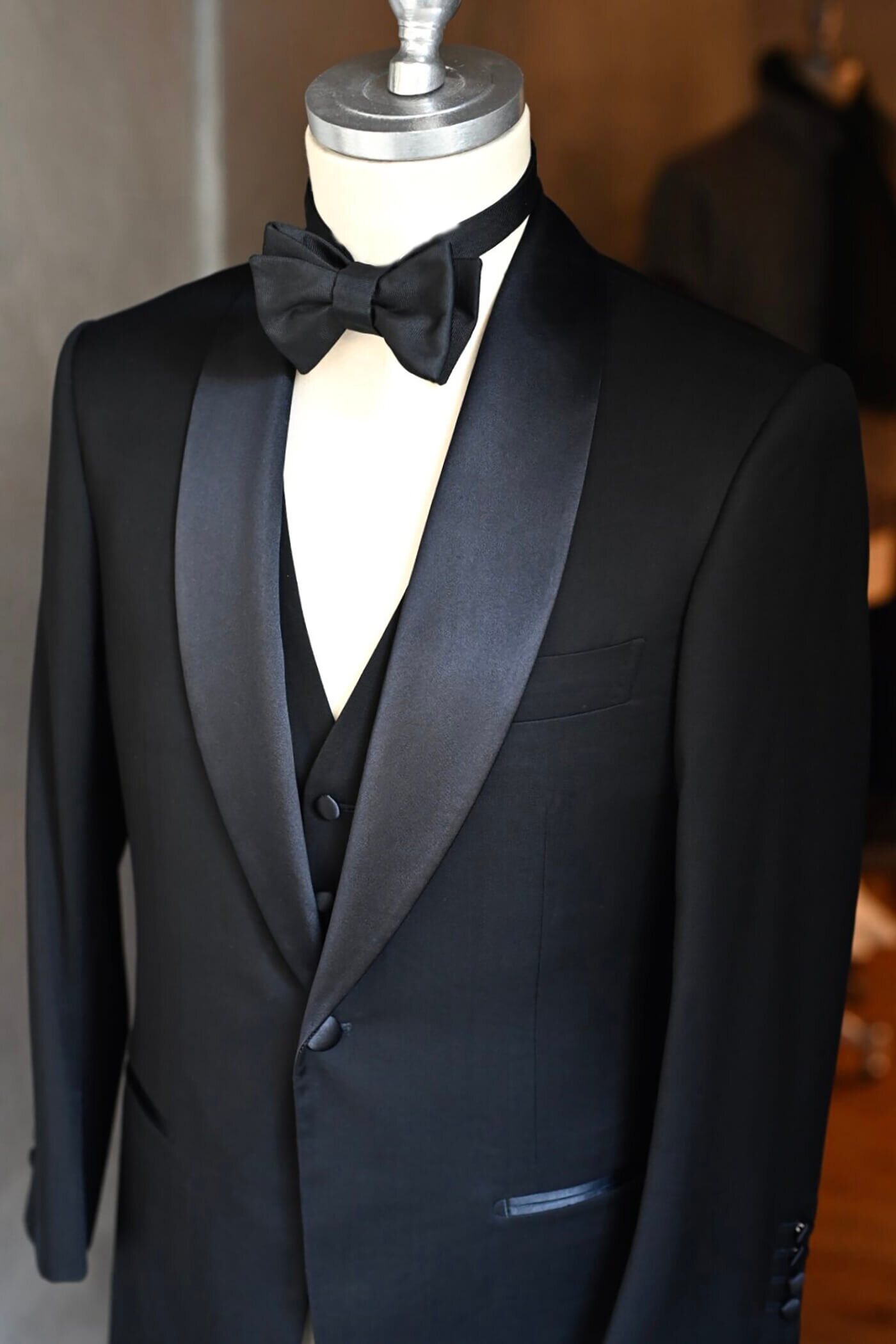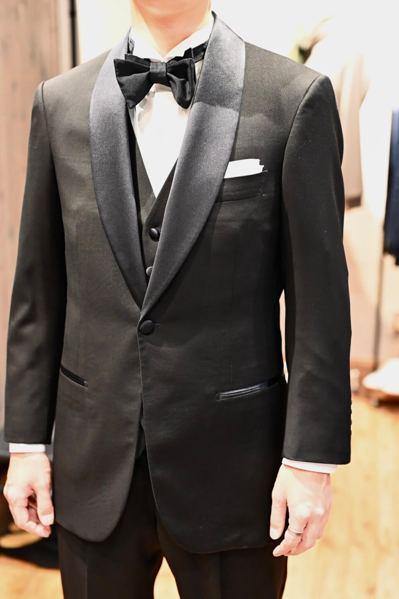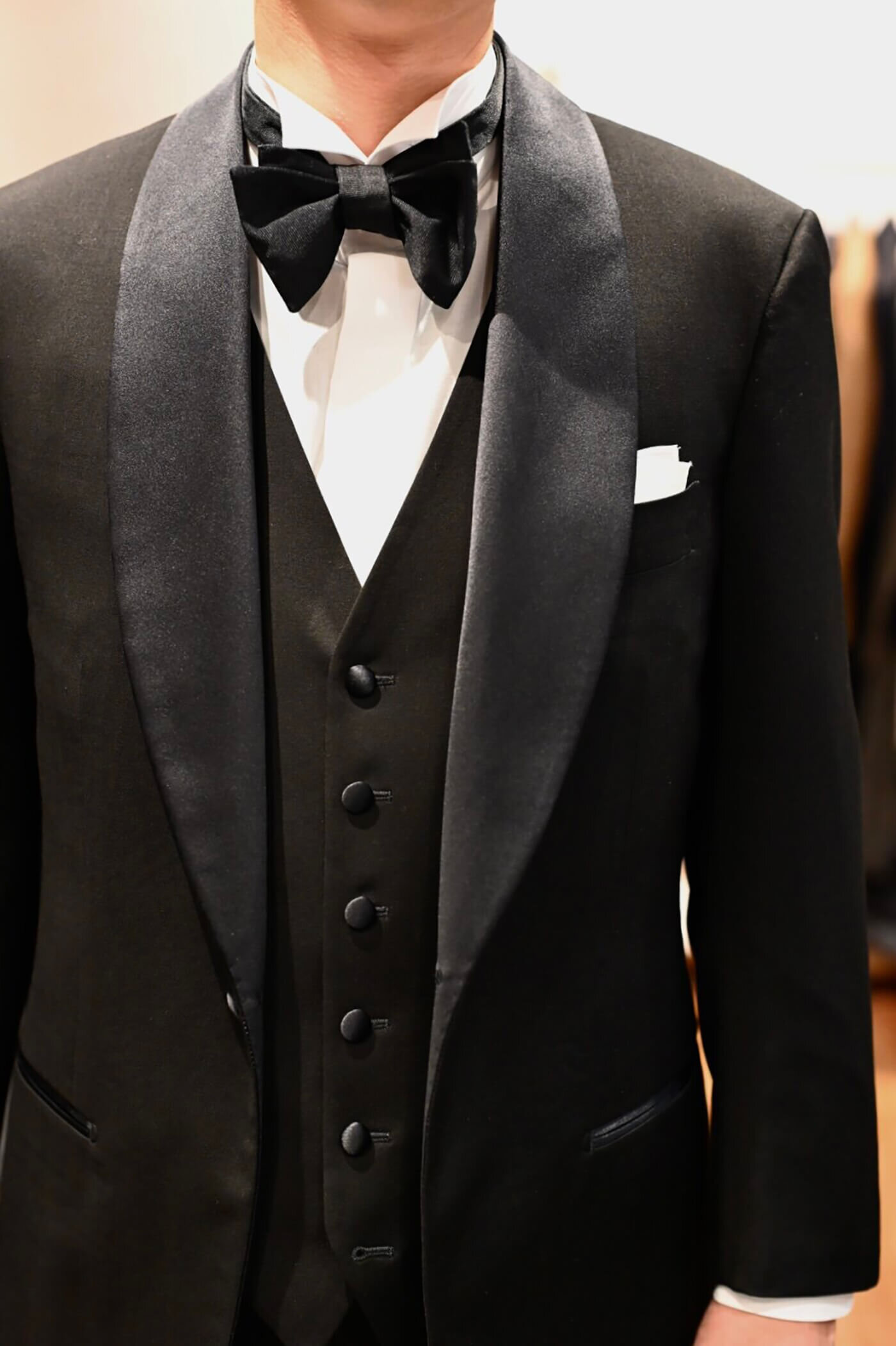 ラペルの拝絹(はいけん)がタキシードの特徴のひとつです。