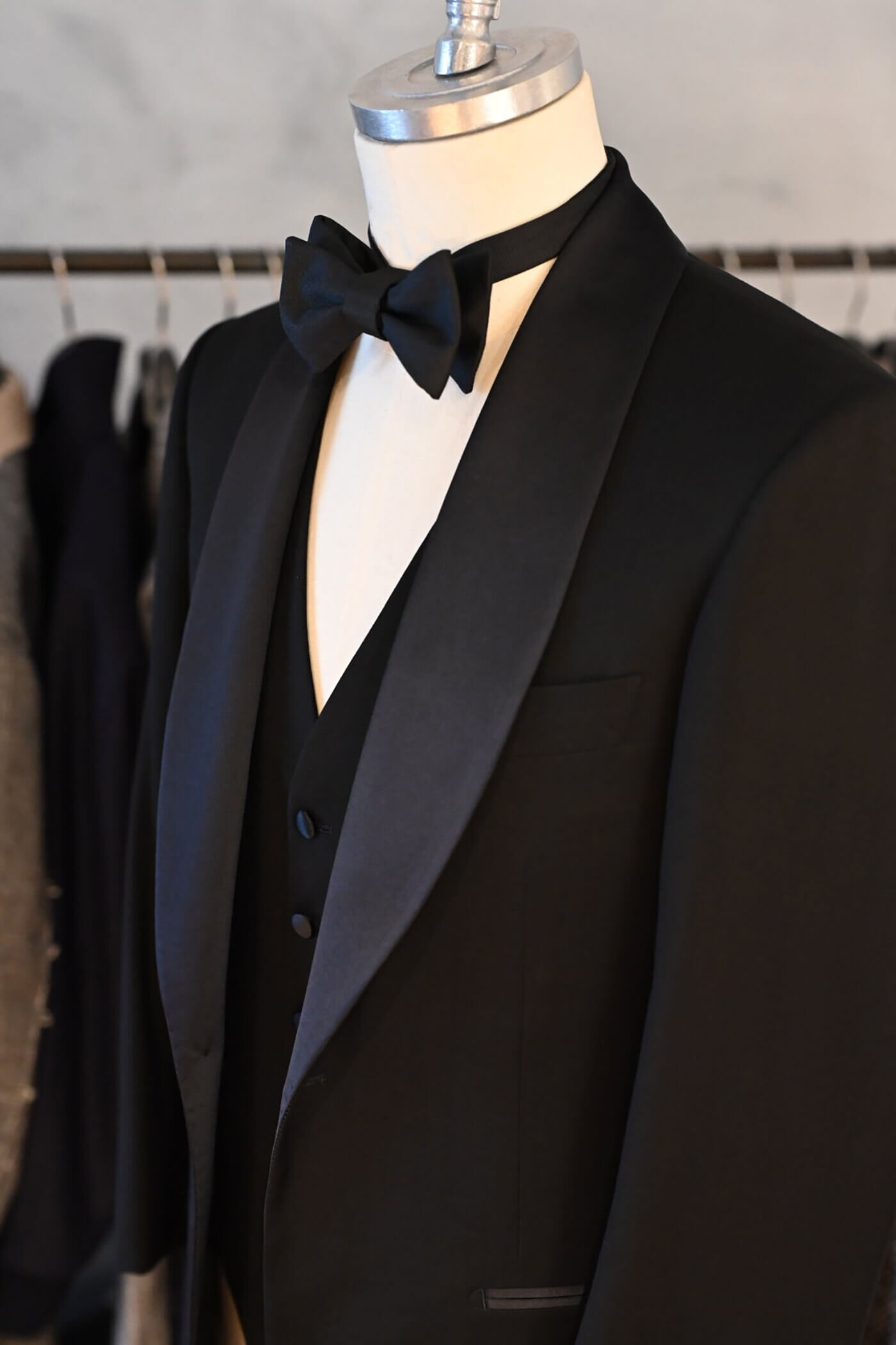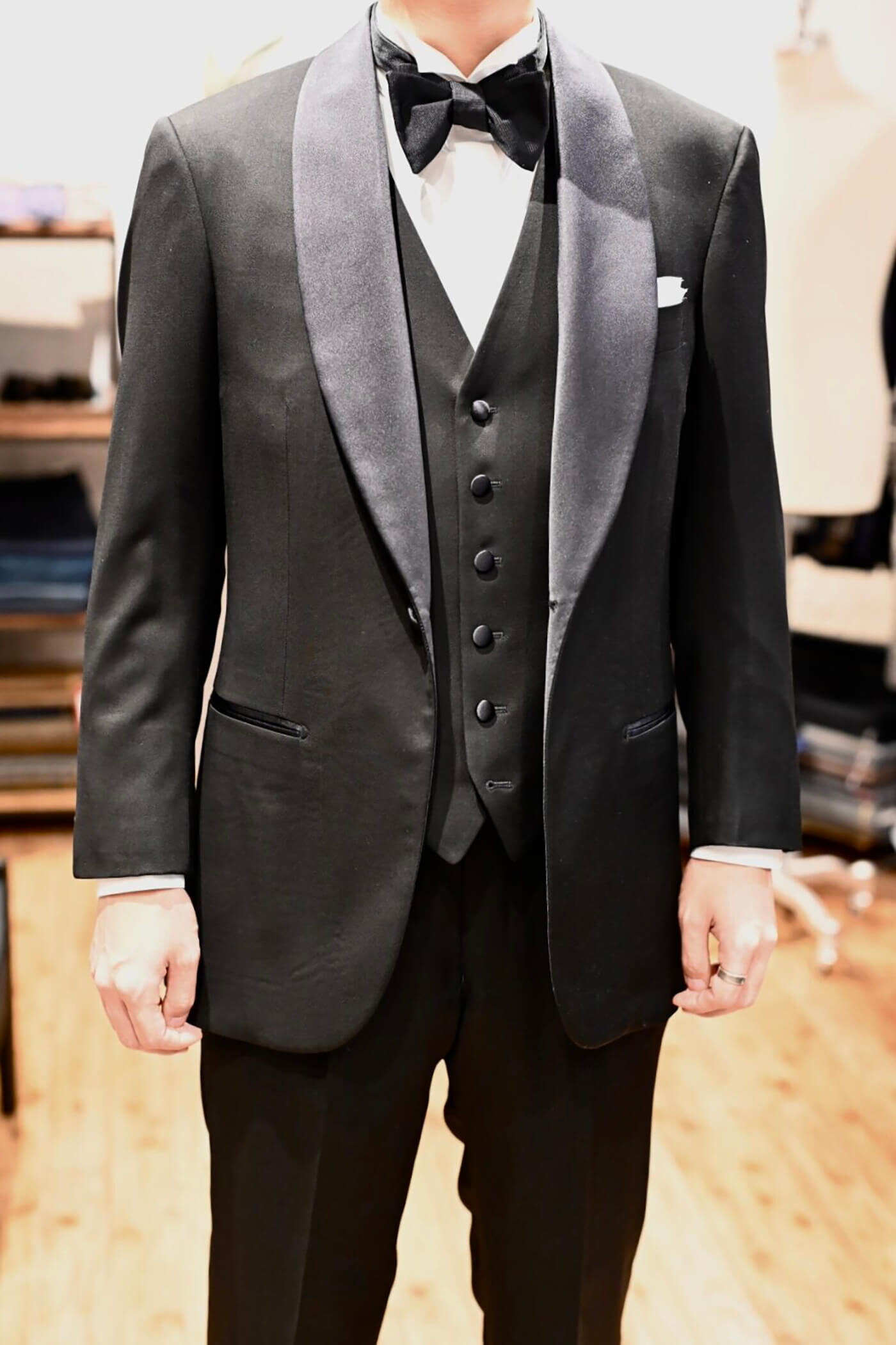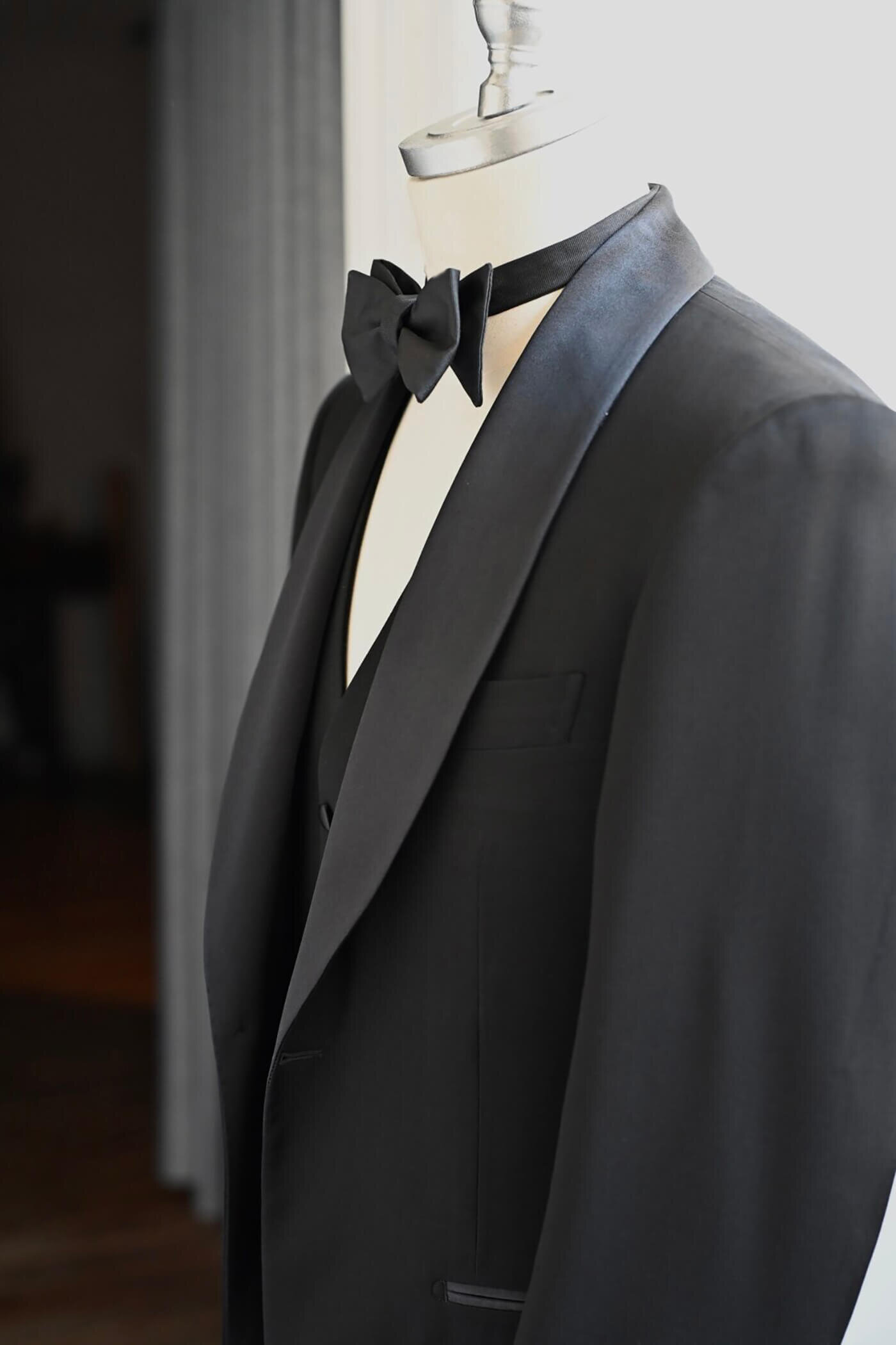 ラペルの拝絹(はいけん)がタキシードの特徴のひとつです。