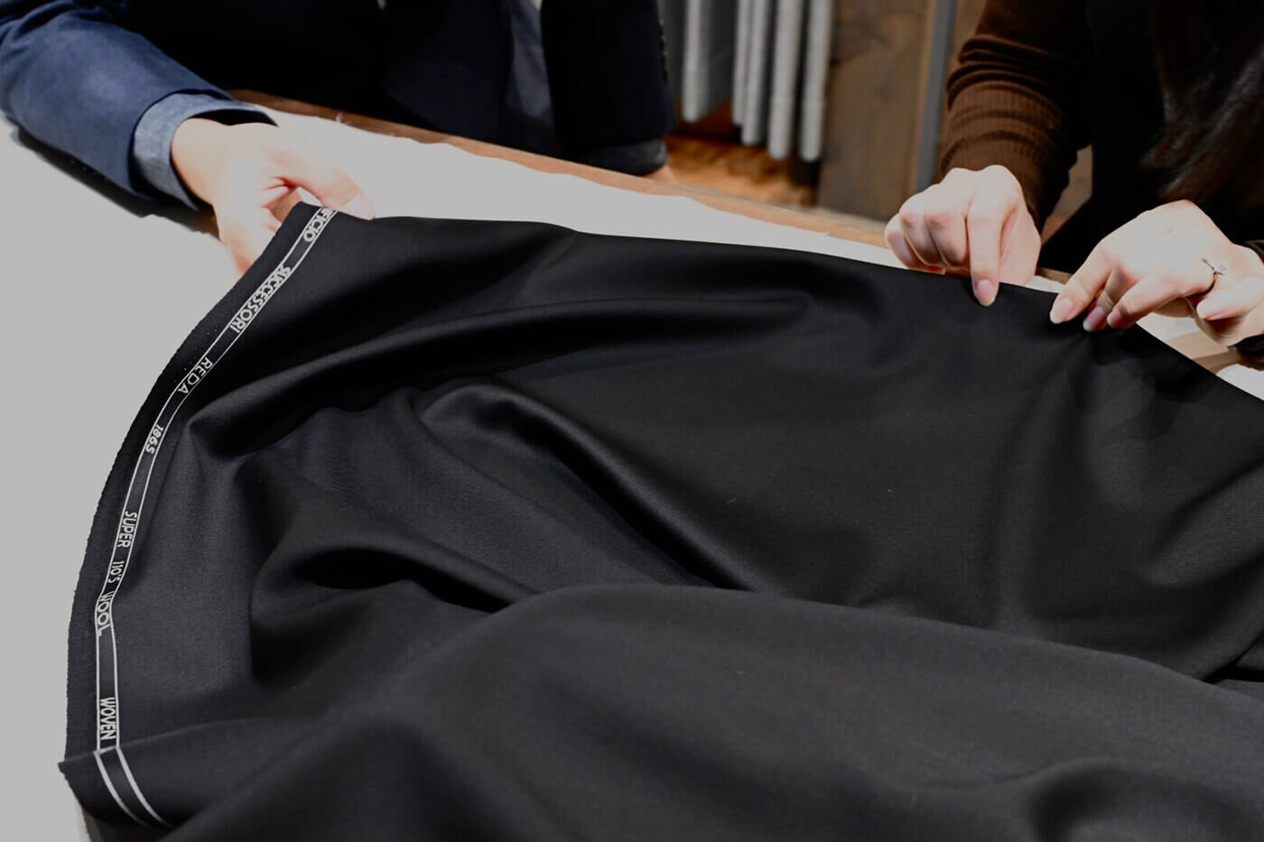 お客様から頂戴したオーダーアイテムの素材選びから仕上がりまでの過程について、"CERIMONIA BLACKで仕立てるTuxedo"のオーダーを一例にご説明をさせていただきます。