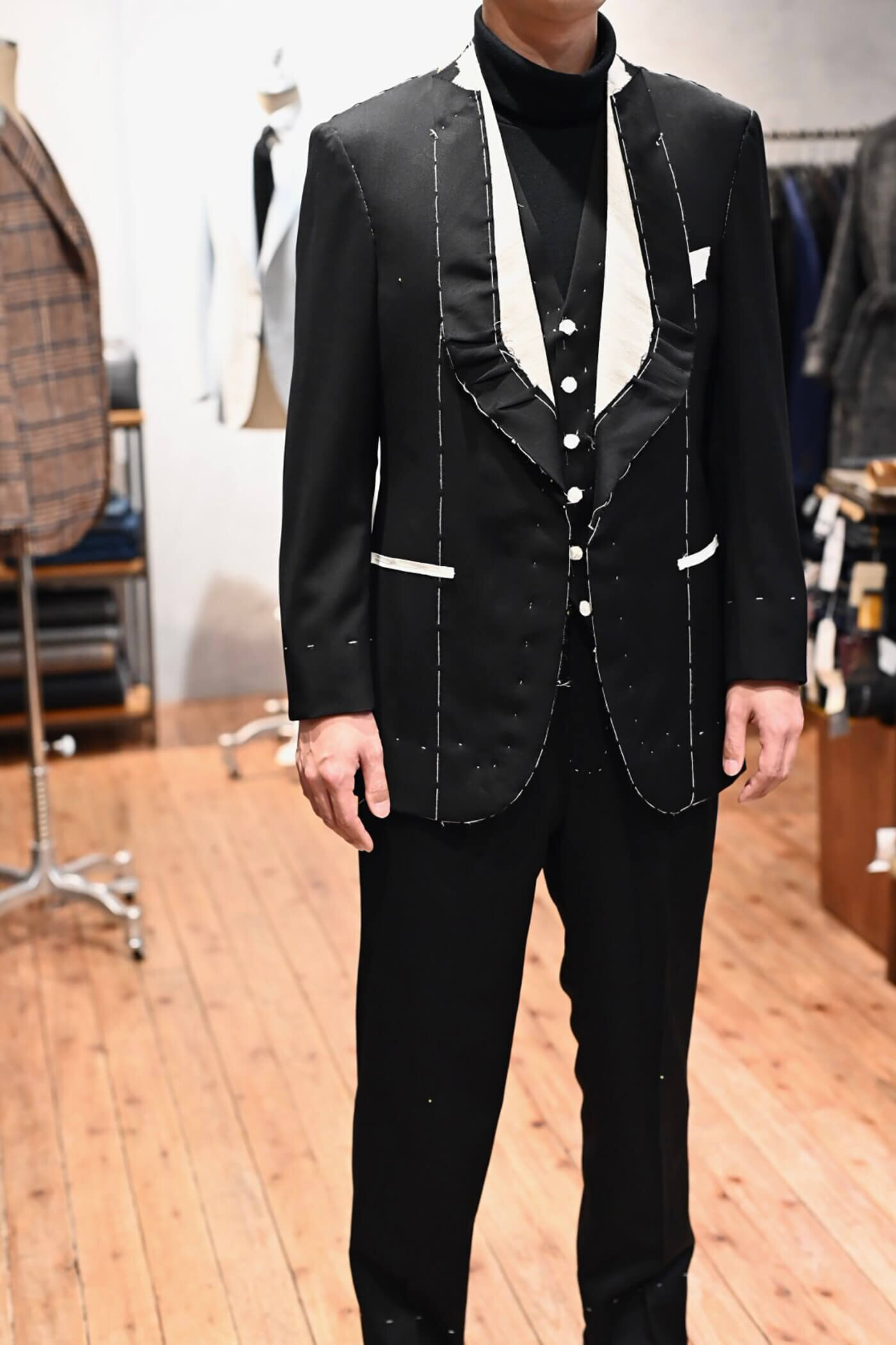 前回のオーダーはカジュアル使いができる素材のツーピーススーツを仕立てさせていただいたのですが、今回はタキシードということもありデザインが1着目と全く異なりますので仮縫い付きの仕立てをお薦めさせていただきました。