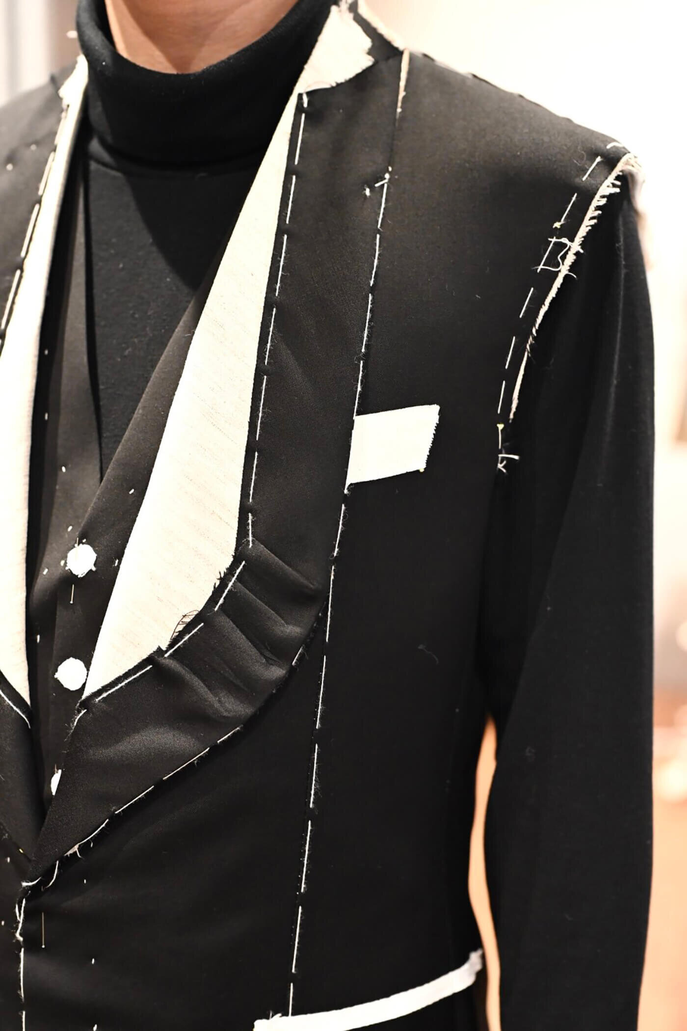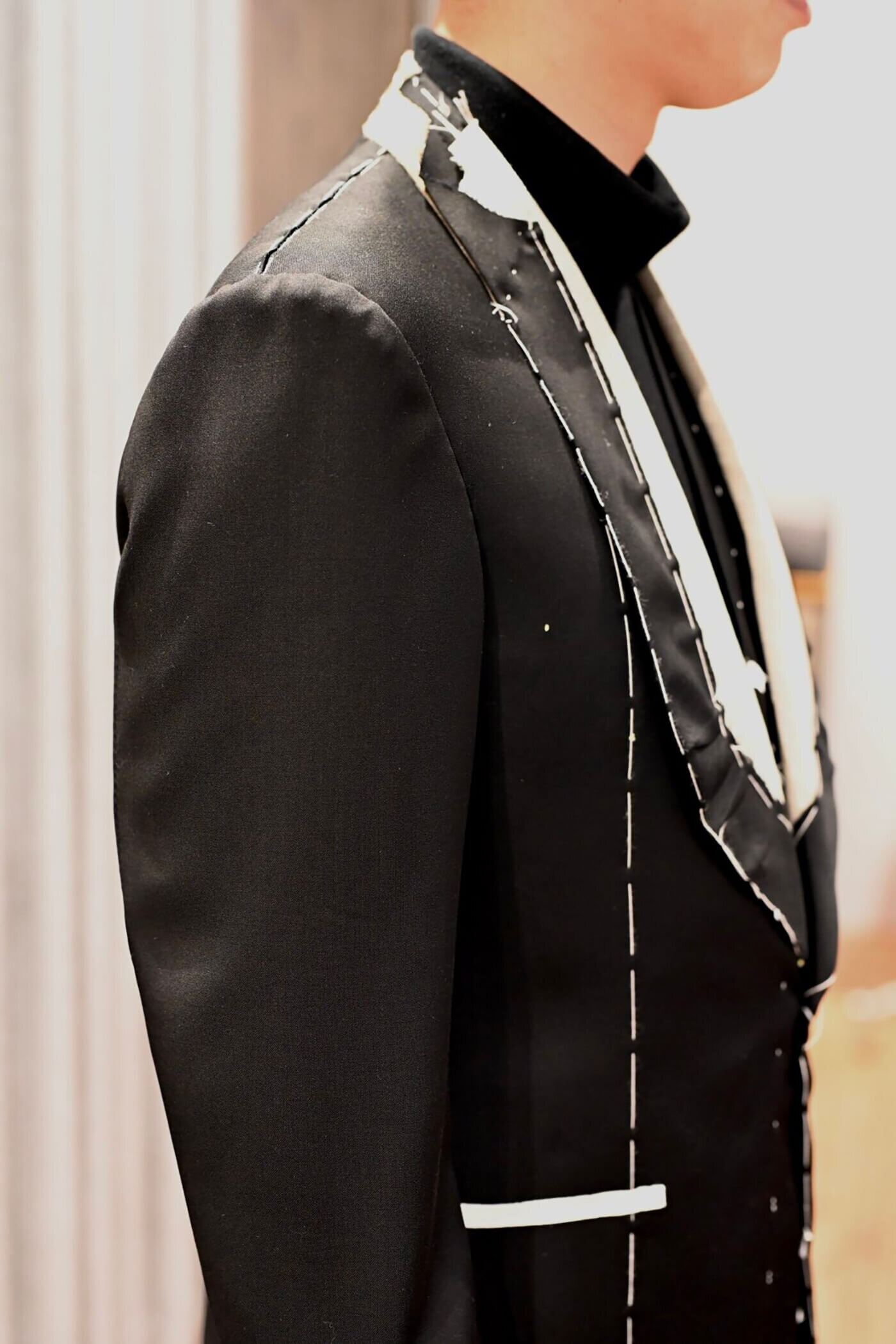 1着目にご納品させていただいたスーツのデータを基にタキシード用に改めて調整を加えた仮縫いを着用していただき、再度フィッティングのチェックをさせていただきます。