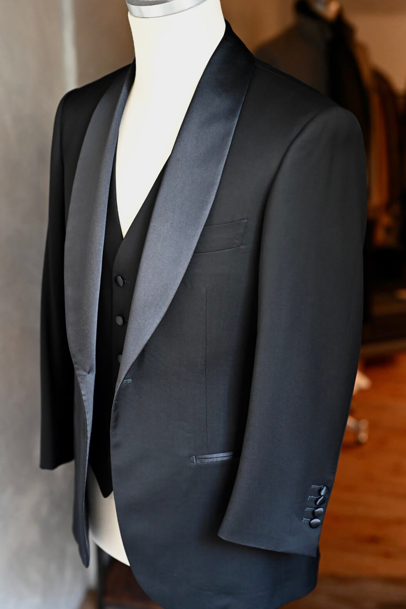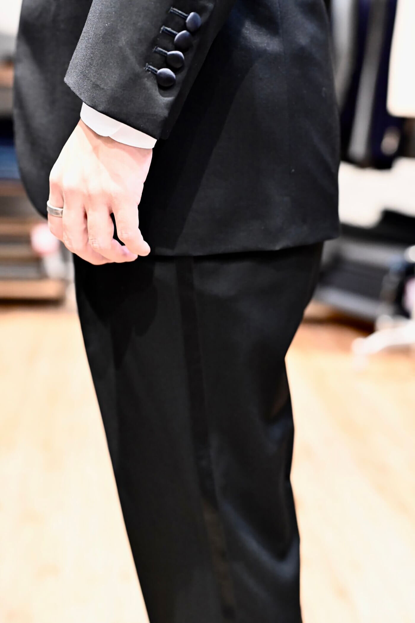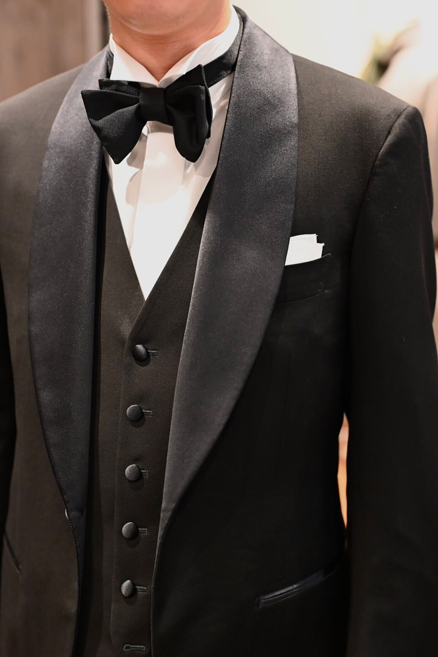 セレモニー用のブラックの生地にも黒色の深さや光沢の差がありますので、タキシードを仕立てるのに最も適したブラックとしてご提案をさせていただきました。