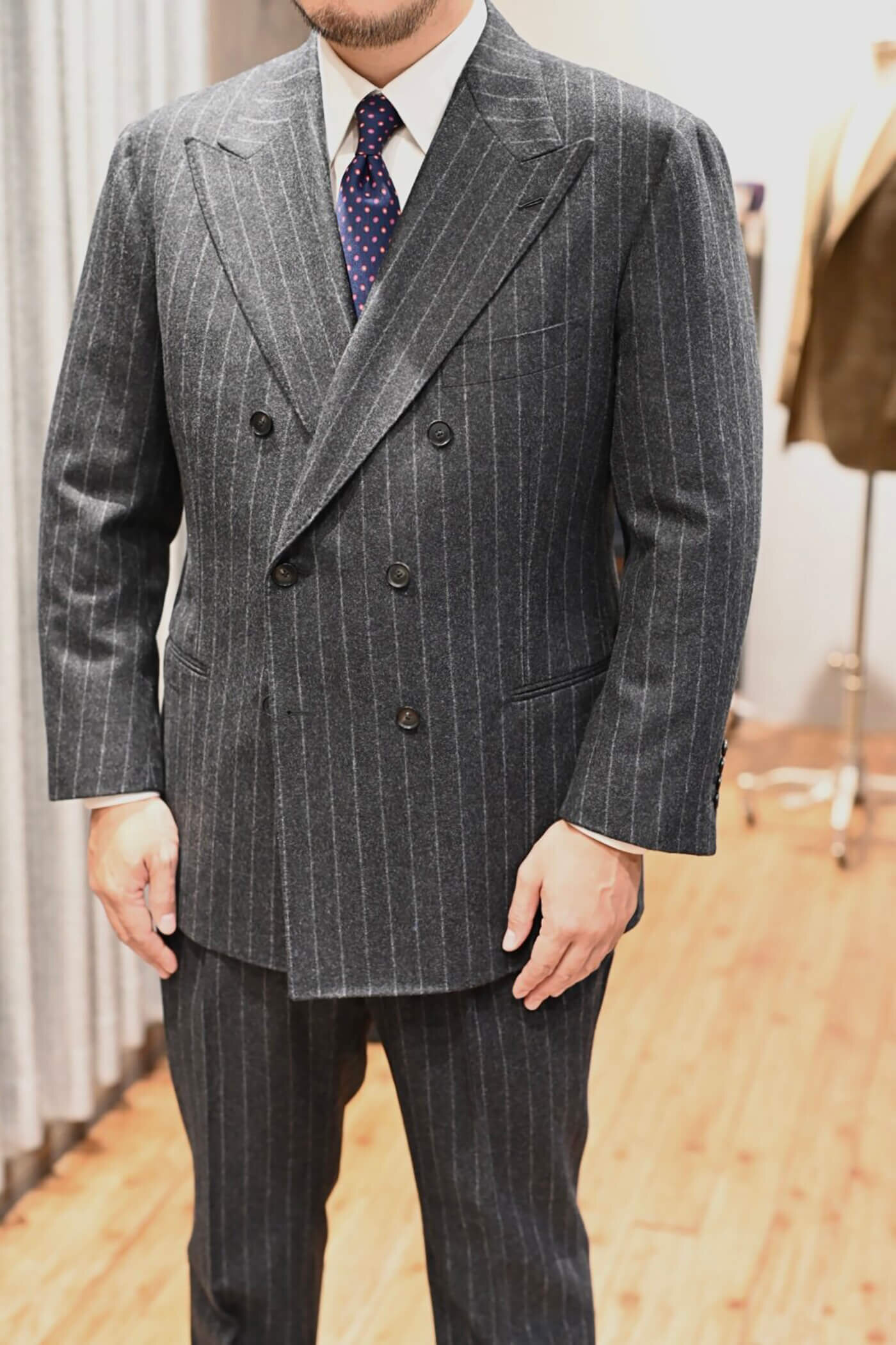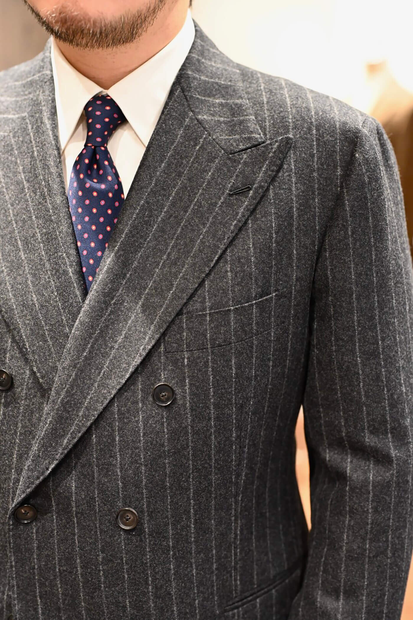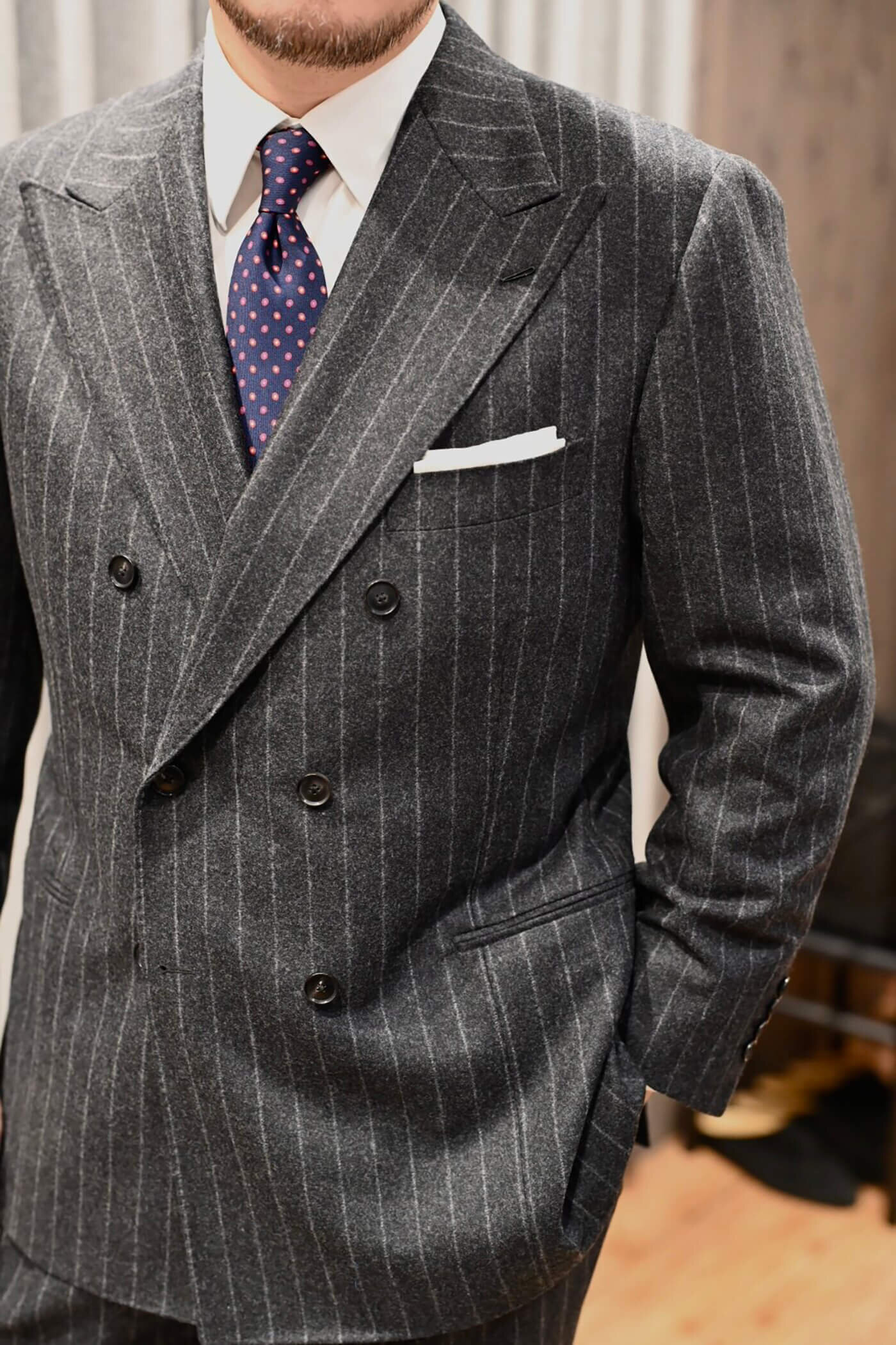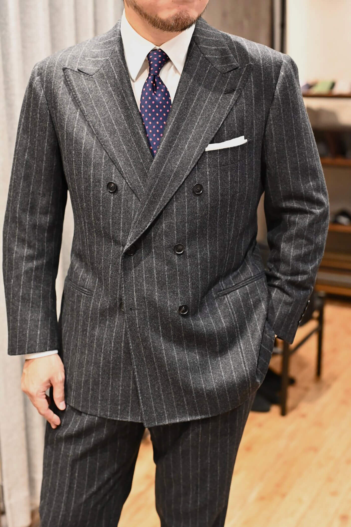 ご依頼を受けた時はスリーピーススーツをお薦めしようかと少し迷ったのですが、ダブルのスーツスタイルがすごくお似合いになるだろうと確信していた事とDORSOのストックコレクションとして仕入れたグレーチョークストライプフランネルの入荷がトランクショー開催にタイミング良く間に合った事を理由にご提案をさせていただきました。