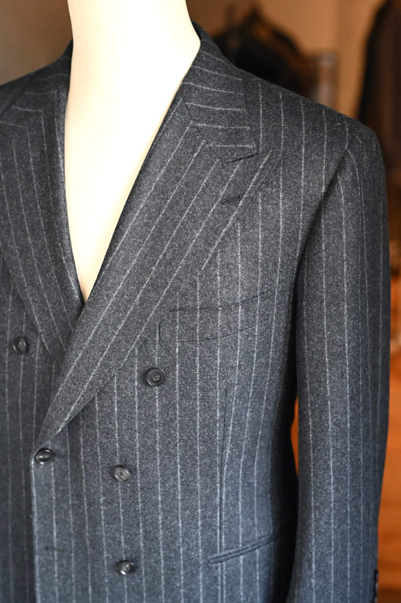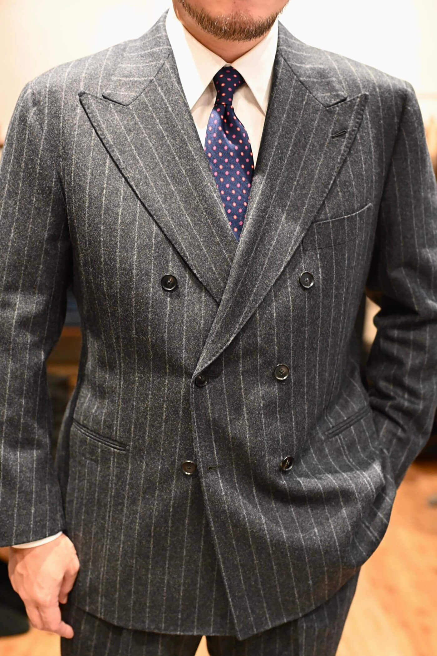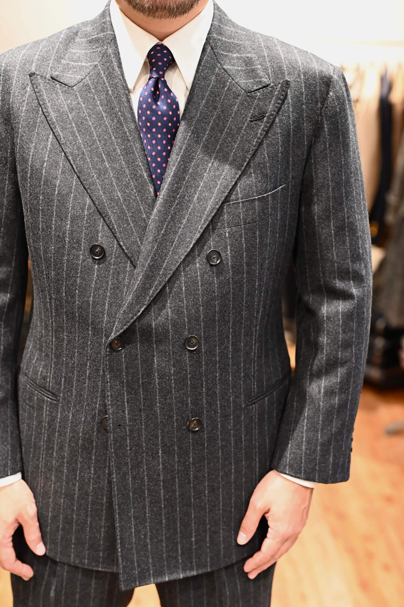 ご依頼を受けた時はスリーピーススーツをお薦めしようかと少し迷ったのですが、ダブルのスーツスタイルがすごくお似合いになるだろうと確信していた事とDORSOのストックコレクションとして仕入れたグレーチョークストライプフランネルの入荷がトランクショー開催にタイミング良く間に合った事を理由にご提案をさせていただきました。