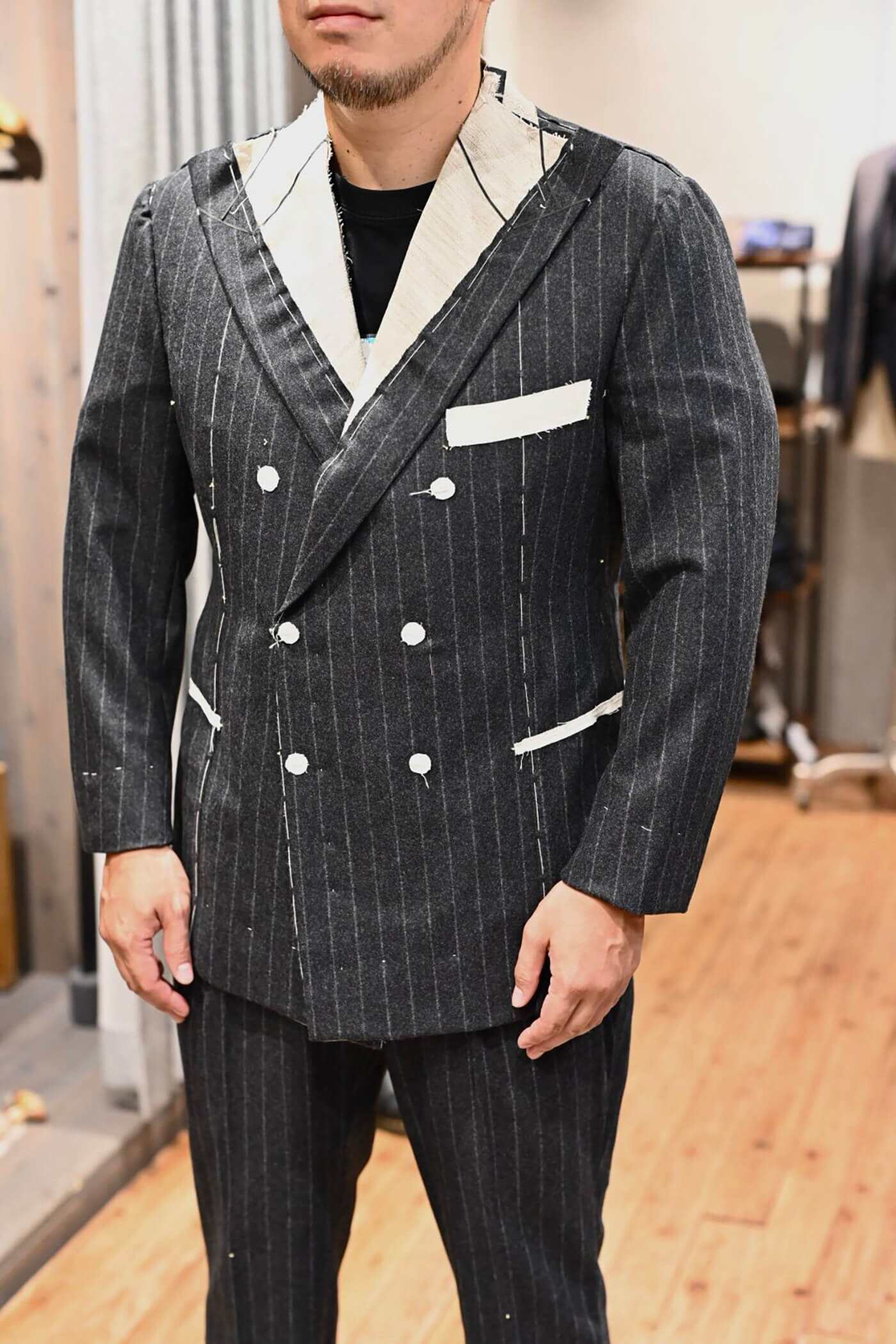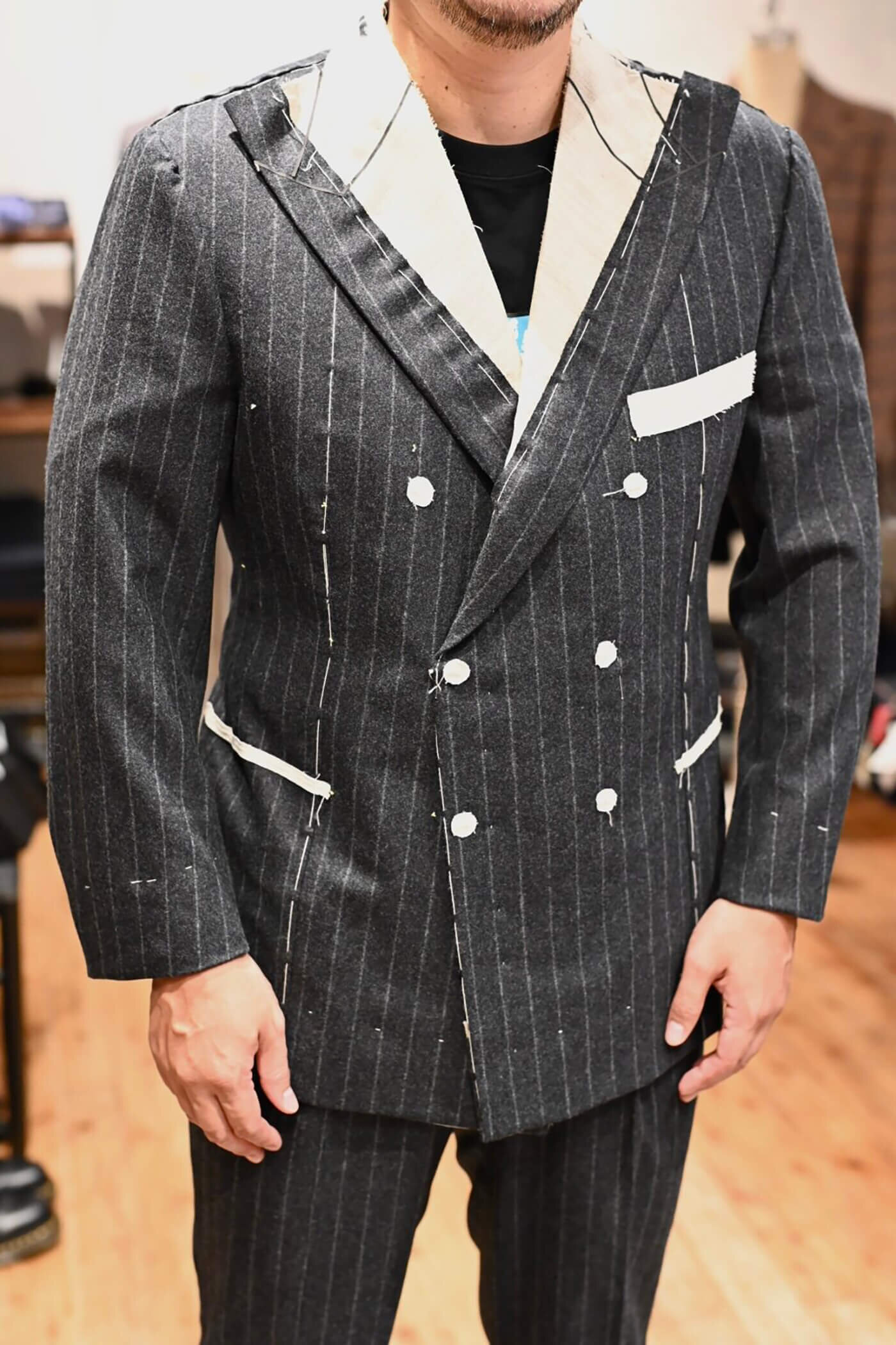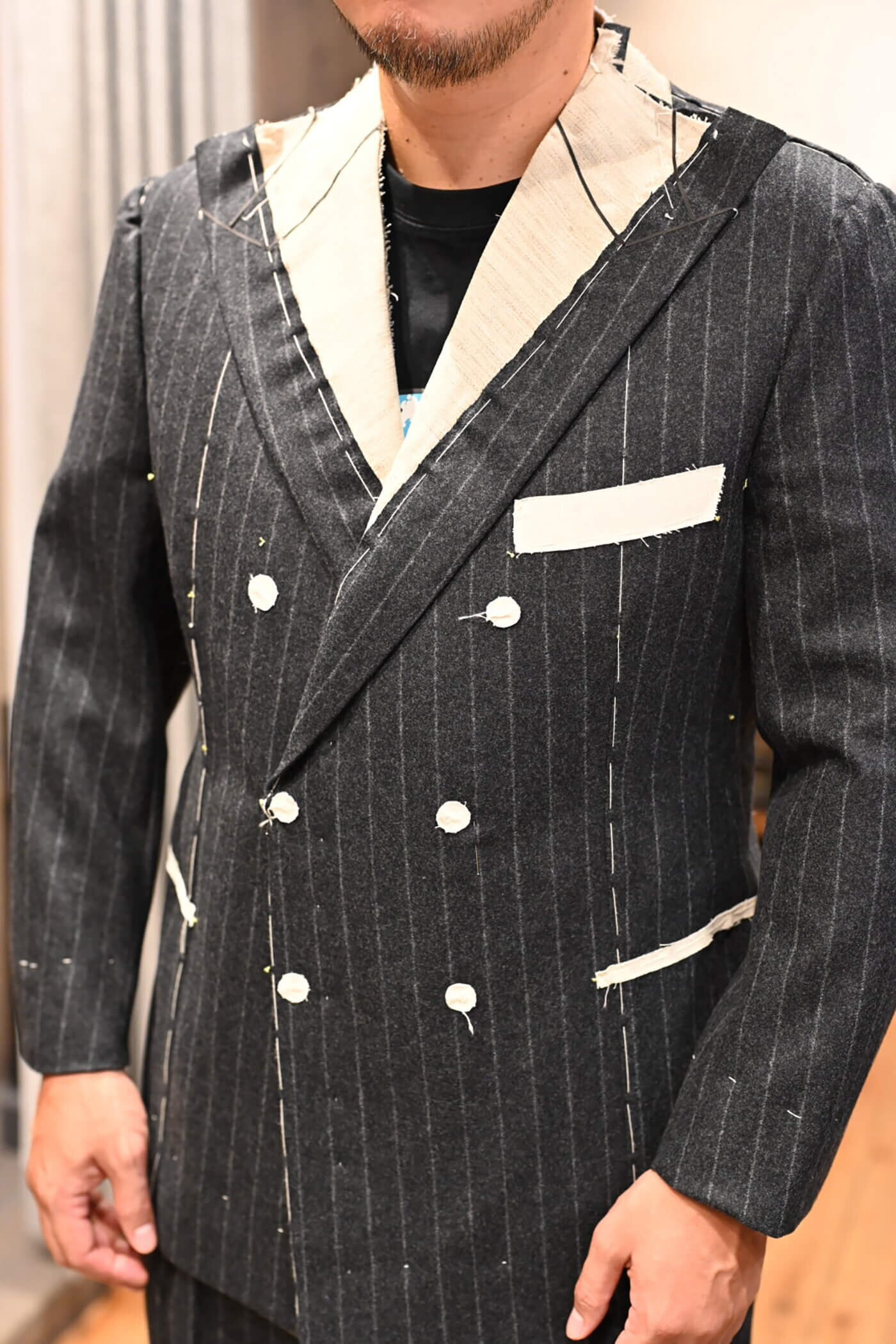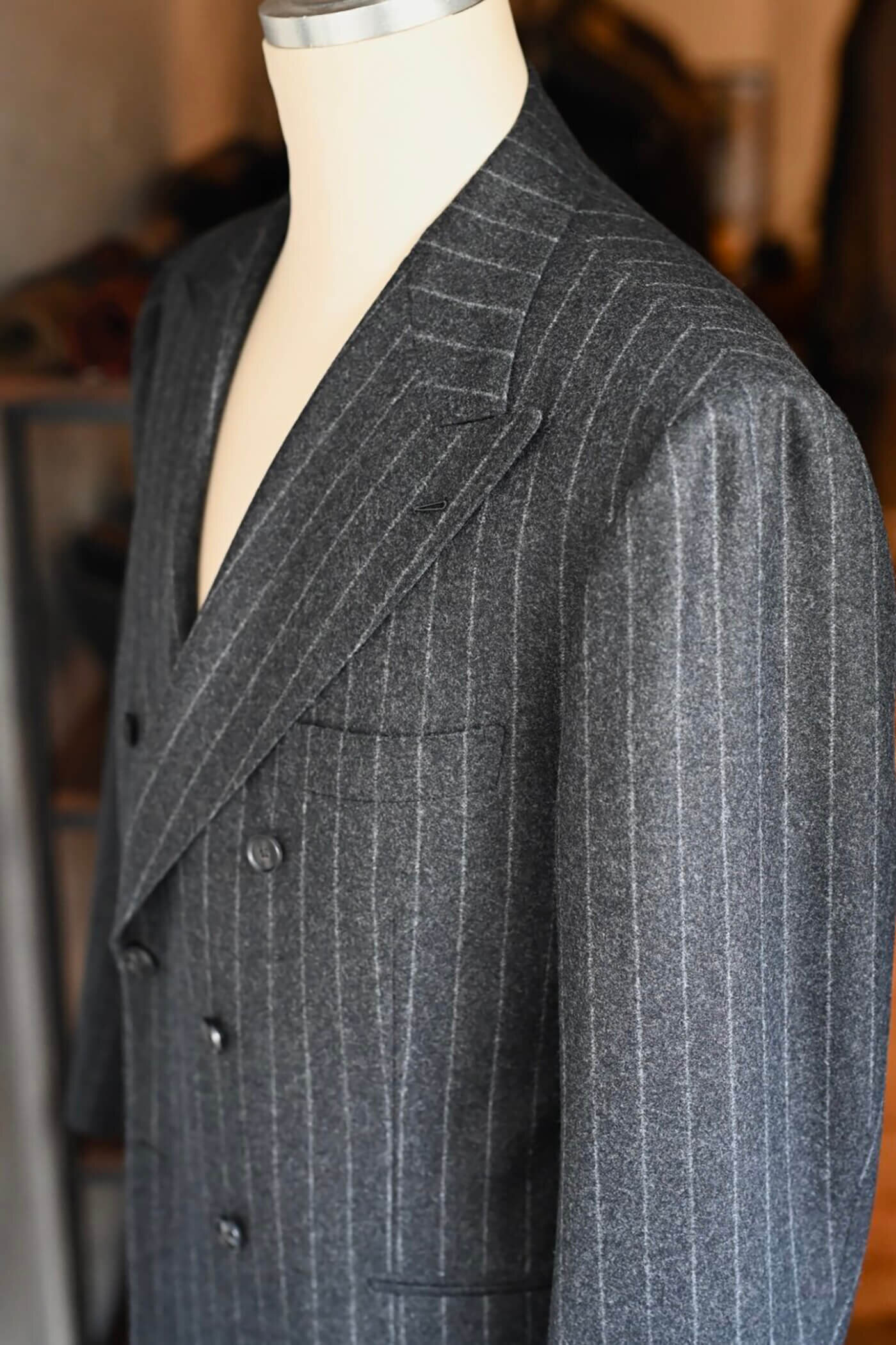 ご依頼を受けた時はスリーピーススーツをお薦めしようかと少し迷ったのですが、ダブルのスーツスタイルがすごくお似合いになるだろうと確信していた事とDORSOのストックコレクションとして仕入れたグレーチョークストライプフランネルの入荷がトランクショー開催にタイミング良く間に合った事を理由にご提案をさせていただきました。