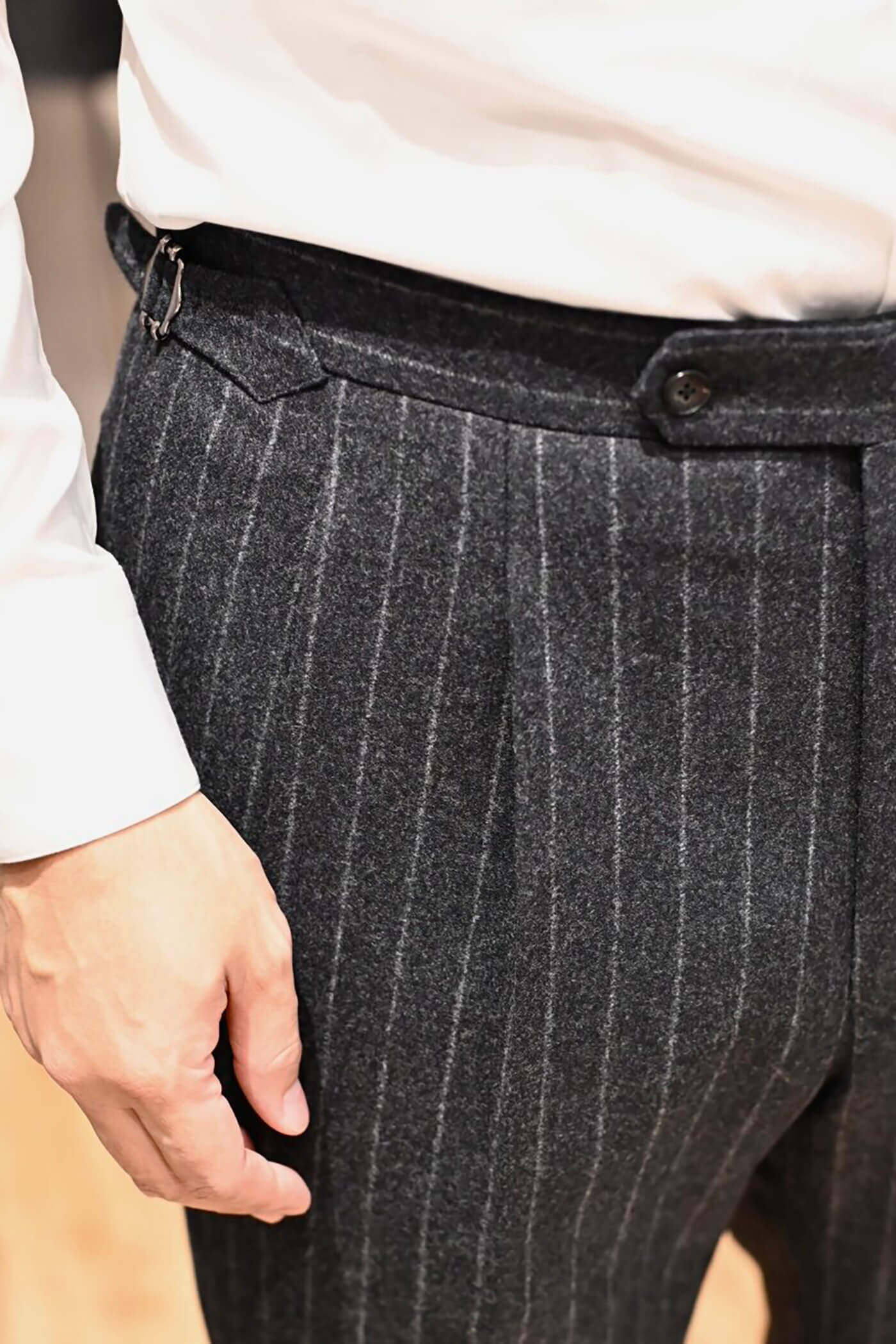 これらの魅力に惹かれて秋冬のストックコレクションに加えたグレーチョークストライプフランネルをお客様にご提案をさせていただきオーダーをいただきました。