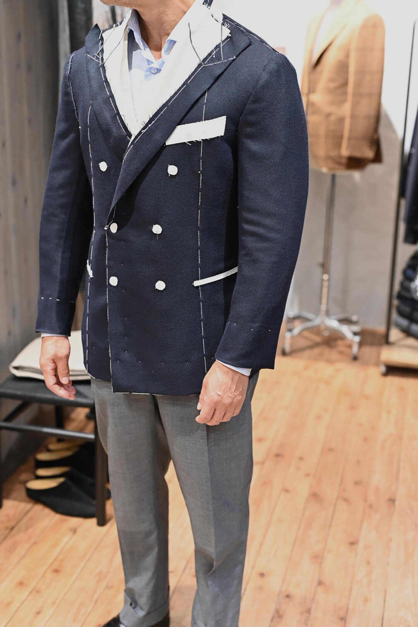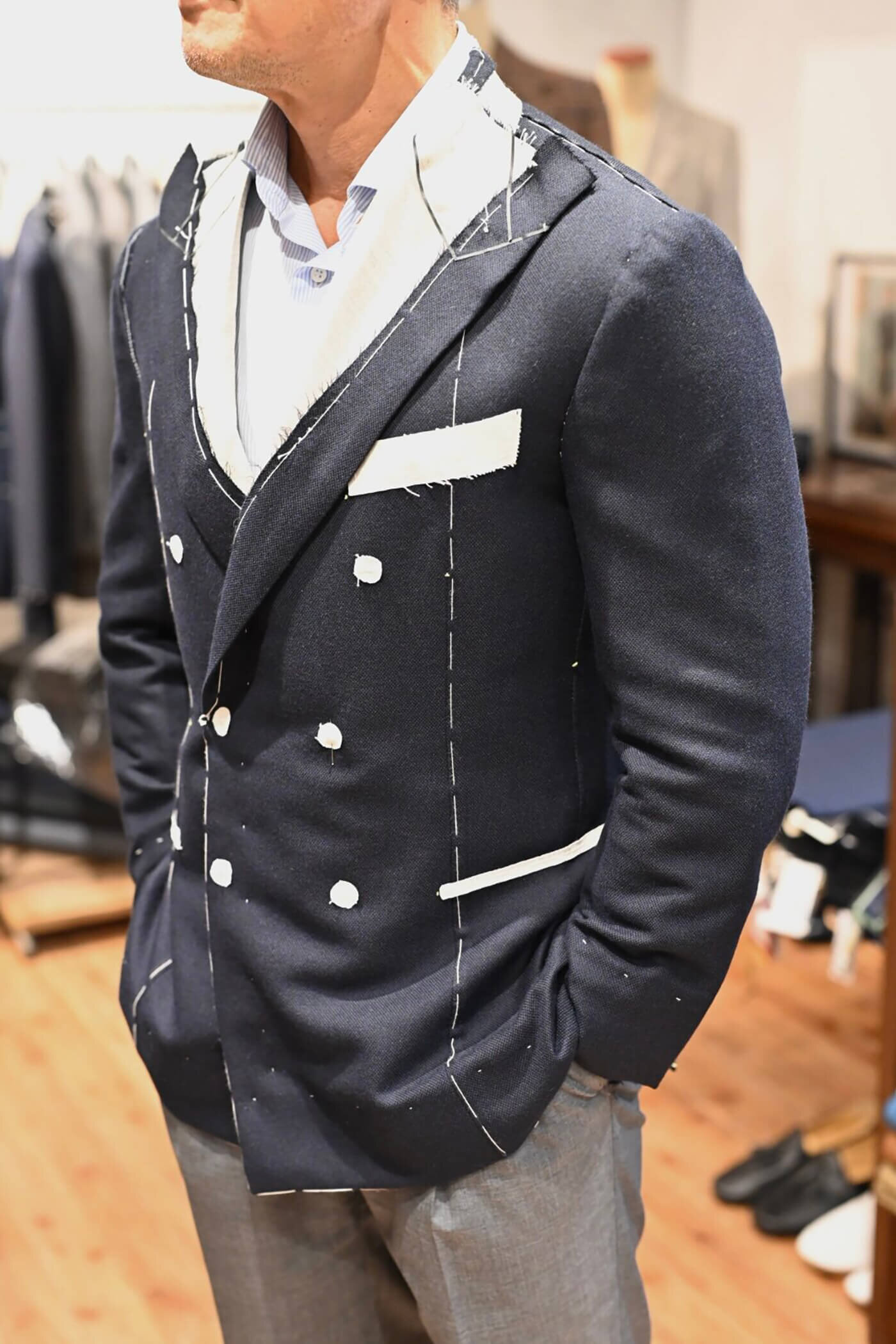 上の写真は1着目のダブルブレストでオーダーをいただきいたネイビージャケットの仮縫い。