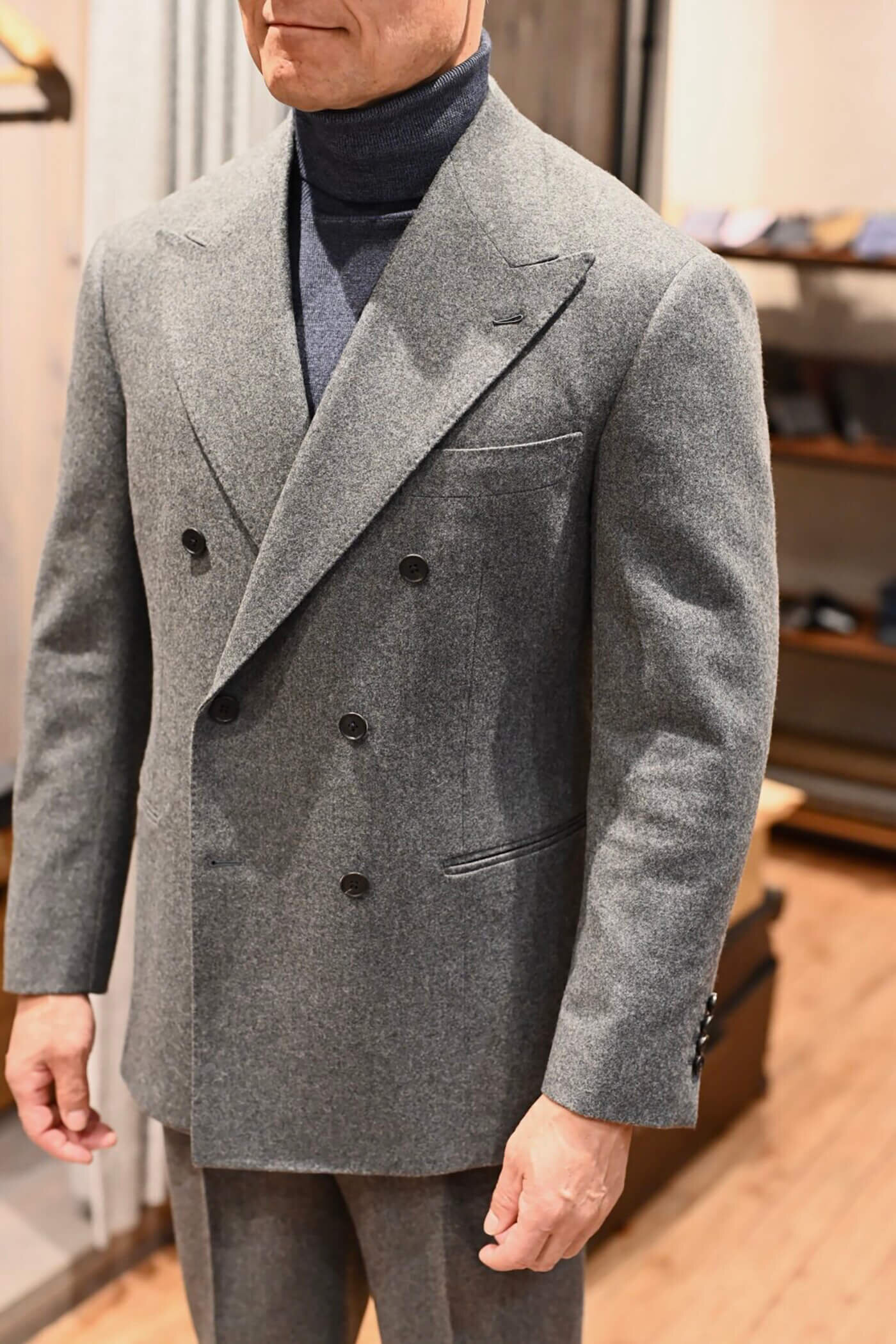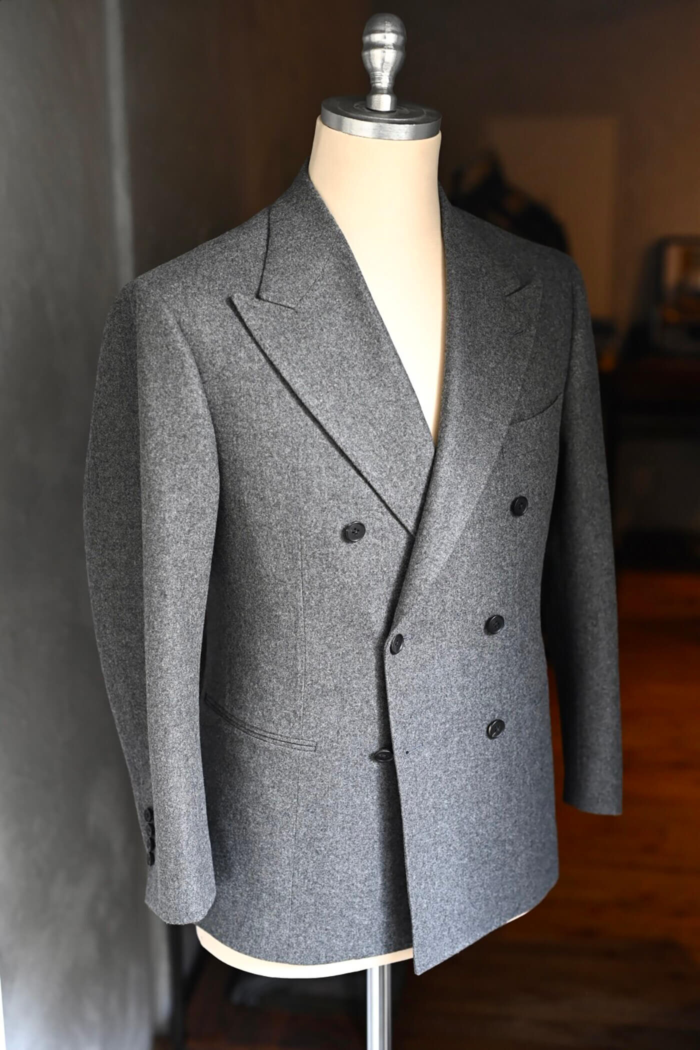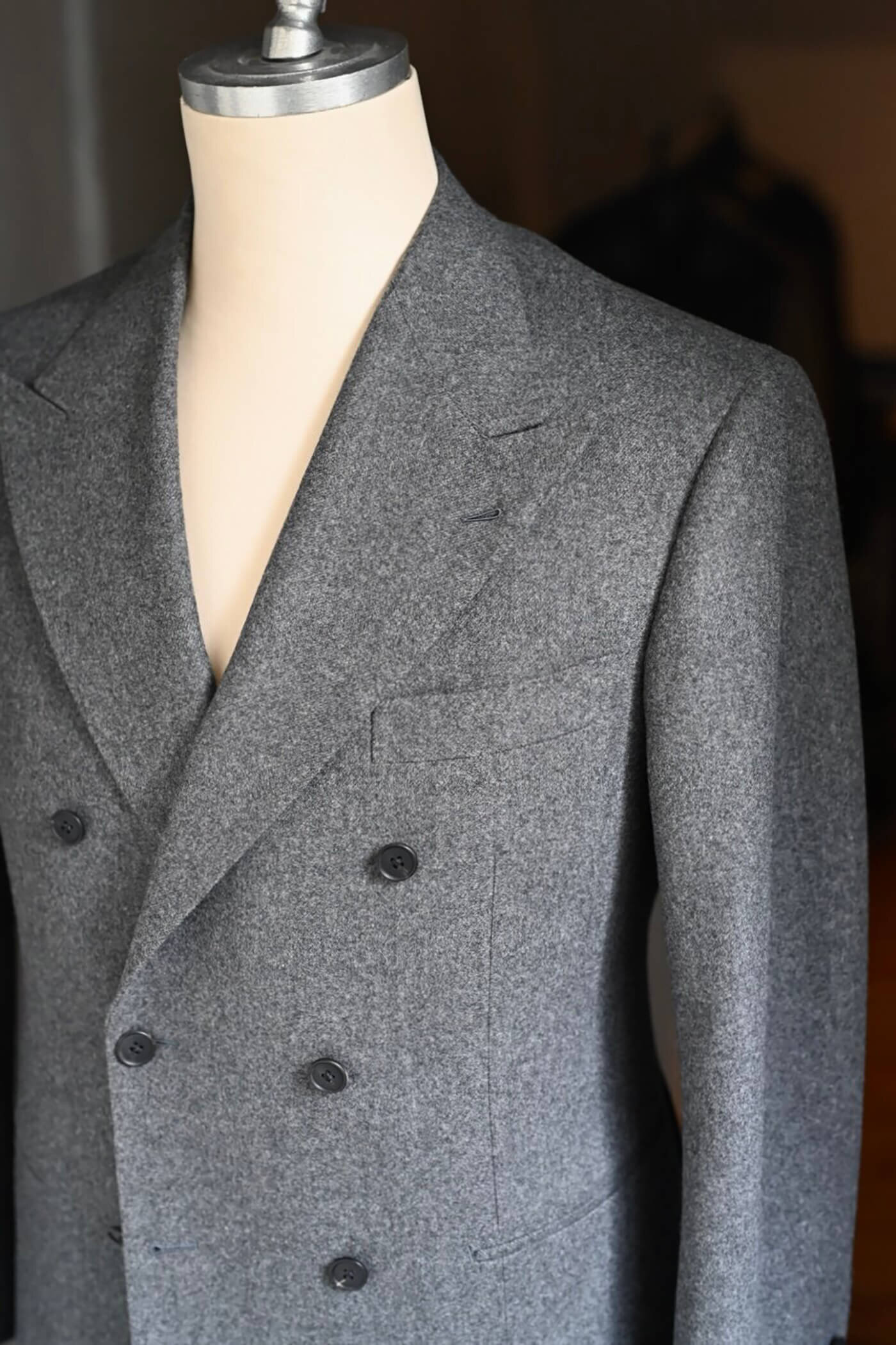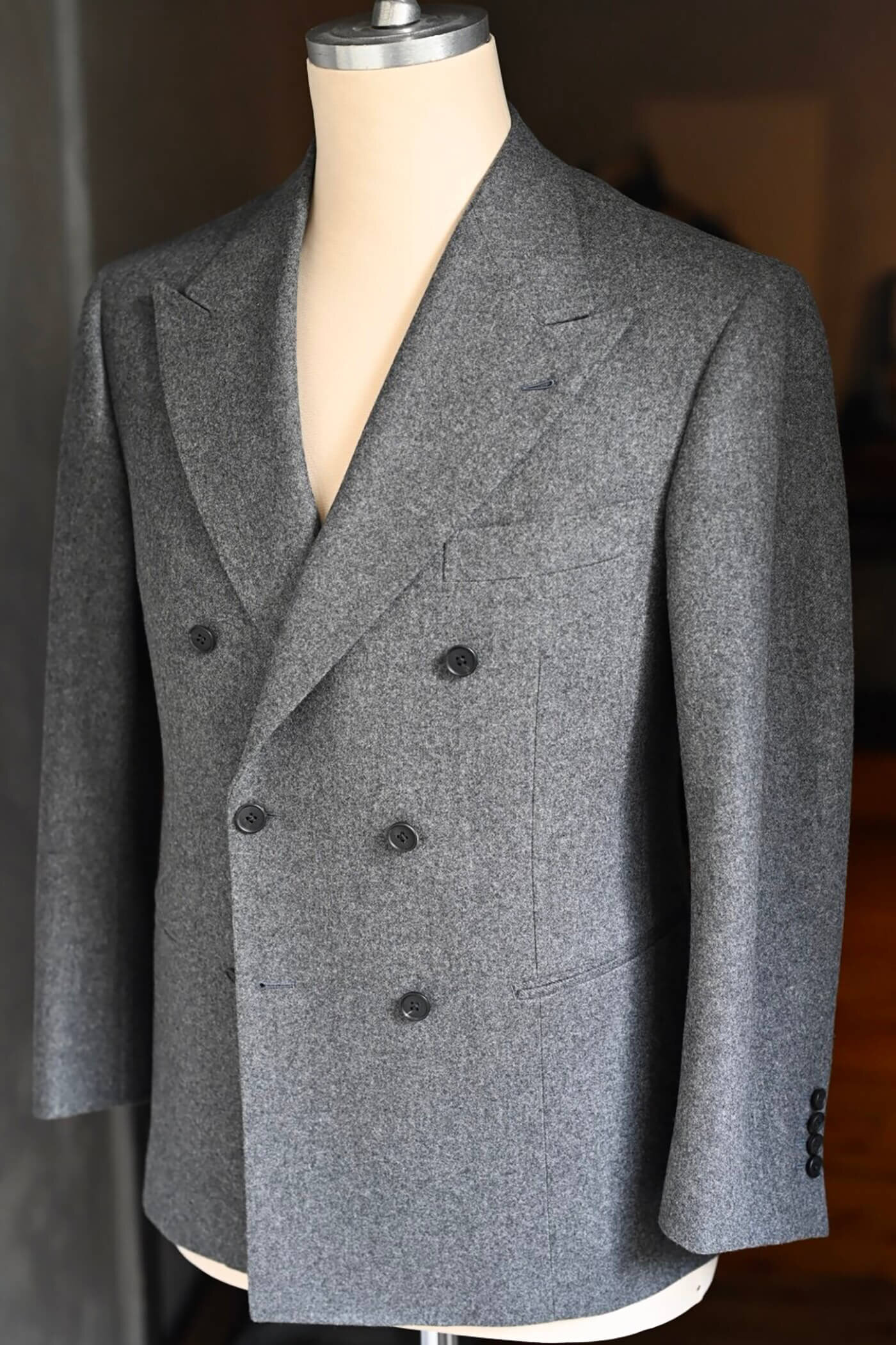 英国製らしい生地感、柔らかいグレーの色味、フランネルらしい杢感が魅力的なグレーフランネルで仕立てさせていただいたスーツが完成致しました。