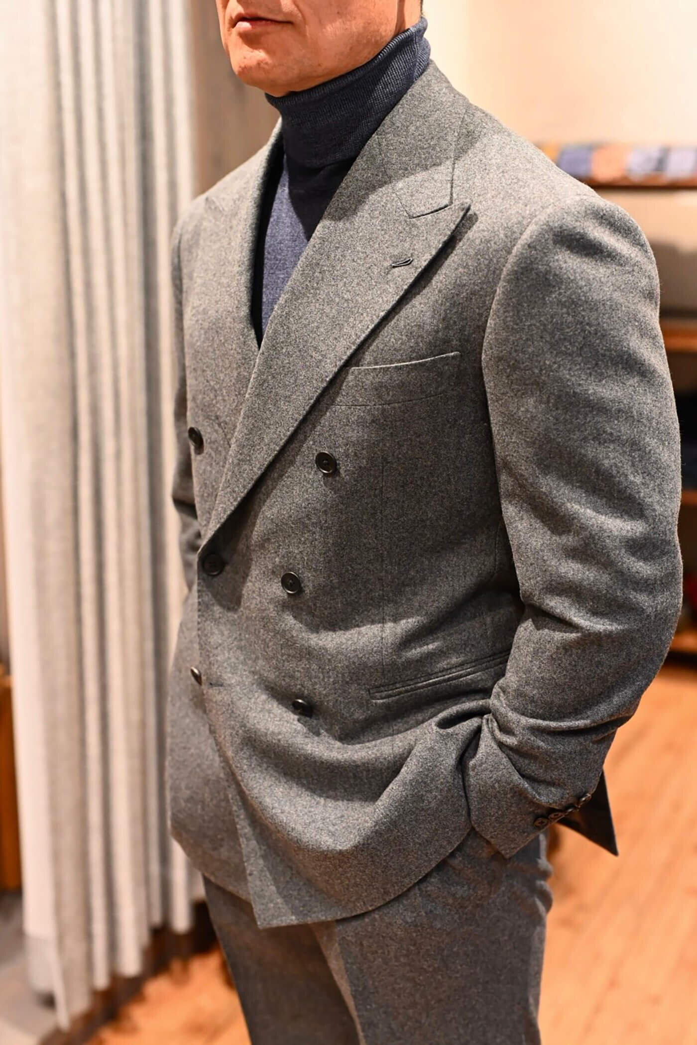 今まではビジネス用スーツやカジュアルジャケットを仕立てさせていただいておりましたが、今回お客様から頂いたお題は「カチッとしていないけどドレス感もあるフランネルスーツ」。