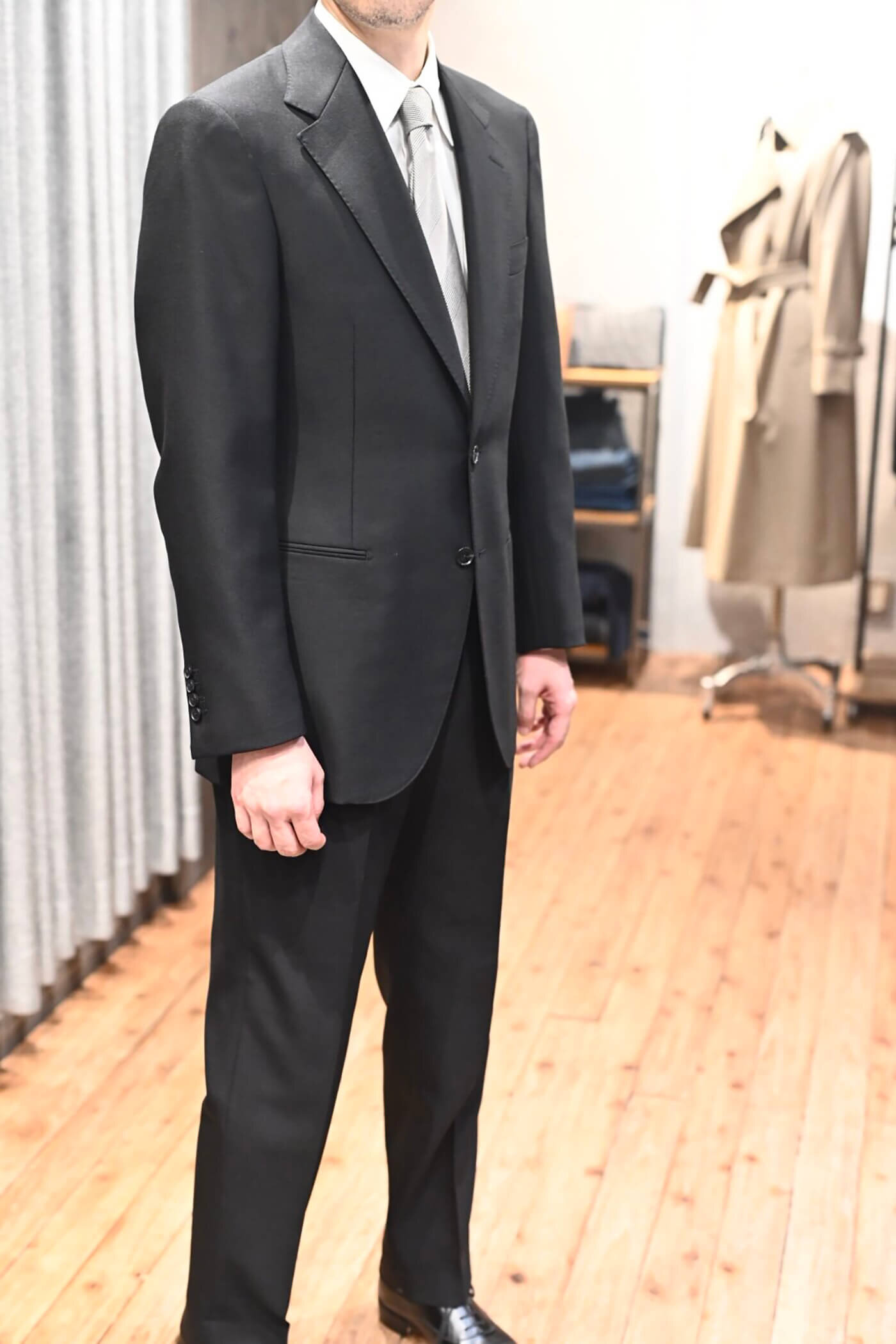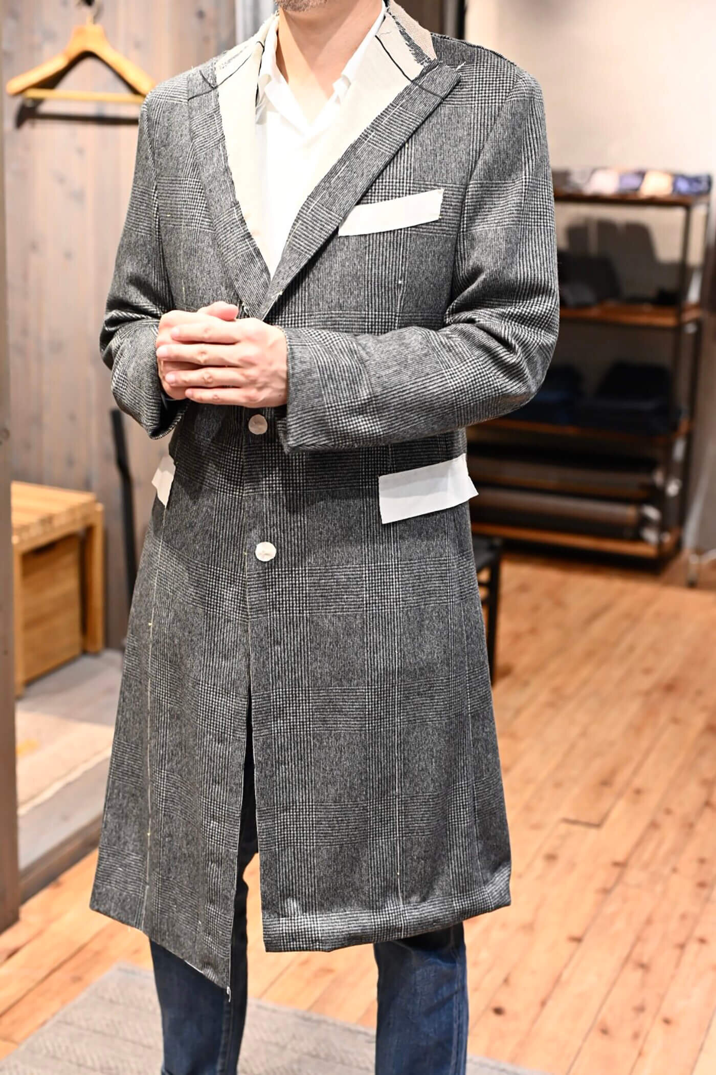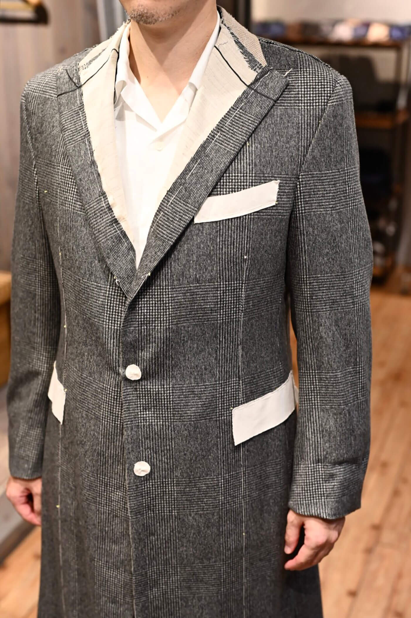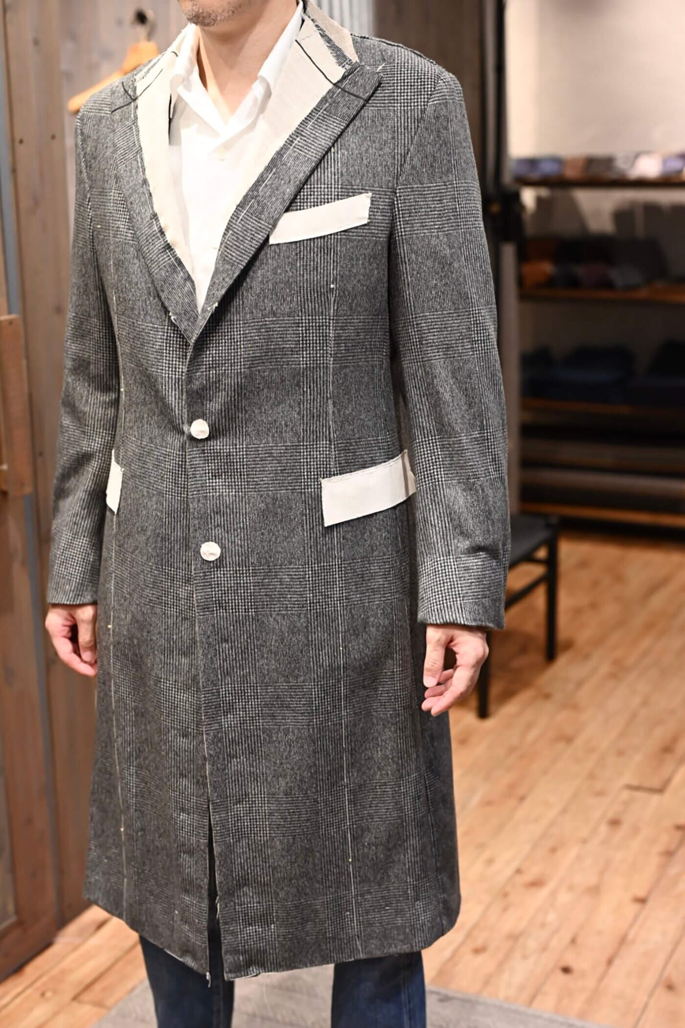上の写真のスーツはコートのオーダー前にご納品をさせていただいたものです、こちらのスーツの最新データを活かしてコートの設計をして仮縫いをご用意させていただきました。
