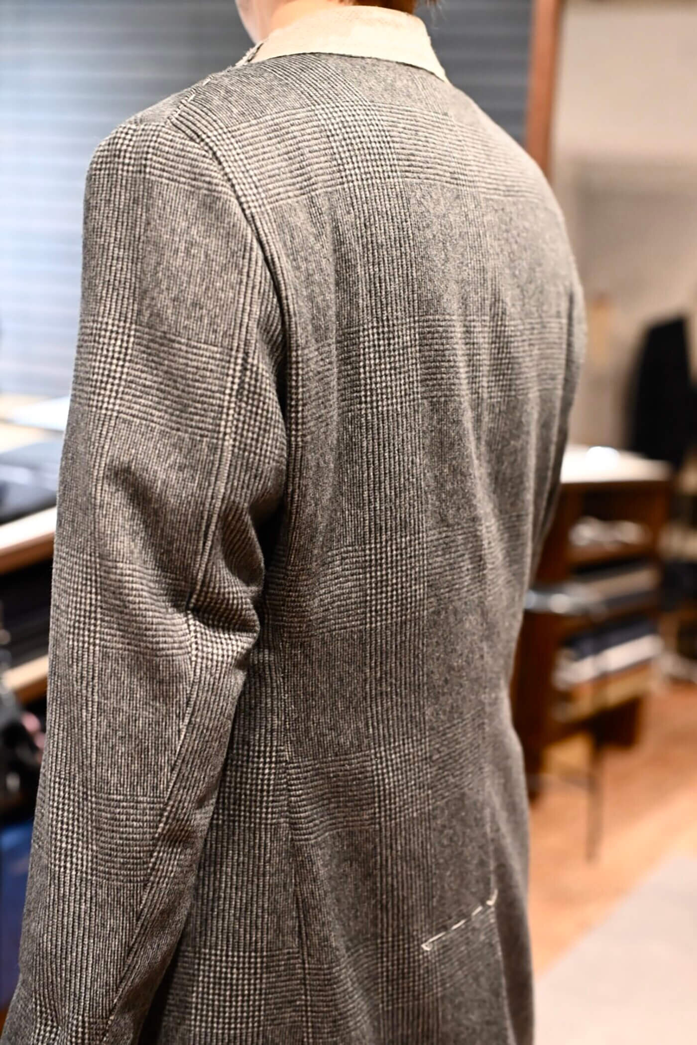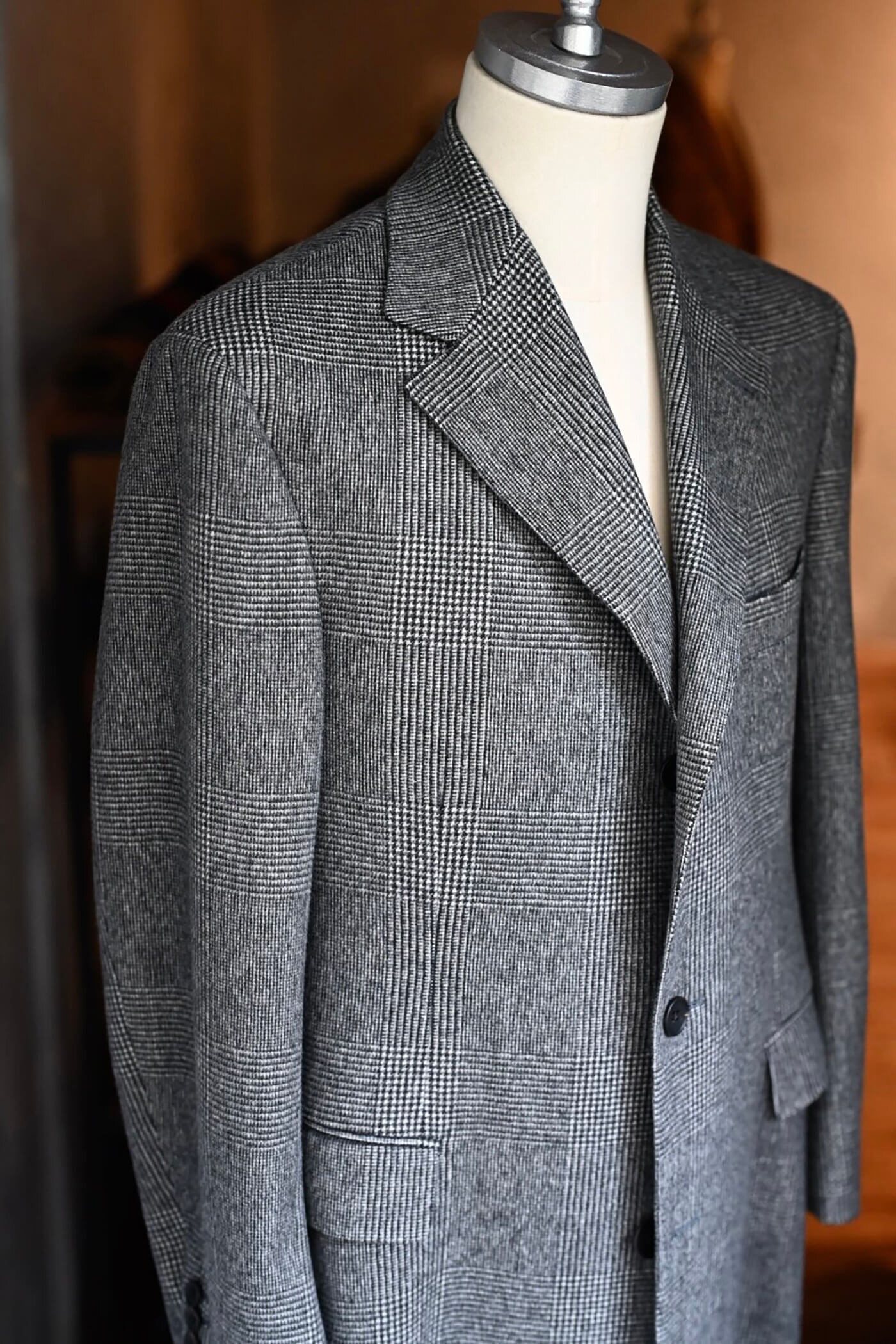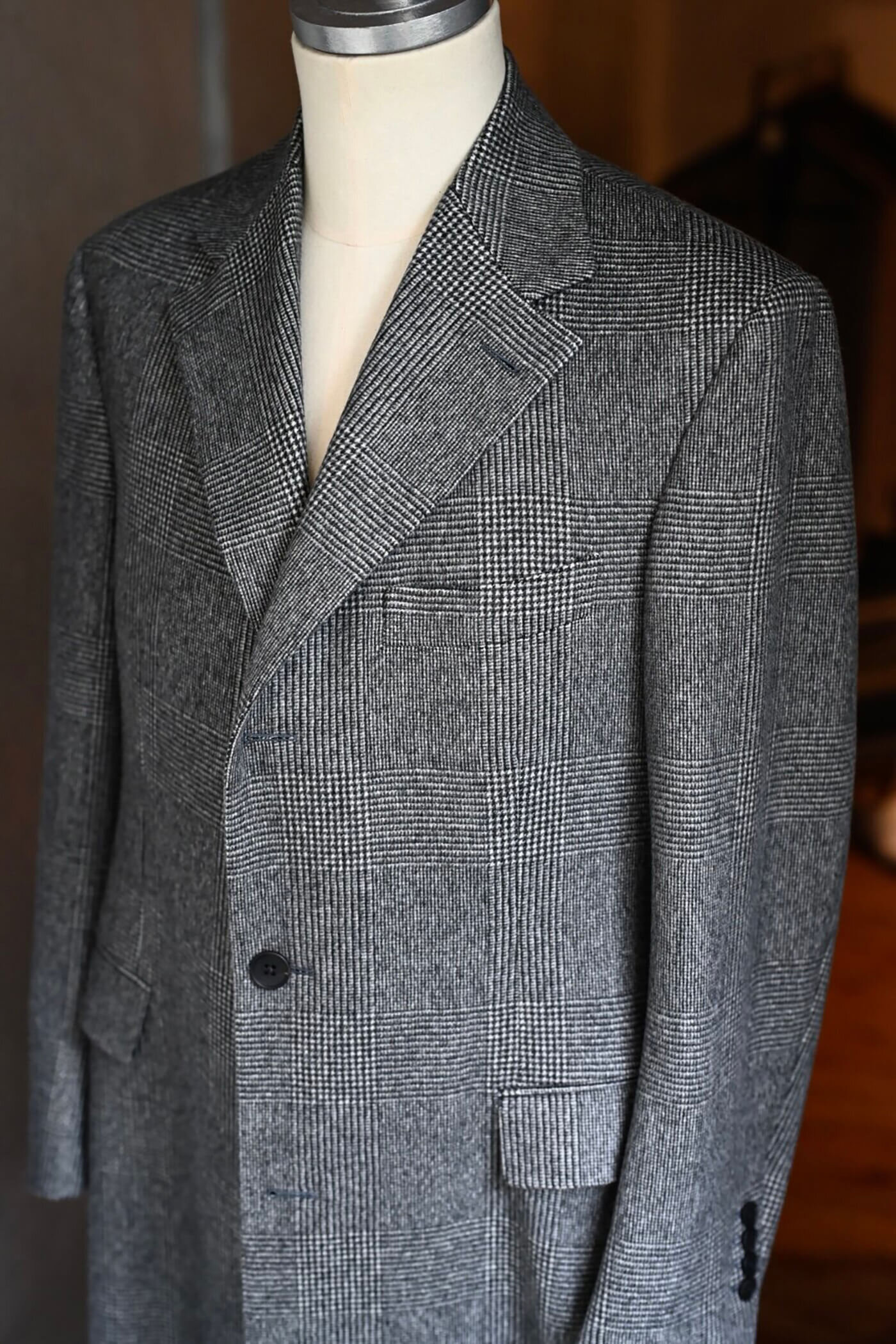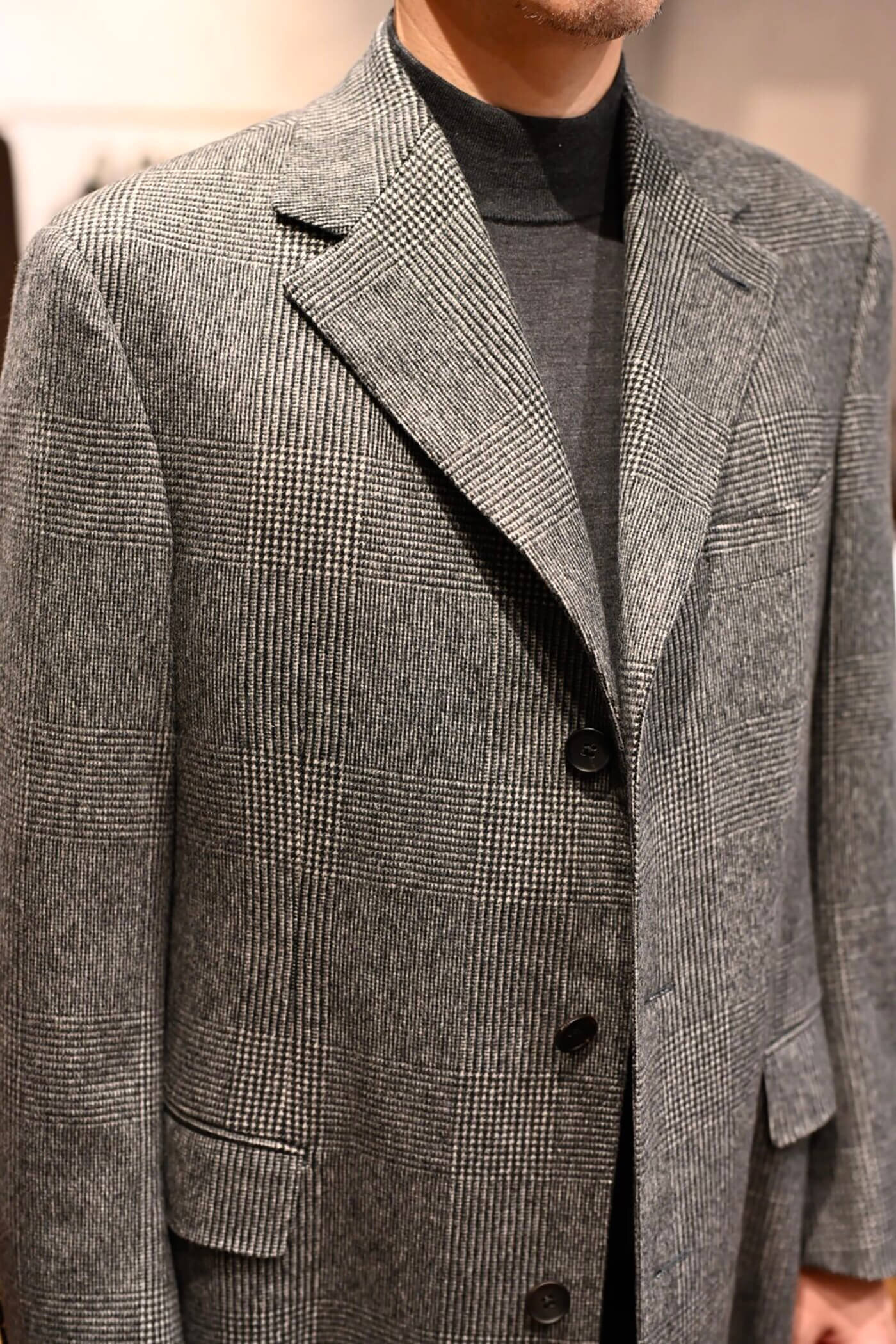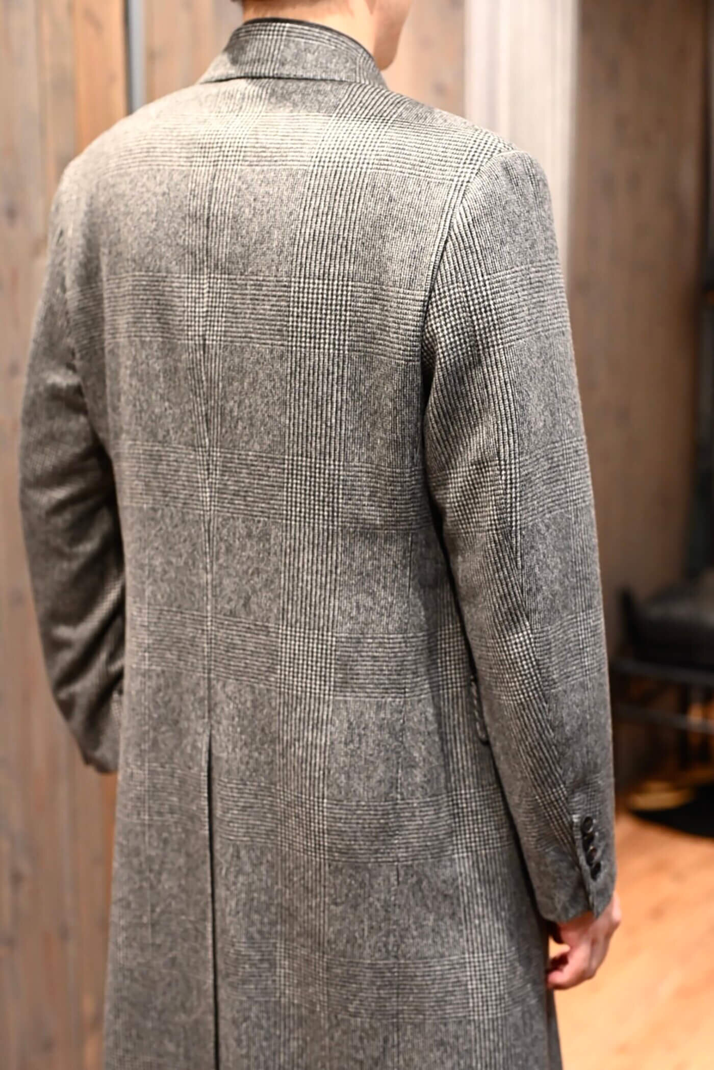 仕上がったコートを着用していただき、先ずはカシミヤの生地の上質感、そして美しいグレーの色味とグレンチェック柄のバランスの良さを確認していただき、最終のフィッティングチェックをさせていただきました。