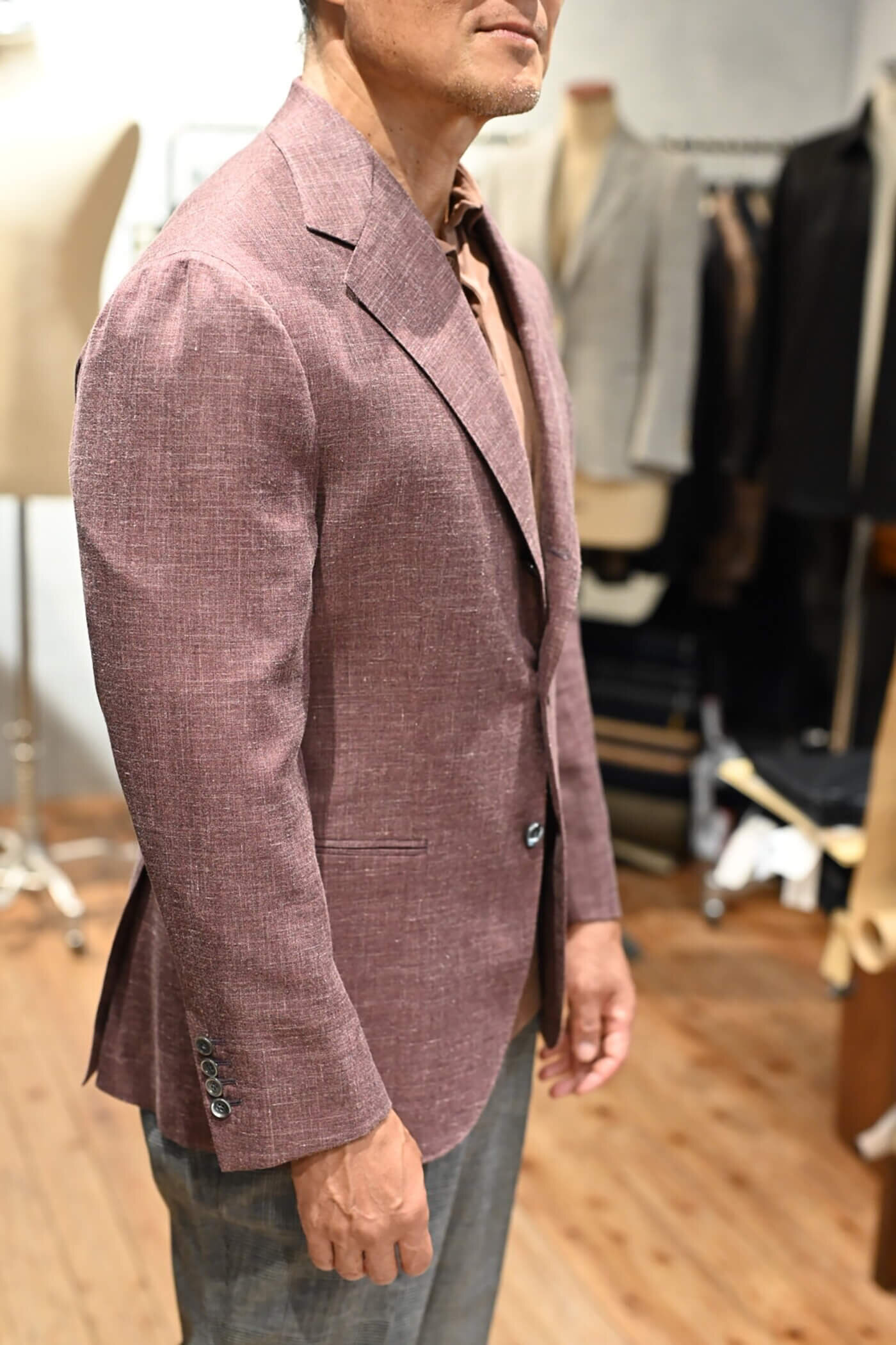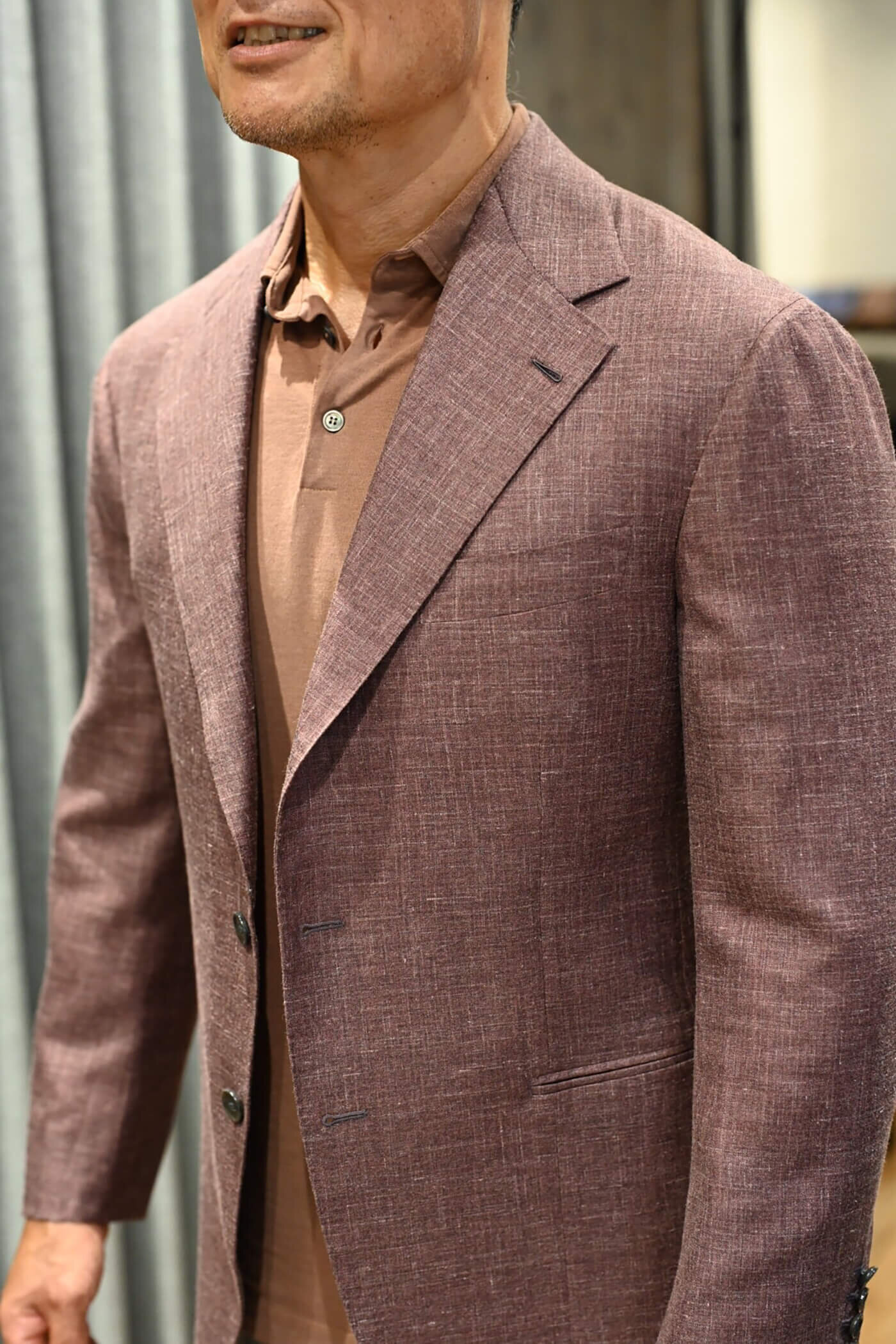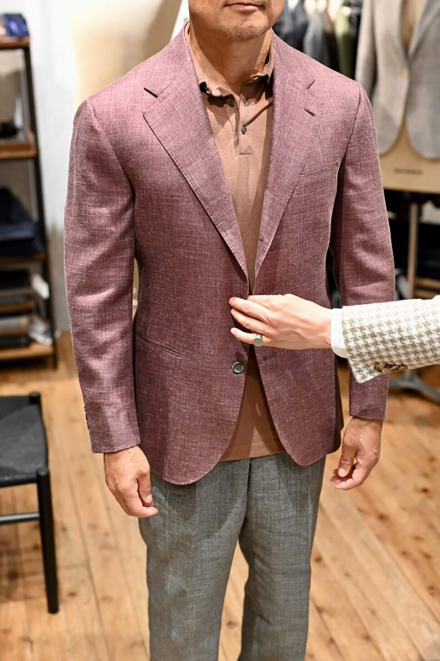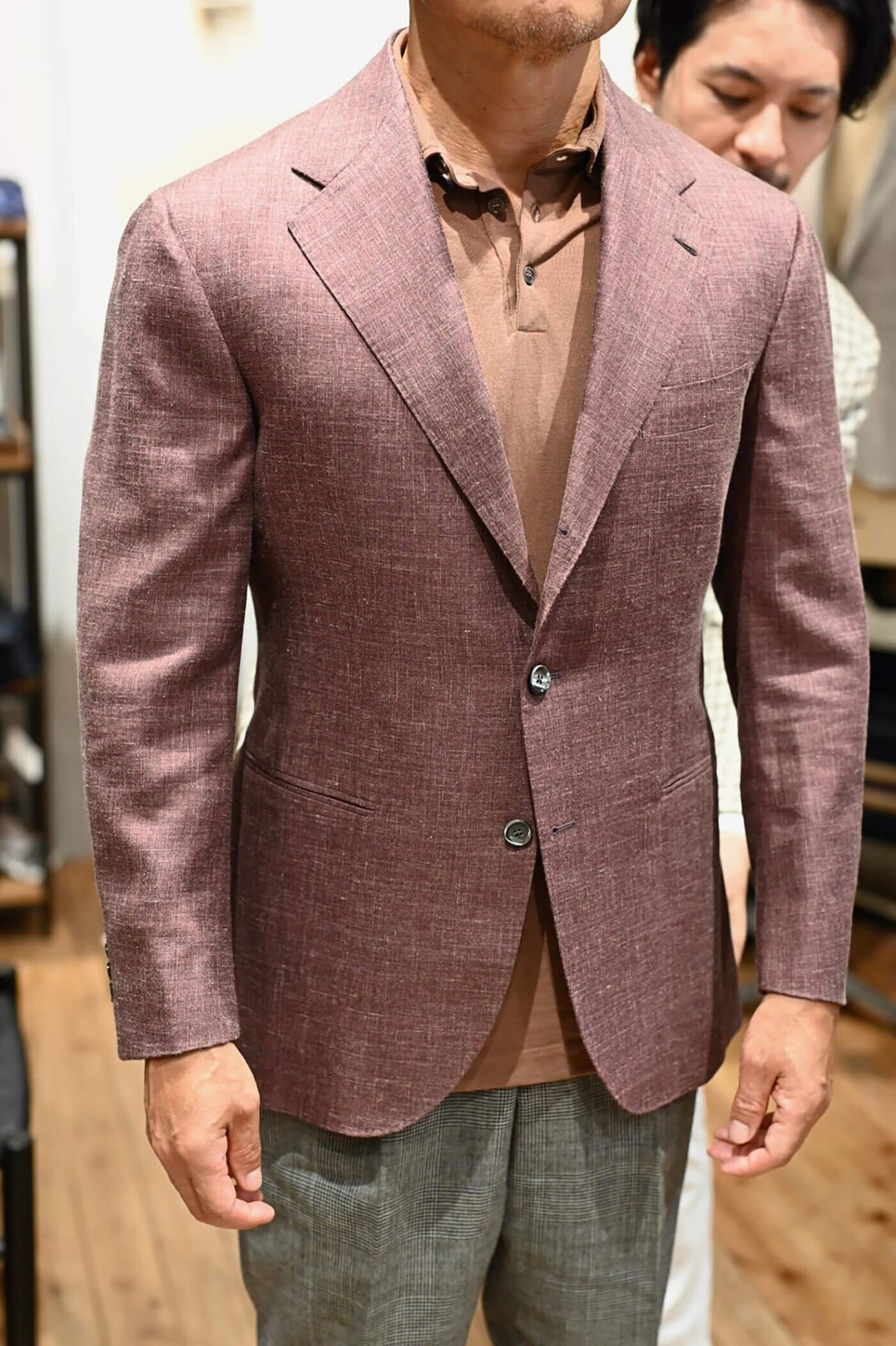カシミヤの扱いを得意とするピアチェンツァだからこそ実現できる生地の風合い、カシミヤ3者混らしい色合いの美しさと艶感、これらの魅力的な要素がお客様が期待されるジャケットスタイルに適していると思い私からお客様にお薦めさせていただました。