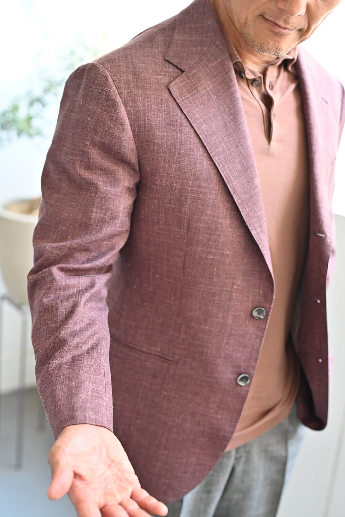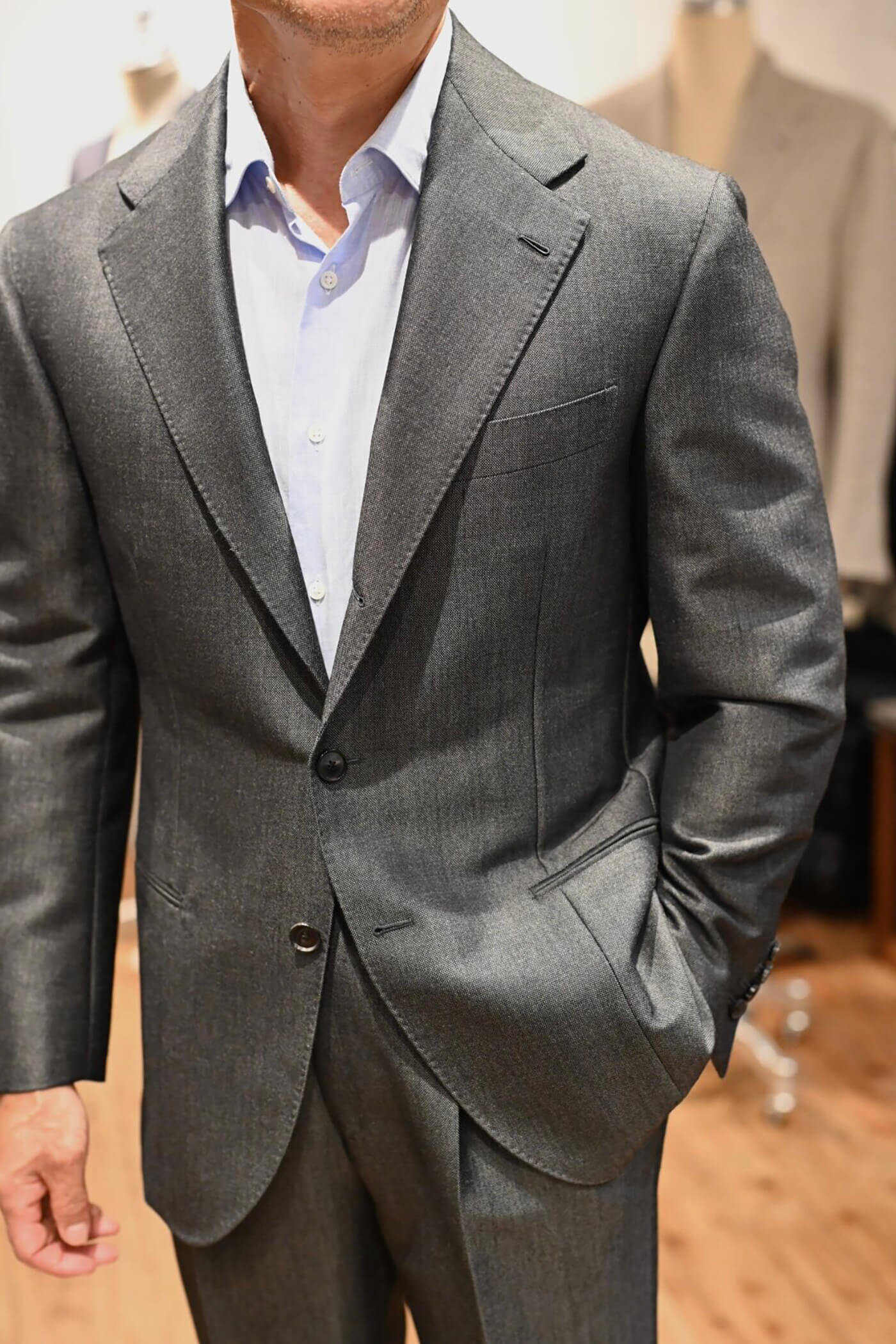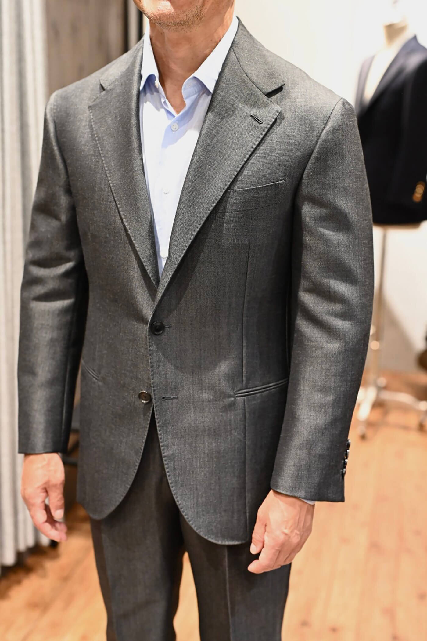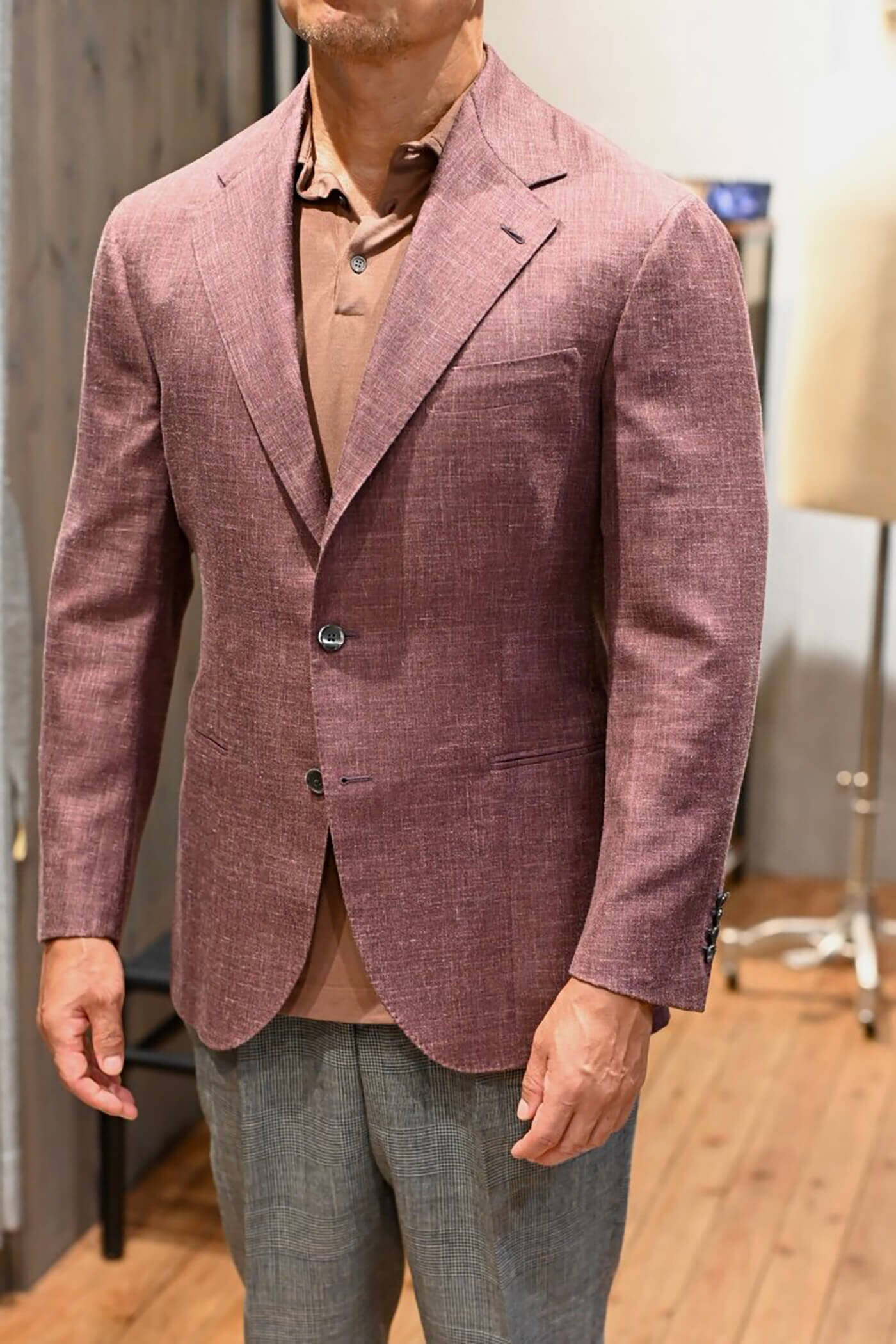 カシミヤの扱いを得意とするピアチェンツァだからこそ実現できる生地の風合い、カシミヤ3者混らしい色合いの美しさと艶感、これらの魅力的な要素がお客様が期待されるジャケットスタイルに適していると思い私からお客様にお薦めさせていただました。