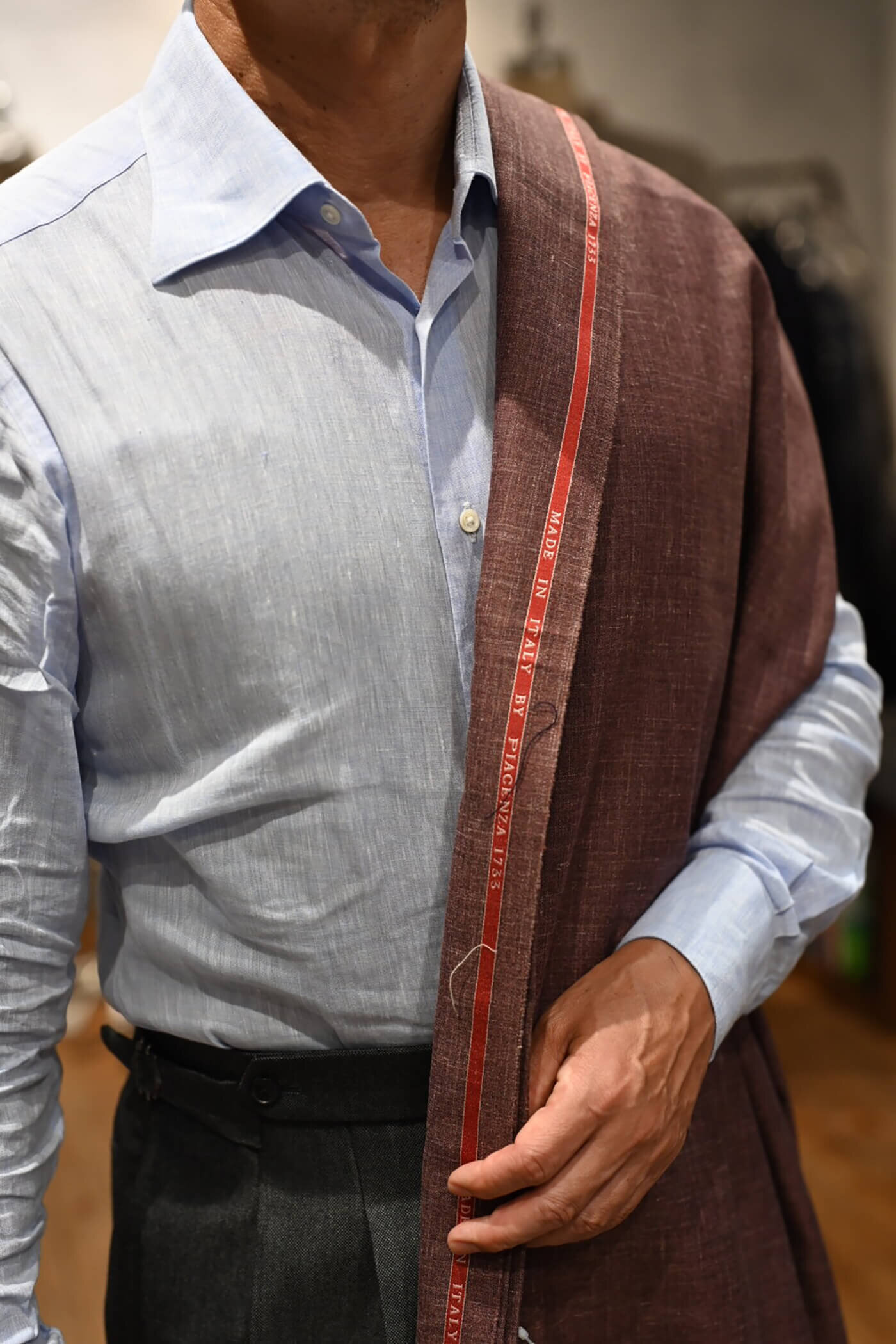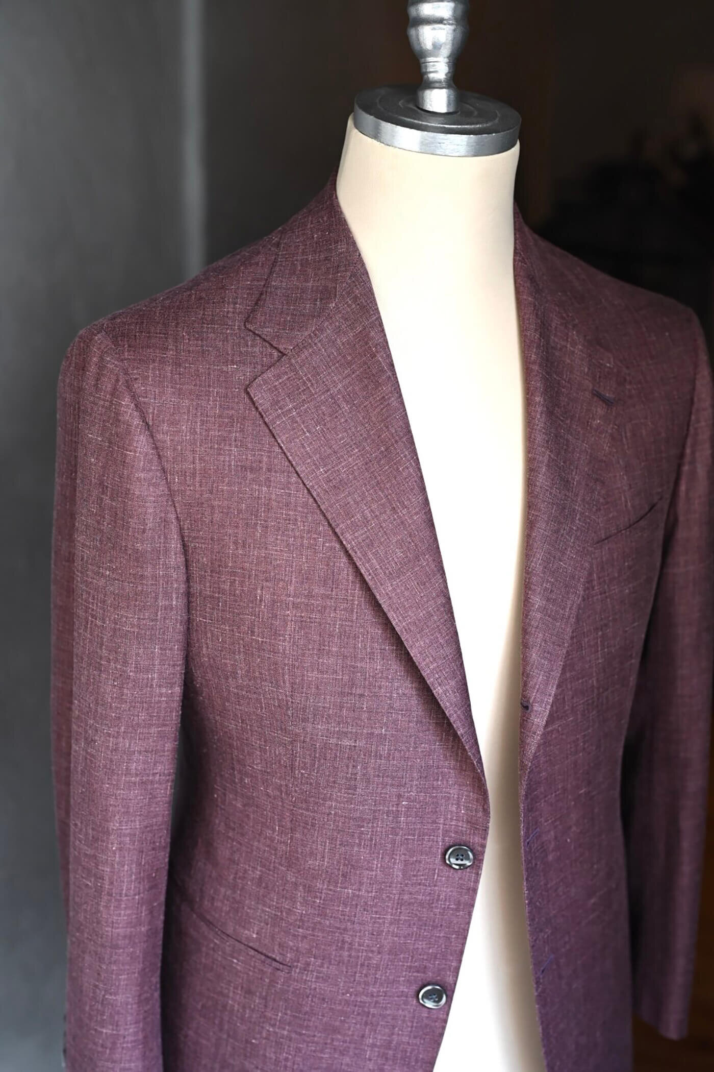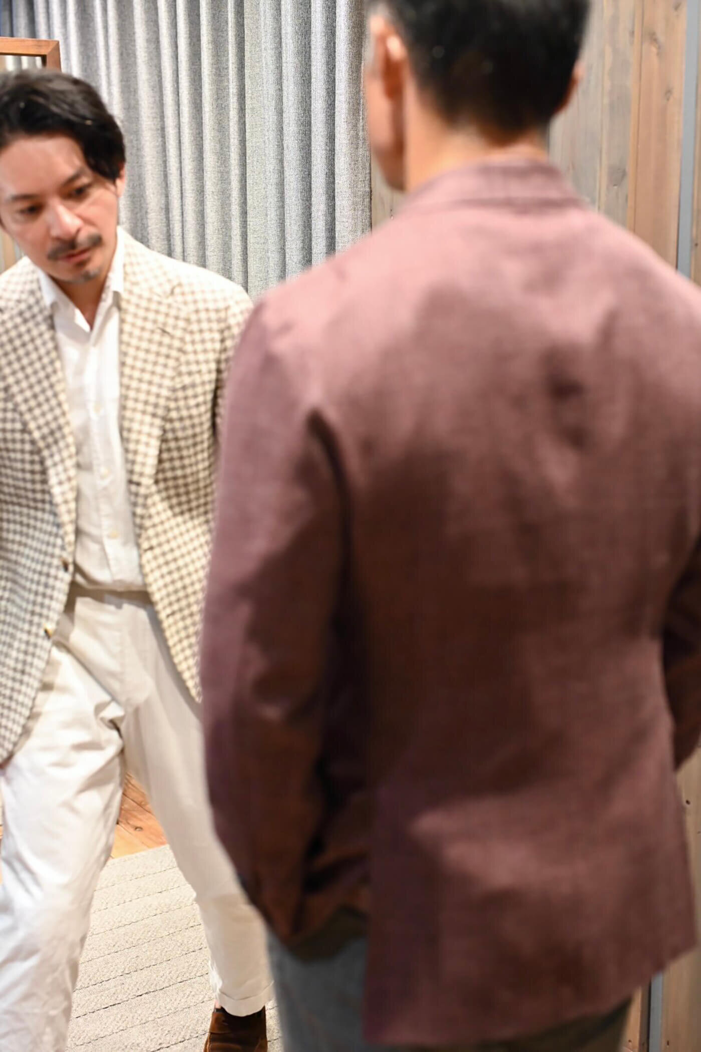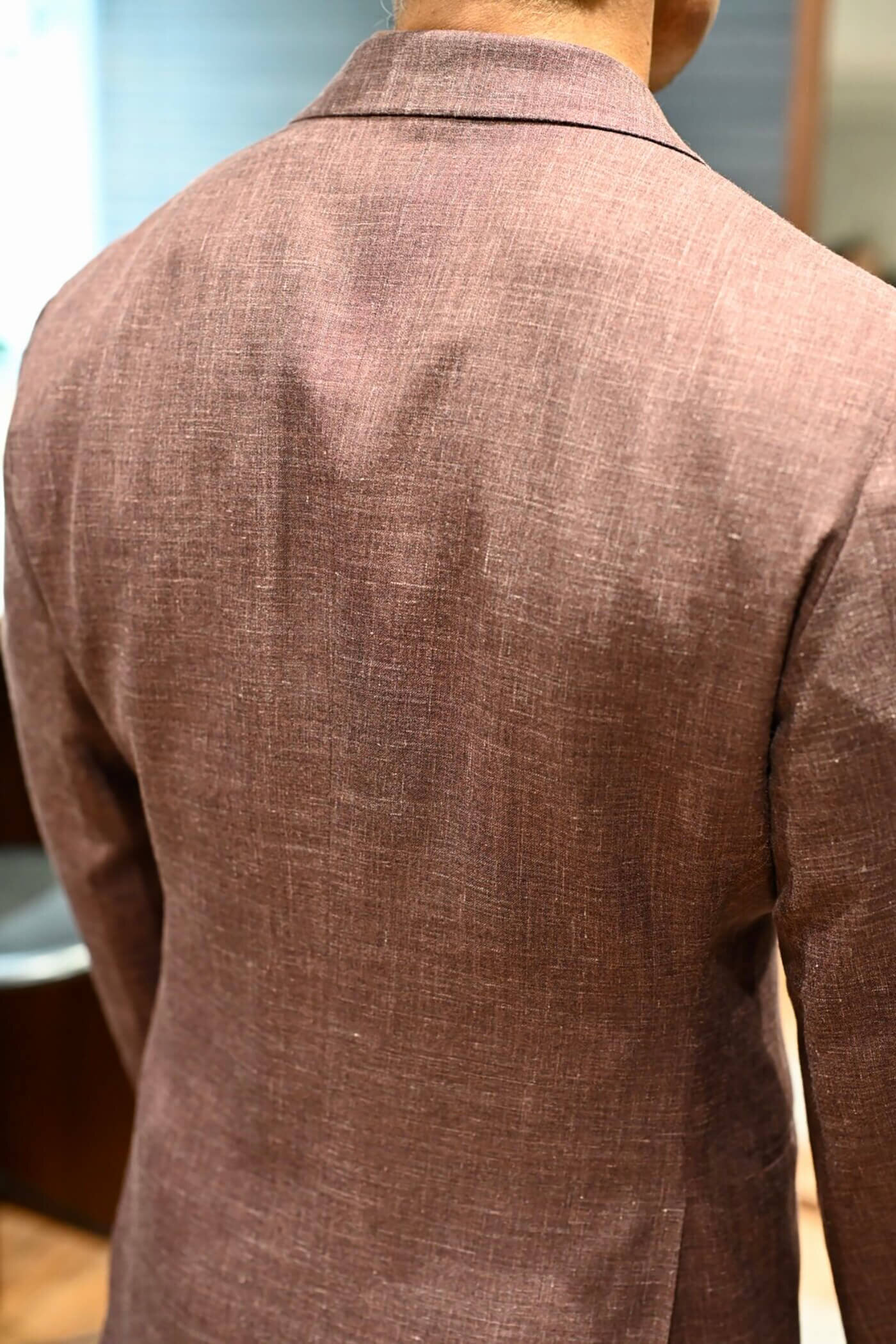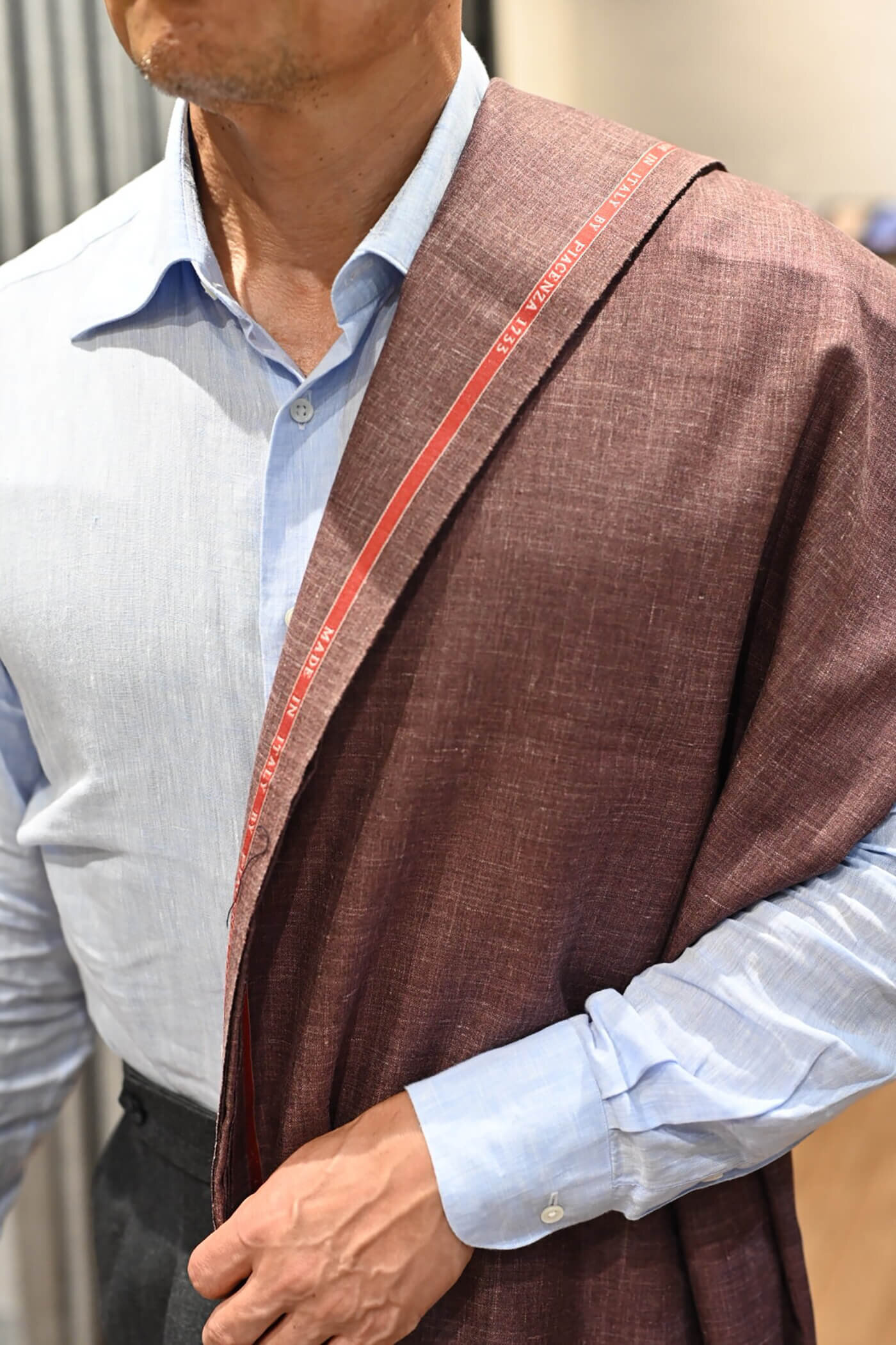 カシミヤの扱いを得意とするピアチェンツァだからこそ実現できる生地の風合い、カシミヤ3者混らしい色合いの美しさと艶感、これらの魅力的な要素がお客様が期待されるジャケットスタイルに適していると思い私からお客様にお薦めさせていただました。