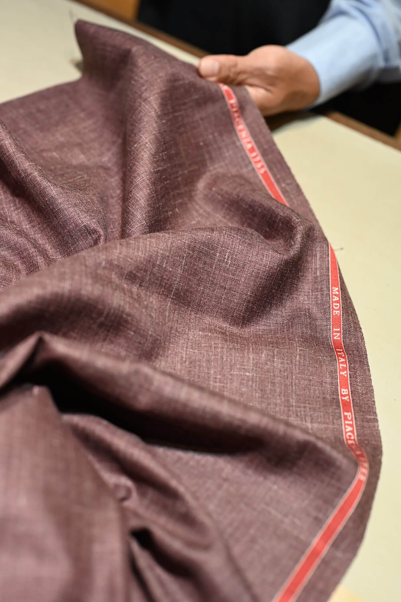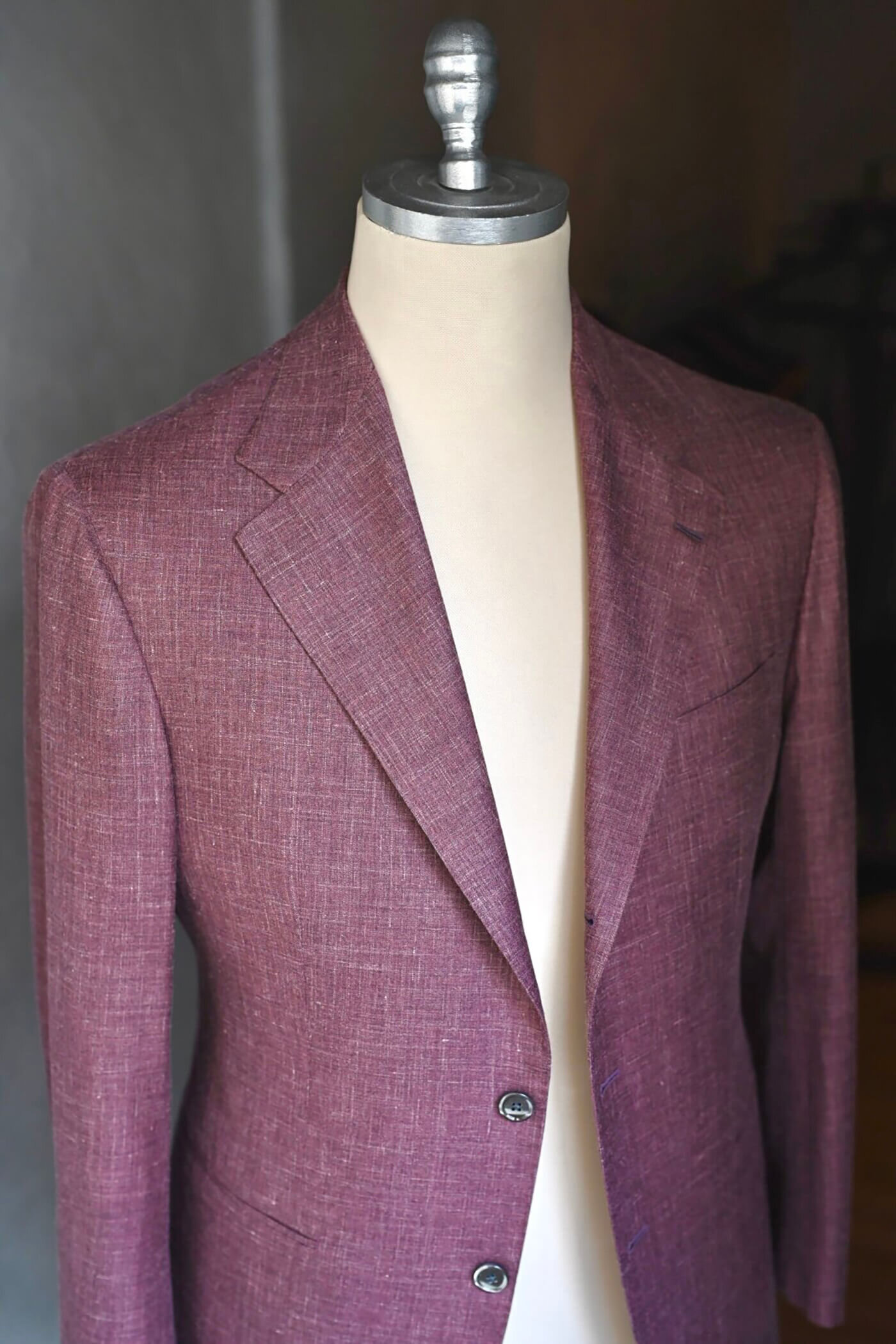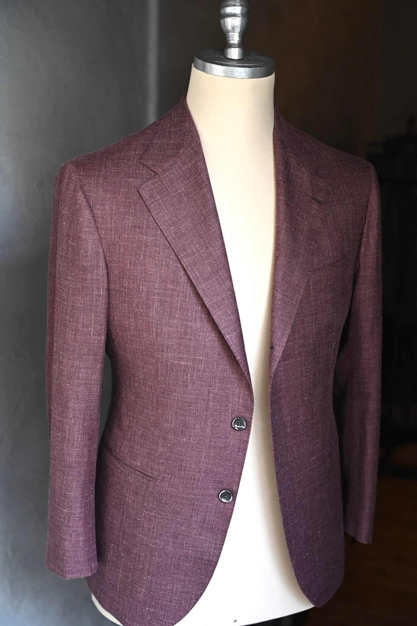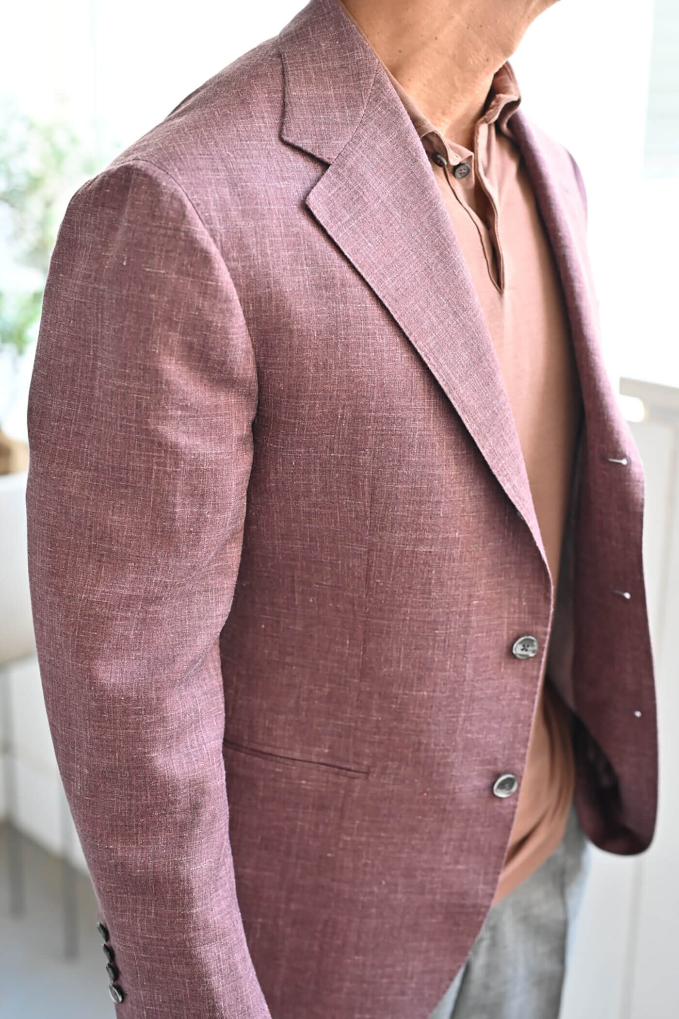 カシミヤの扱いを得意とするピアチェンツァだからこそ実現できる生地の風合い、カシミヤ3者混らしい色合いの美しさと艶感、これらの魅力的な要素がお客様が期待されるジャケットスタイルに適していると思い私からお客様にお薦めさせていただました。