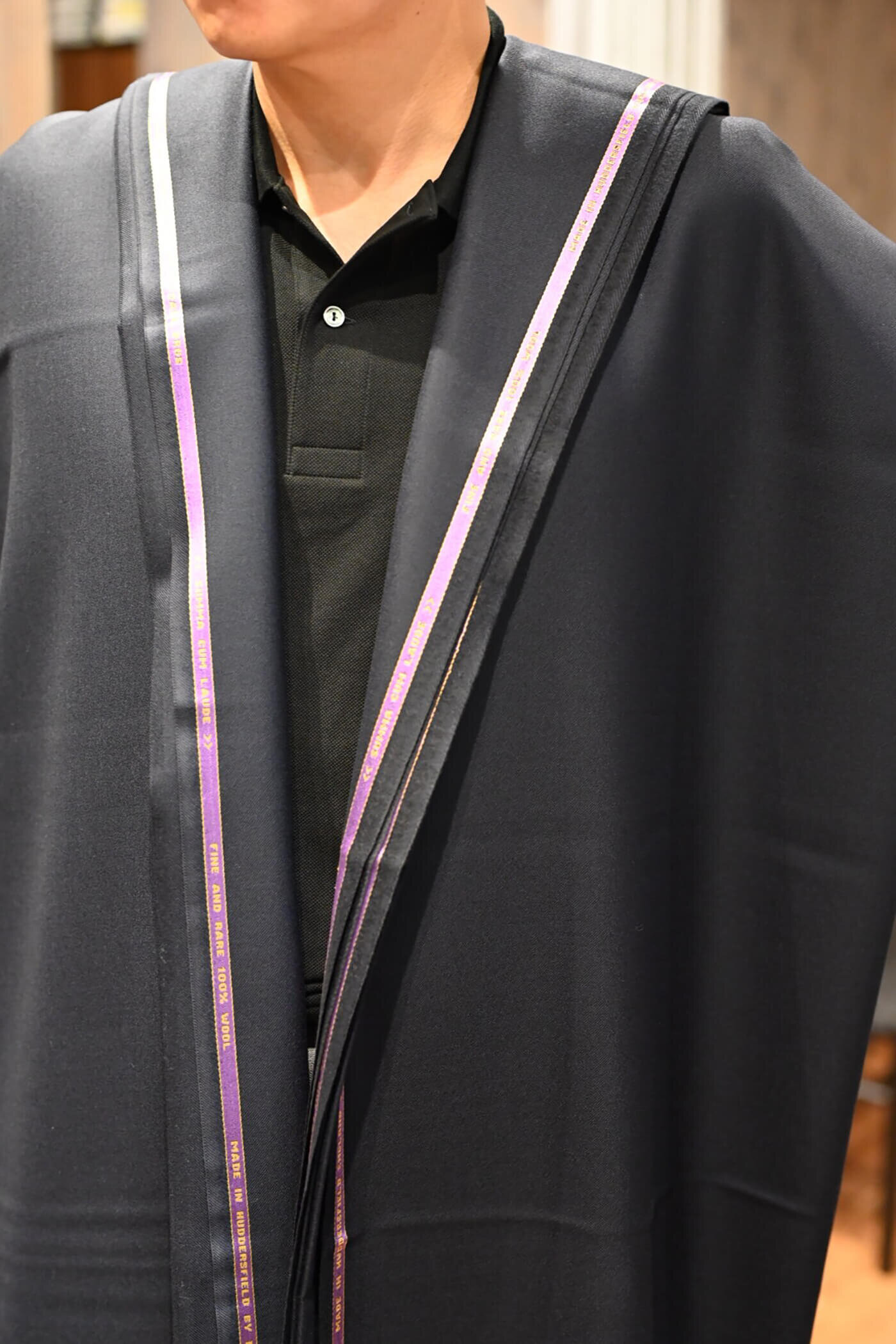 お客様から頂戴したオーダーアイテムの素材選びから仕上がりまでの過程について、"Dugdale Bros&CoのSUMMA CUM LAUDE (スンマ クム ラウデ)"でオーダーを頂戴したネイビーツーピーススーツを一例にご説明をさせていただきます。