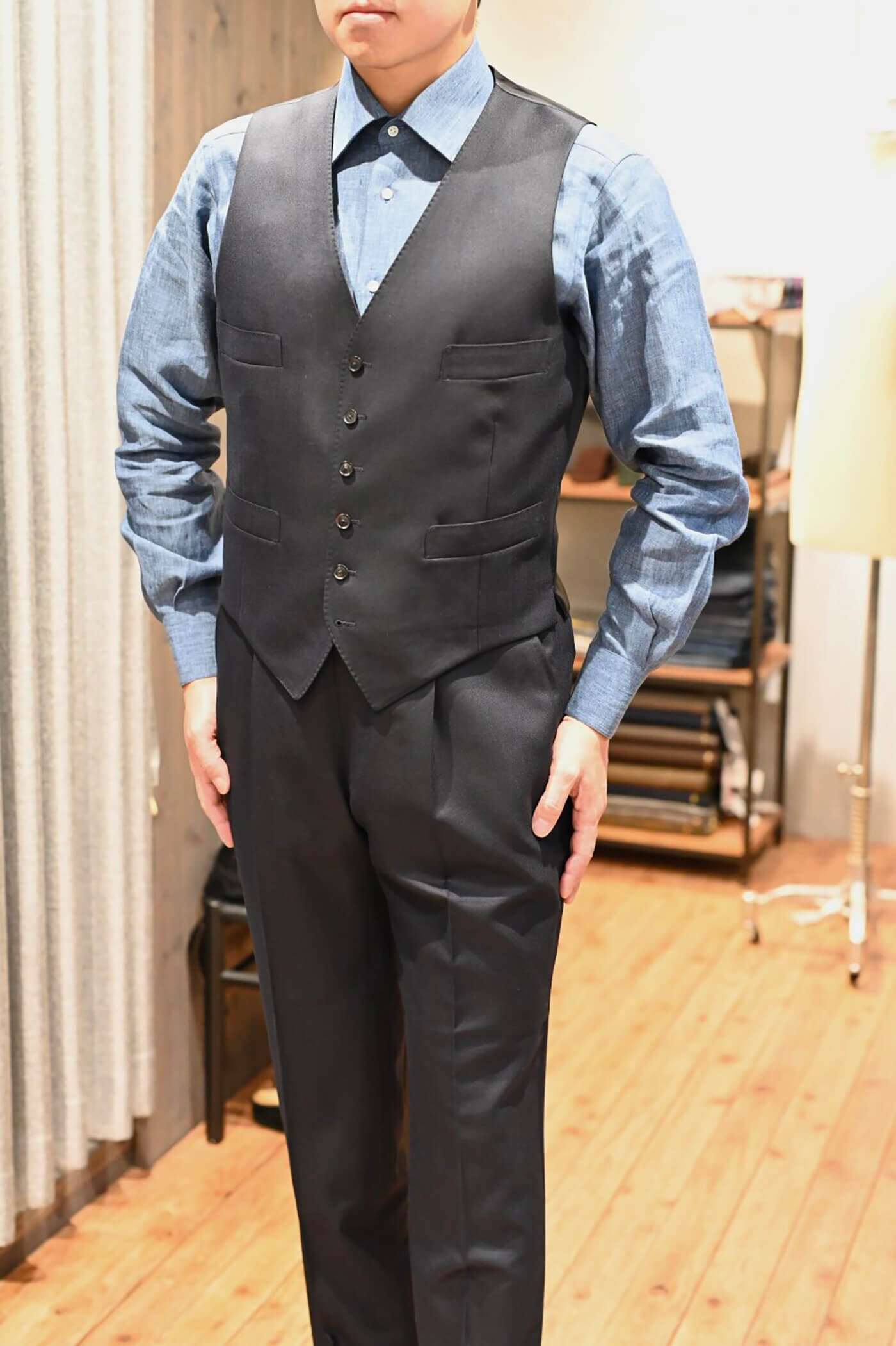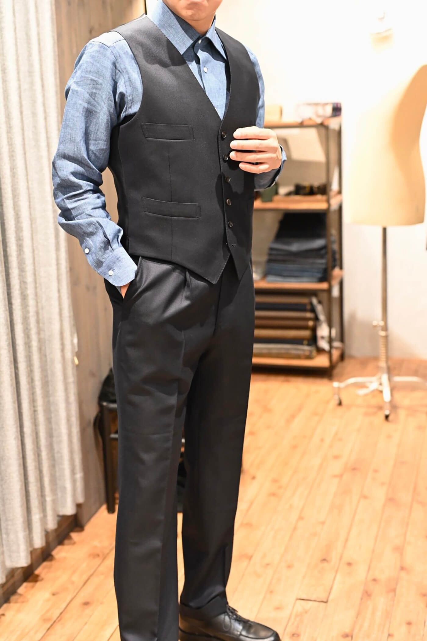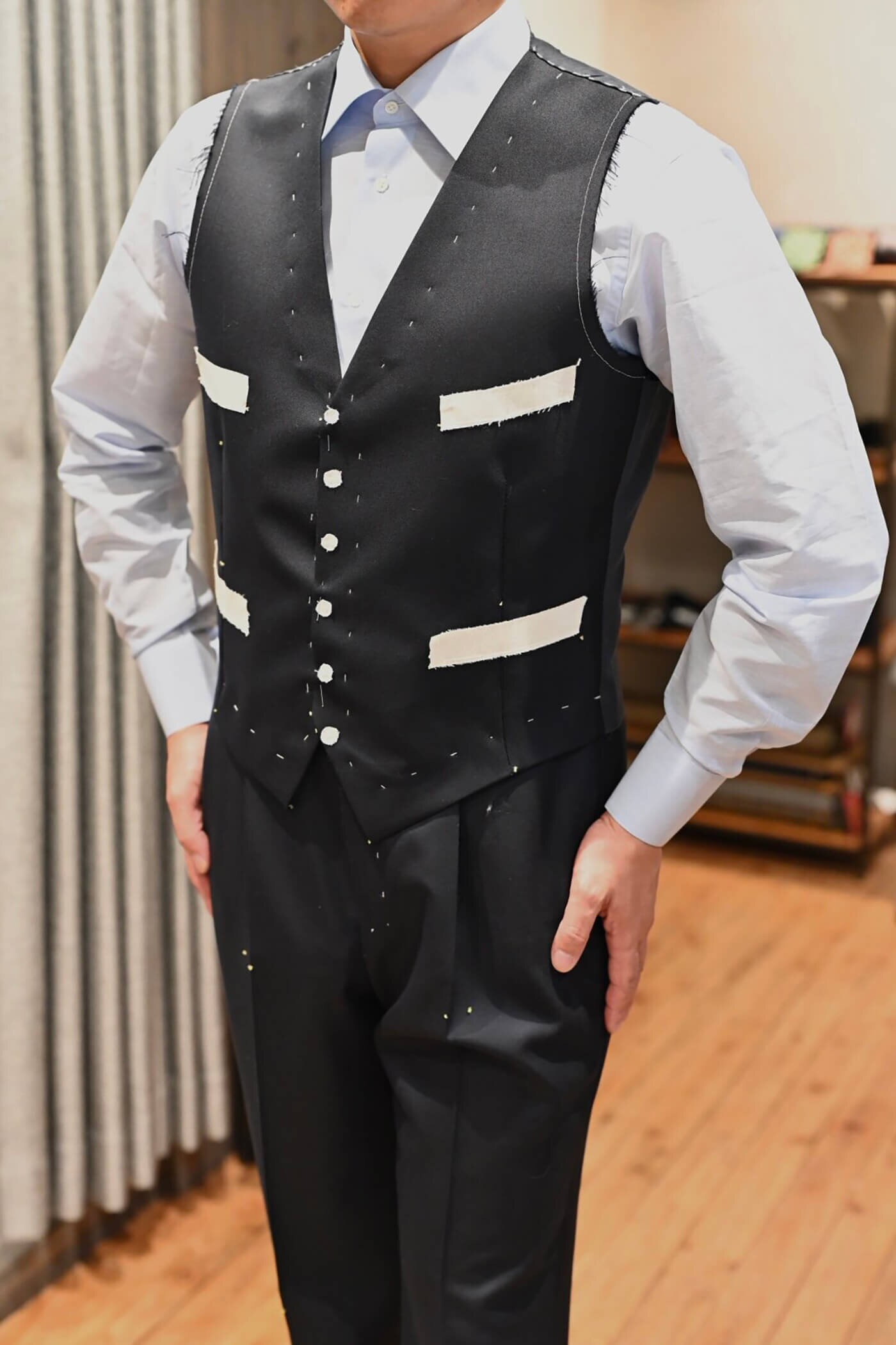 ベストは4ポケットのドレッシーなスタイルで仕立てさせていただきました。
