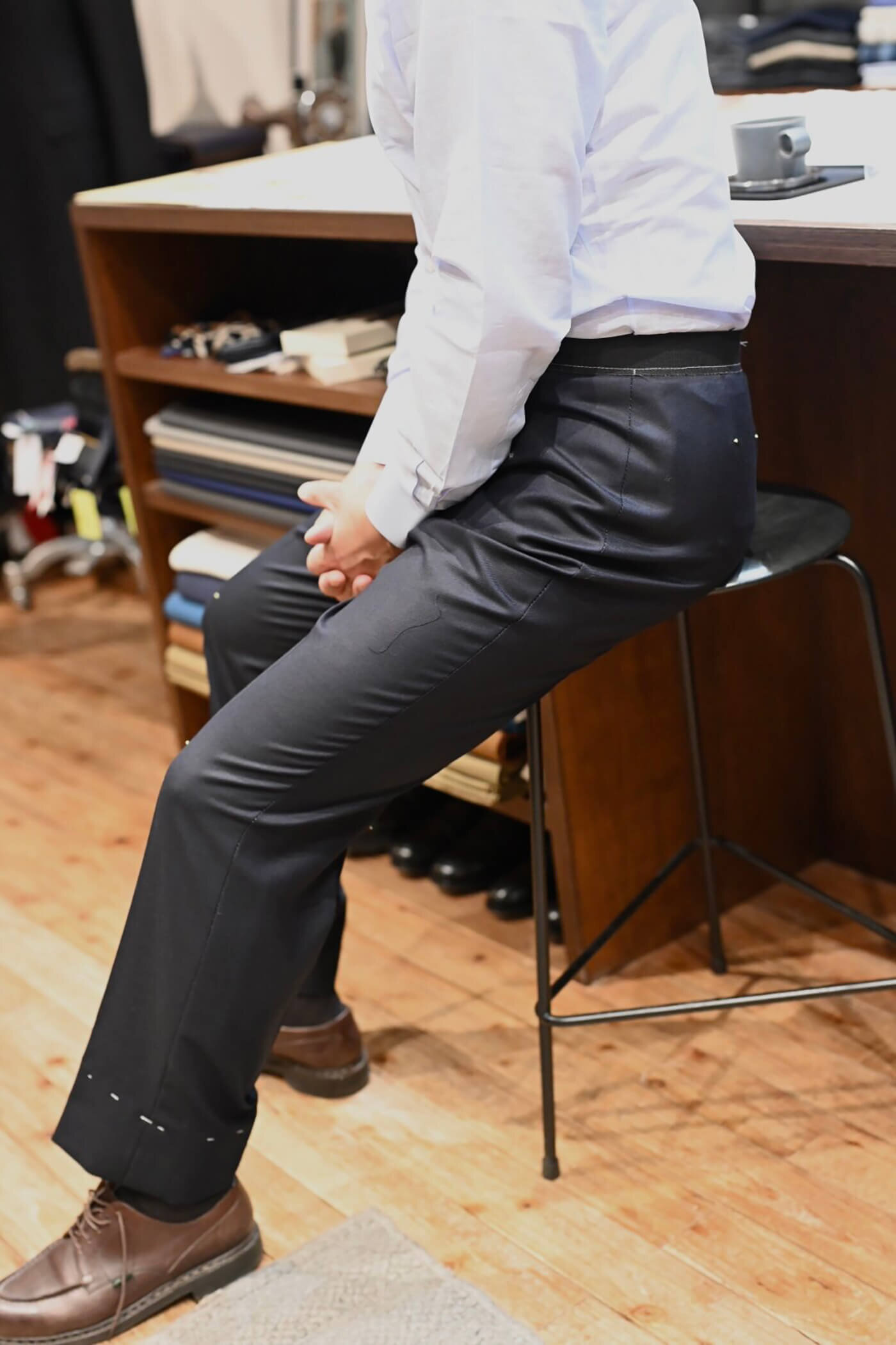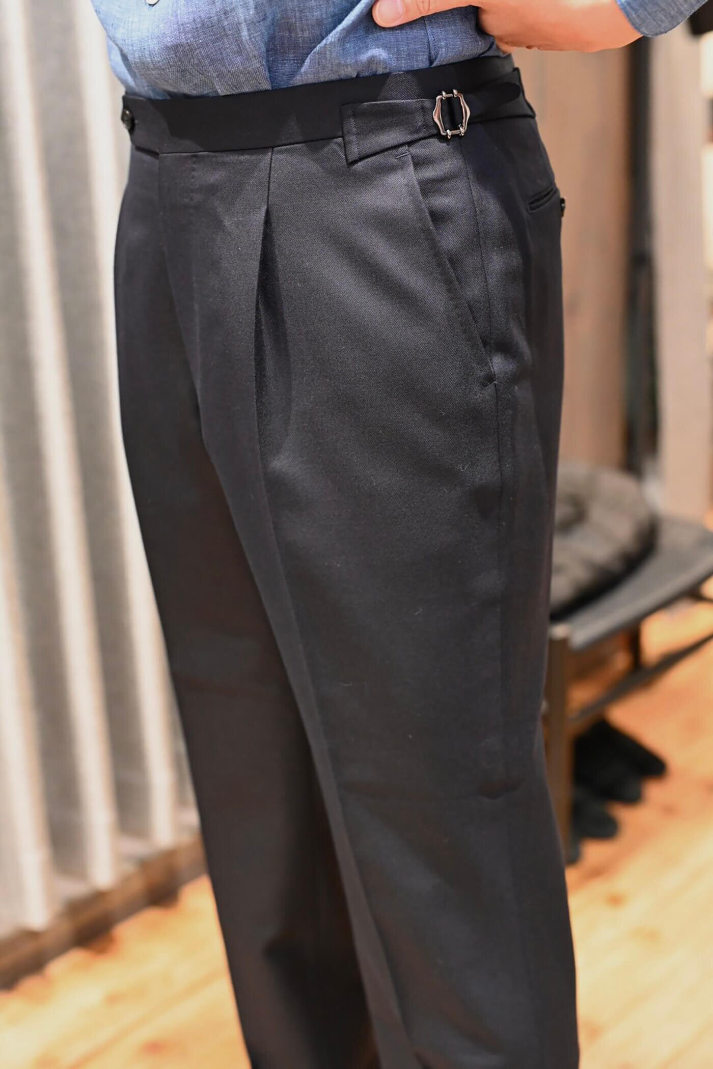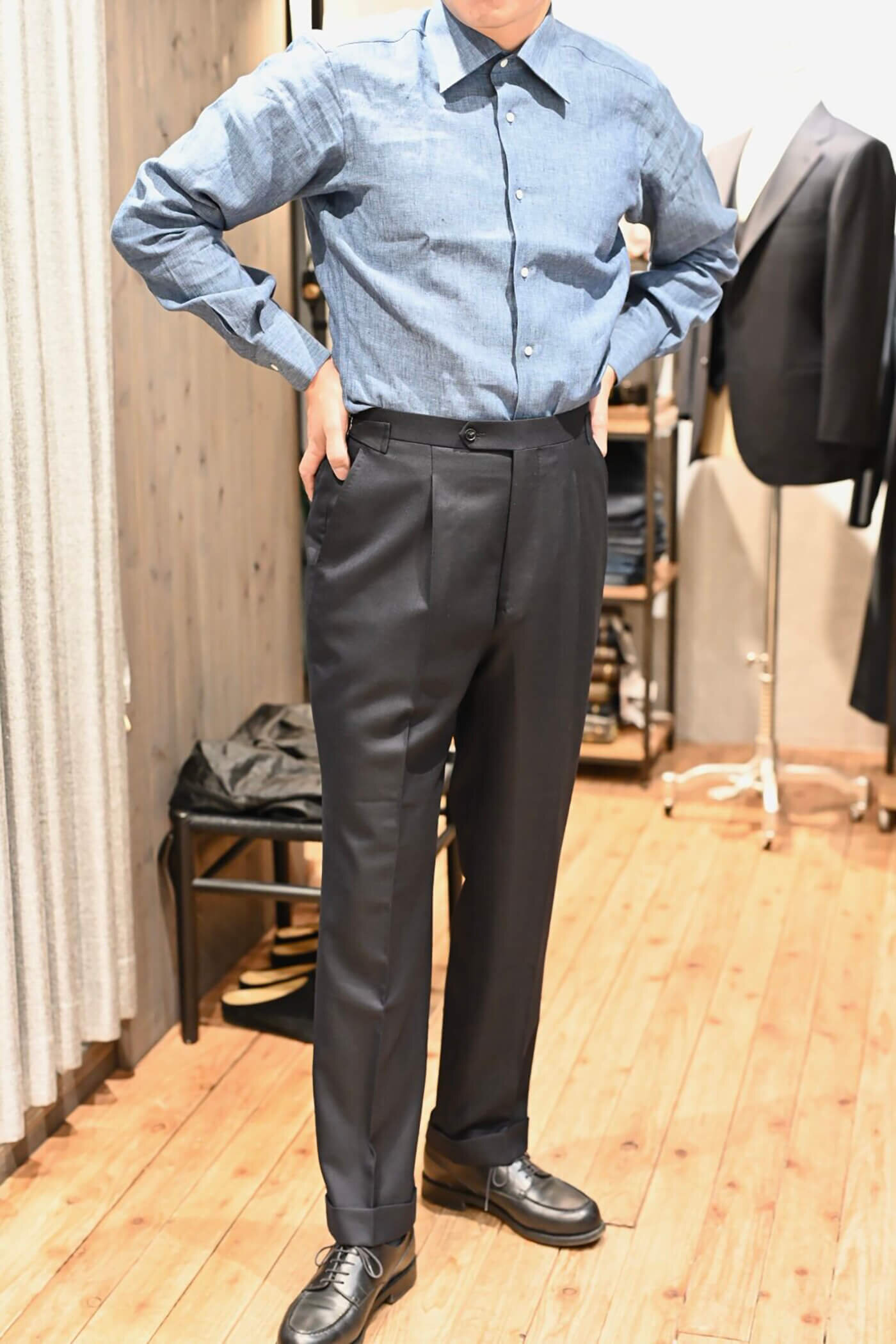 パンツのデザインは、ワンタック・サイドアジャスター付きで仕立てさせていただきました。