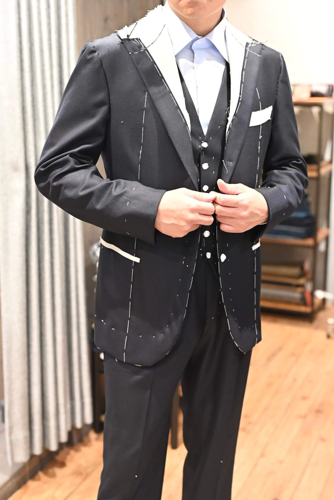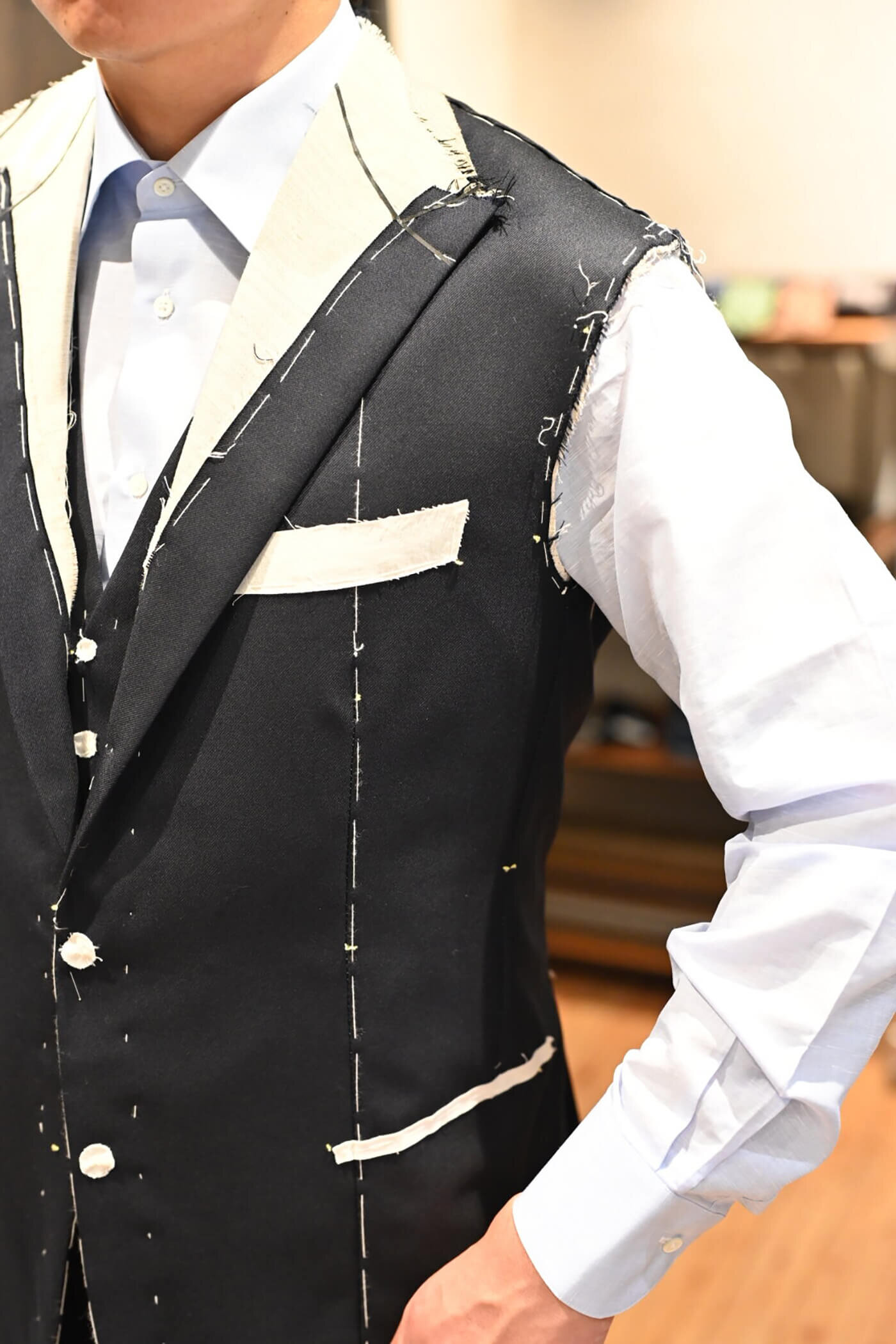 ご遠方からお越しいただいているお客様ですので、オーダー時に仮縫いの日程を予め決めさせていただき、オーダーから約4ヶ月後に東京にお越しのタイミングでDORSO店舗にて仮縫いをさせていただきました。