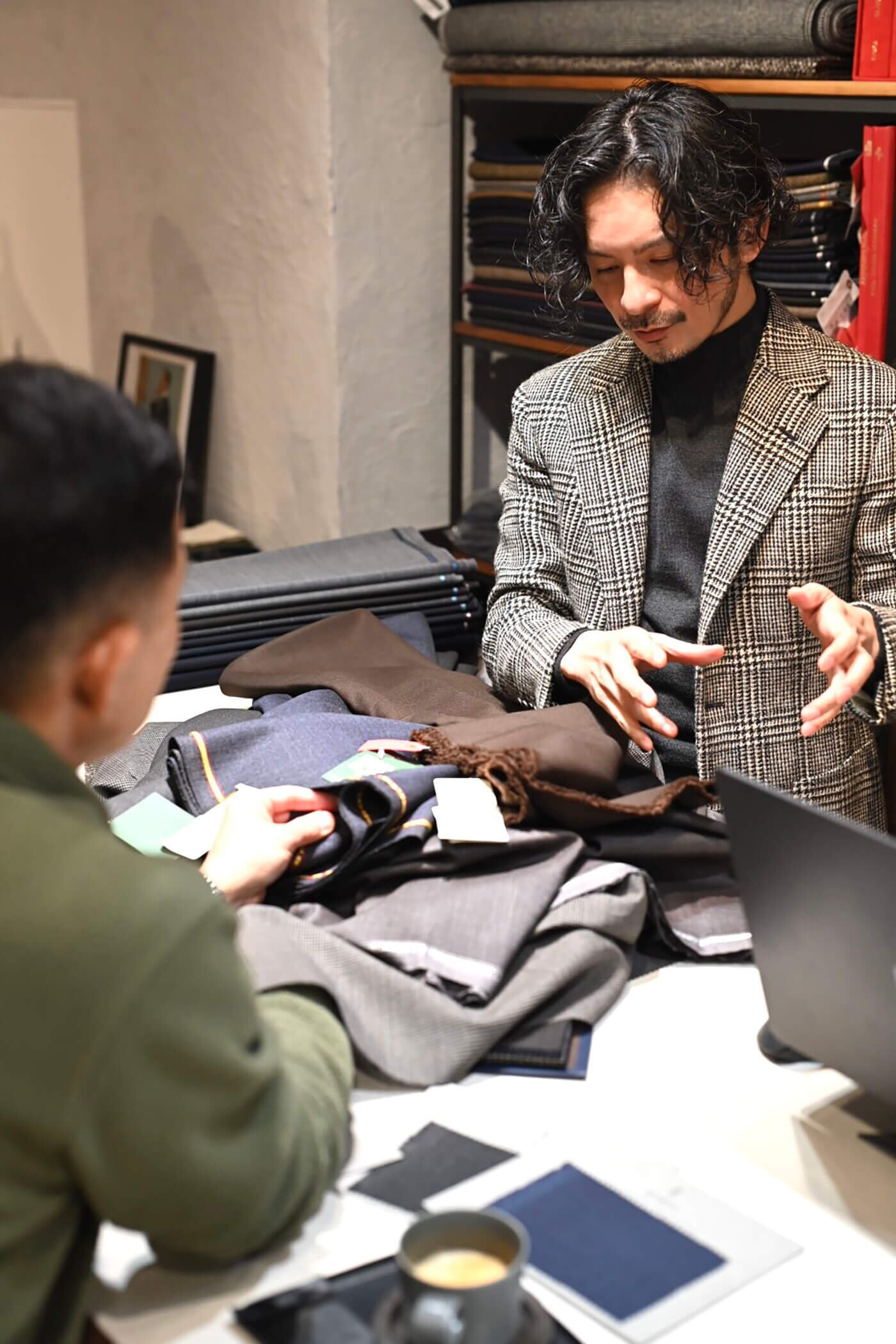 今までに7着のスーツを仕立てさせていただいておりますので、今までの会話とデータからお客様のスーツスタイル・スーツのお好み・スーツに求めるイメージについて共有していただきました。