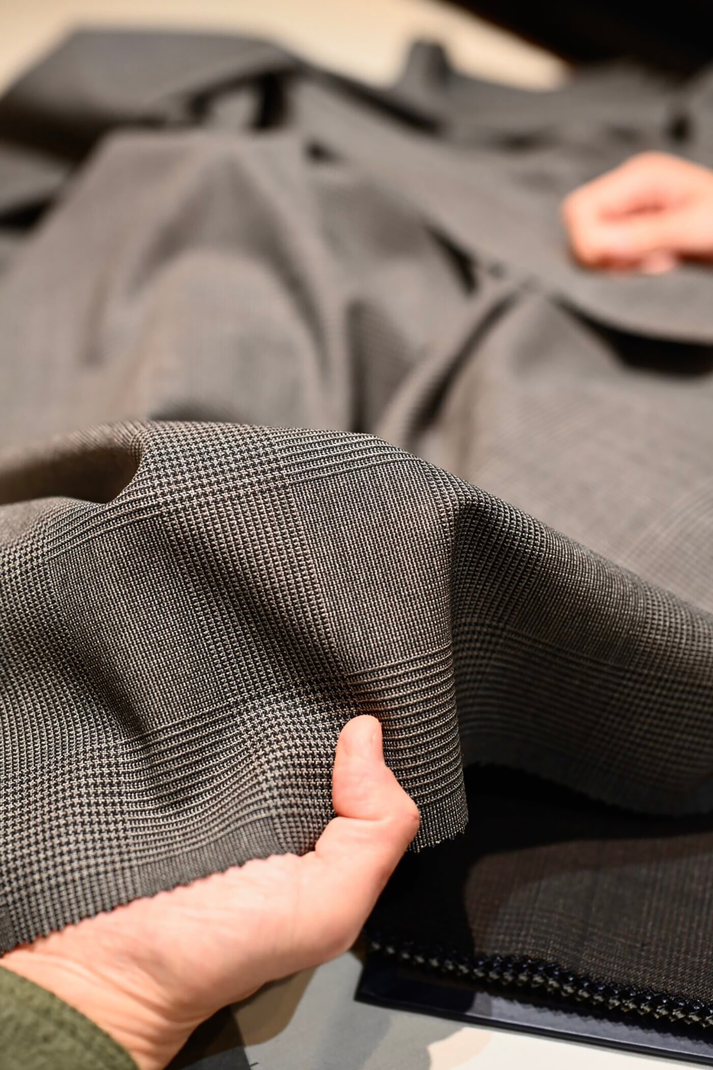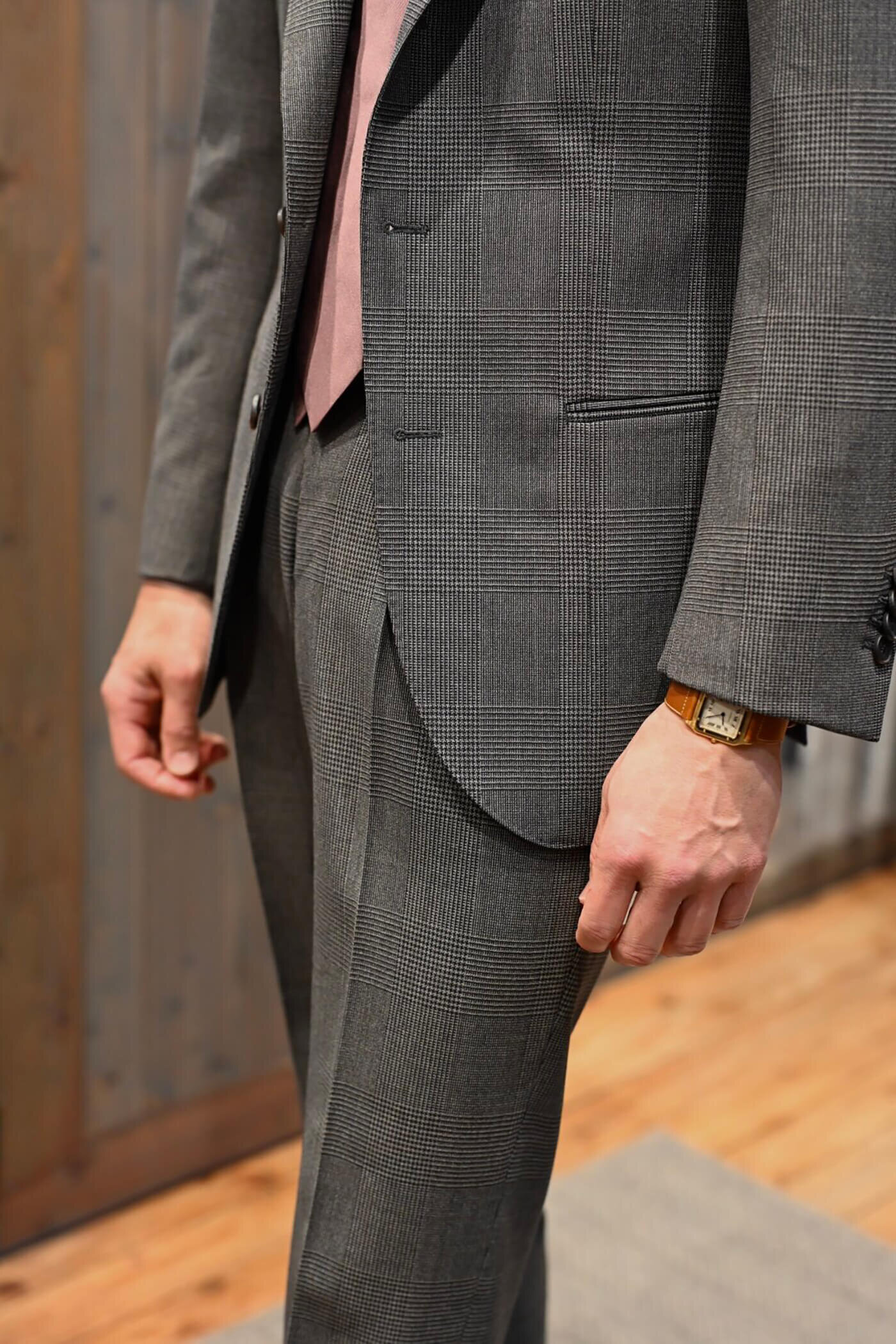 お選びいただいたVBCの4PLY TROPICALのグレージュグレンチェックは"DORSO STOCK COLLECTION"でご用意していた素材となります。