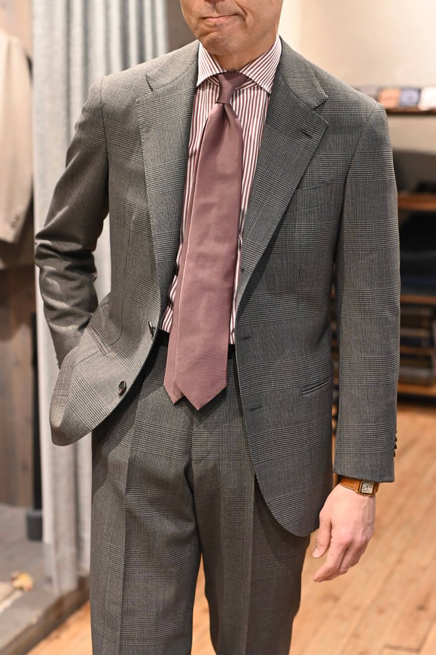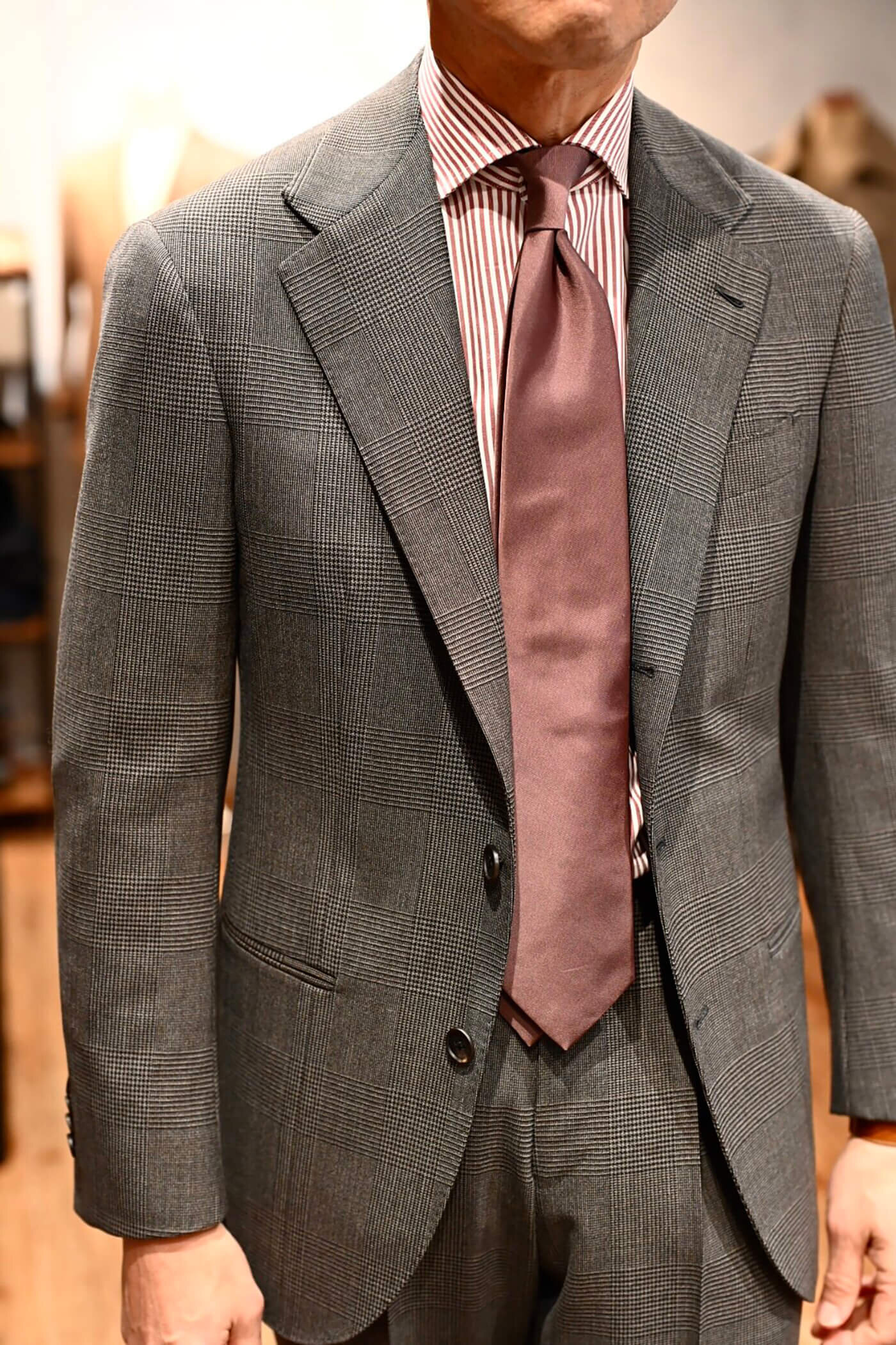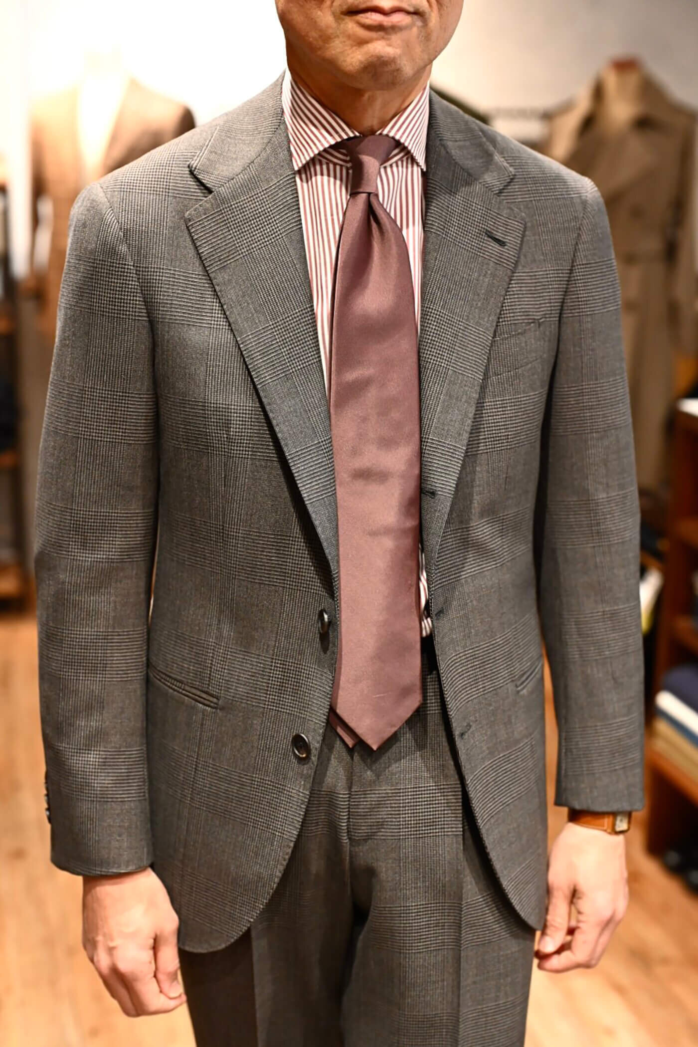グレージュの色味は鮮やかなカラーのネクタイとも相性が良く、幅広いコーディネートを楽しんでいただけるスーツとなりました。