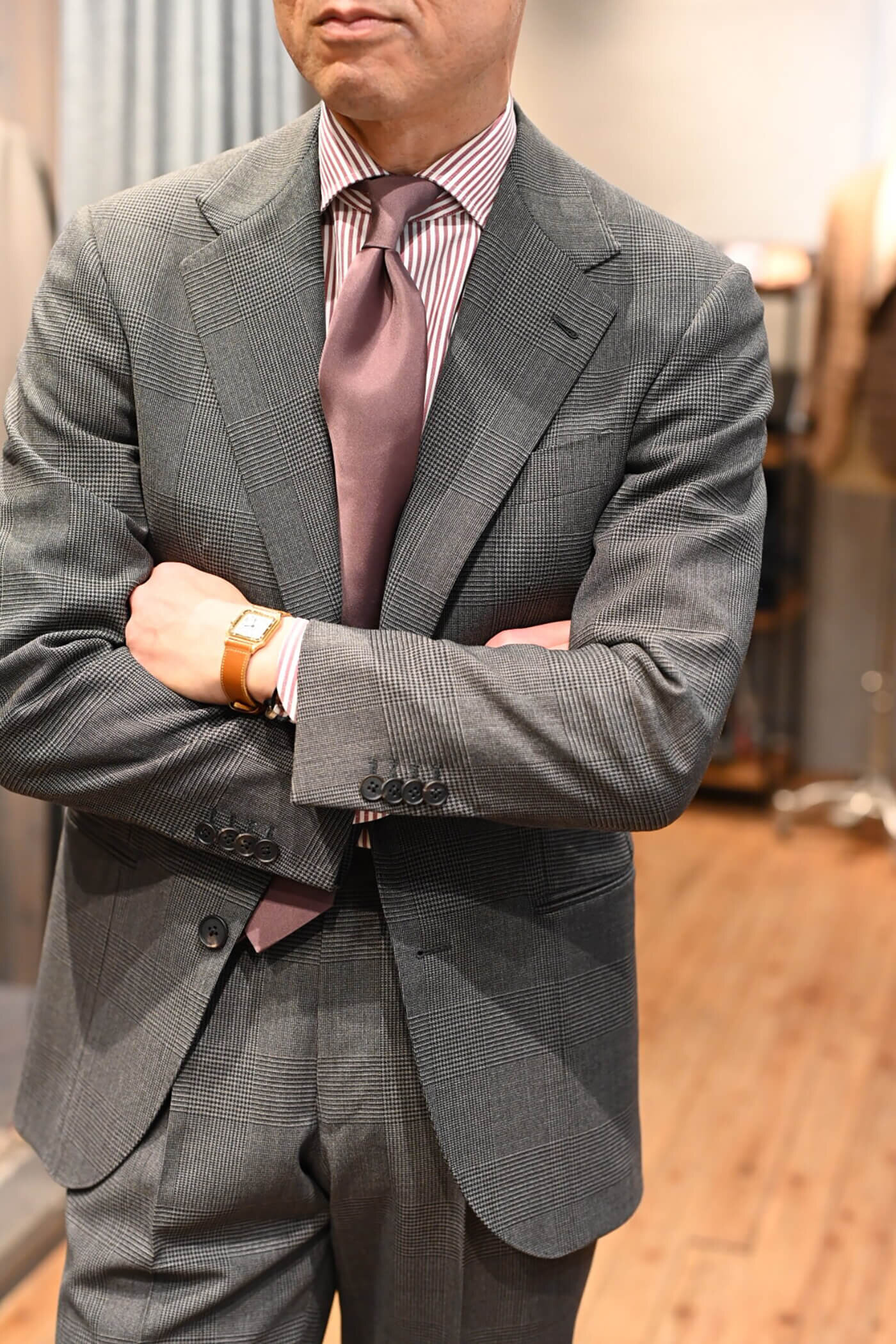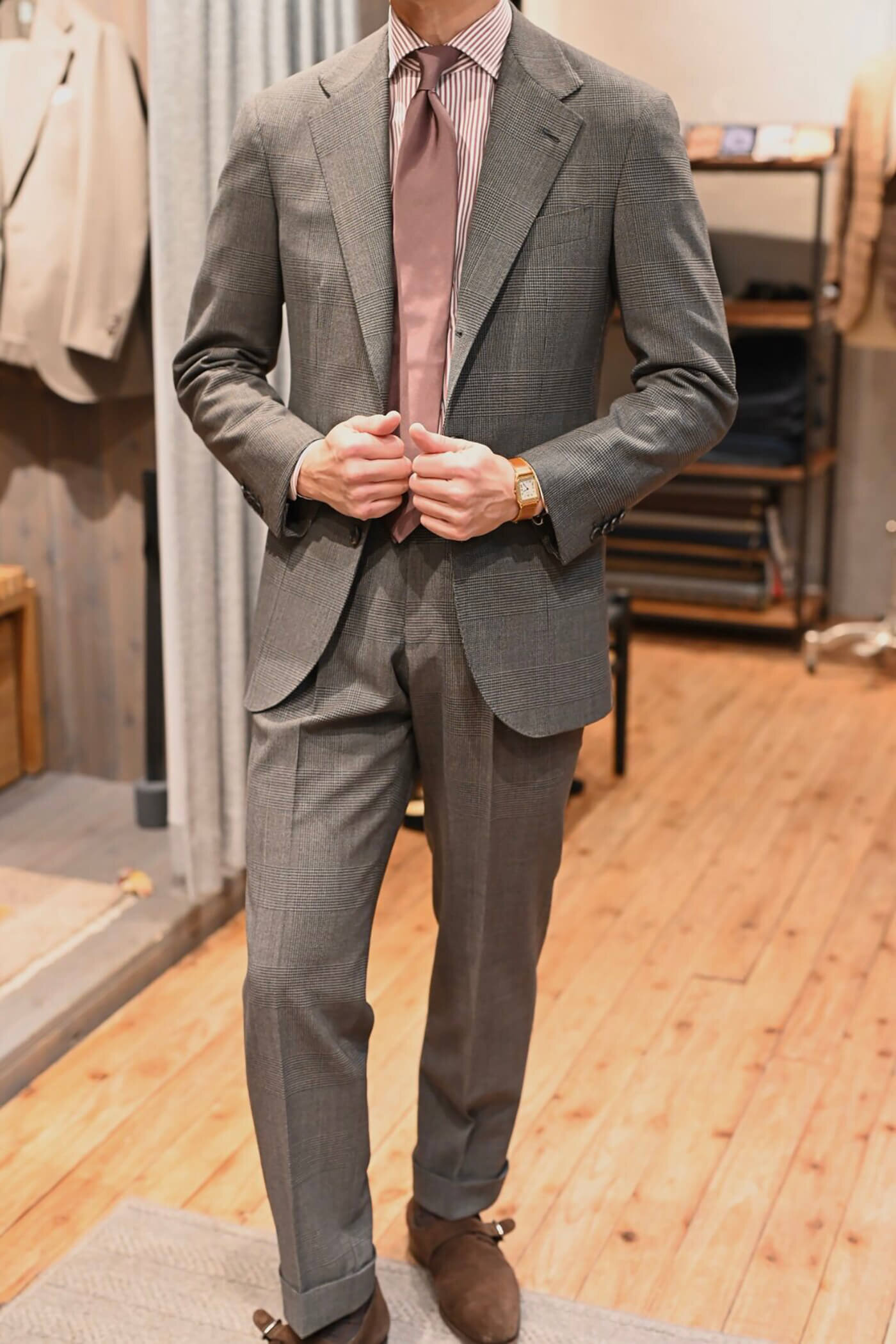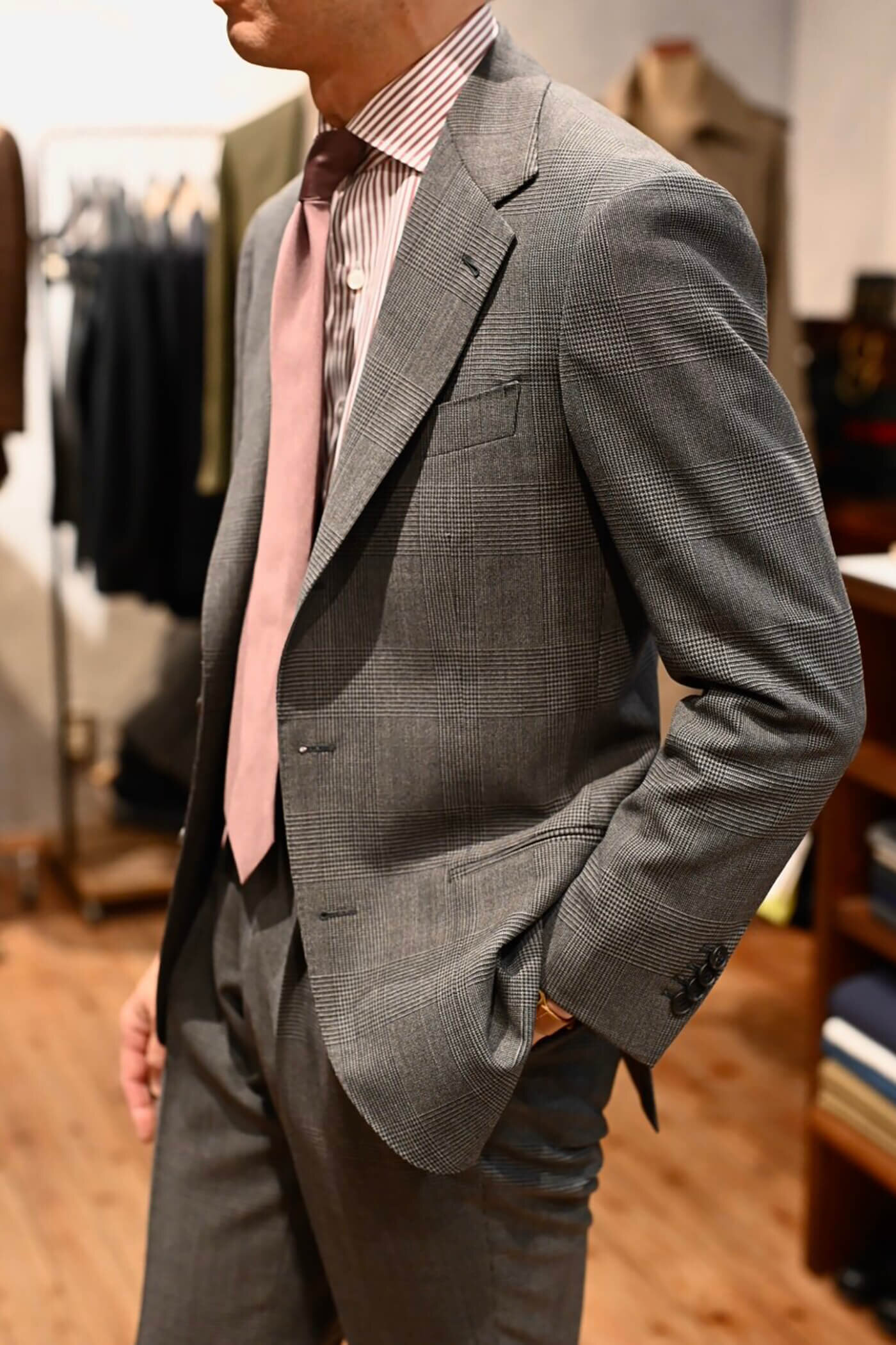 グレージュの色味は鮮やかなカラーのネクタイとも相性が良く、幅広いコーディネートを楽しんでいただけるスーツとなりました。