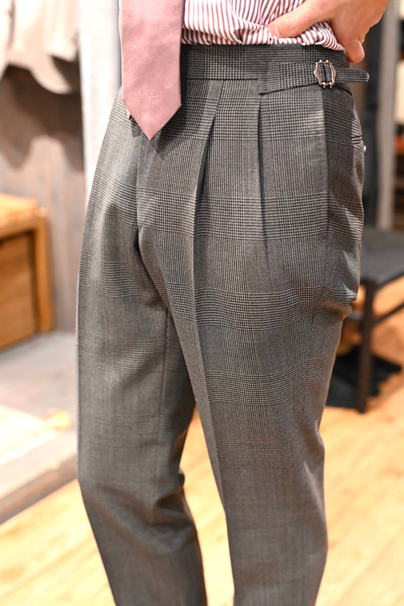 パンツは2タックのベルトレス仕様でサイドアジャスター付きで仕立てさせていただきました。