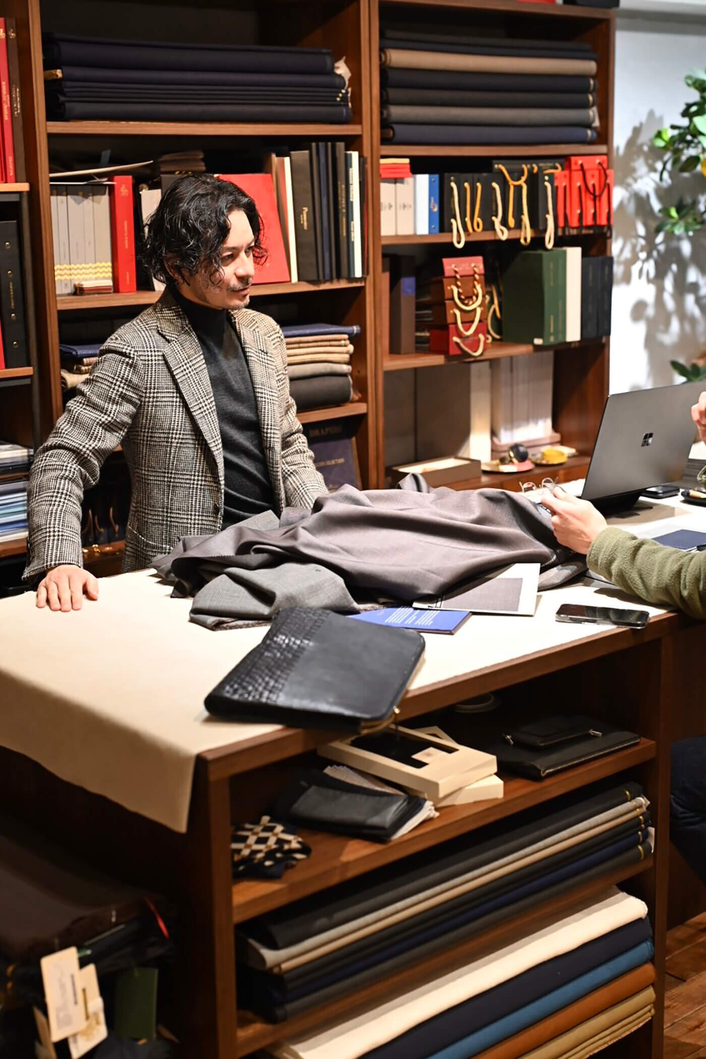 DORSOでのオーダーは、お客様との対話から全ては始まり、お客様それぞれの理想を模索し、最適と思えるスーツやジャケットを作り上げていくために必要な採寸・フィッティングチェックを経て一つ一つを丁寧に仕立てさせていただきます。そして仕上がった洋服をお客様の生活の中で着ていただき、実際の動きに伴う着用感やバランス・仕様(裏地やポケット)・コーディネートについて感じられたことはできる限り共有させていただき、お客様の理想を把握し、お客様の生活に心地良さを与えることができる洋服作りを目指したいと思っております。