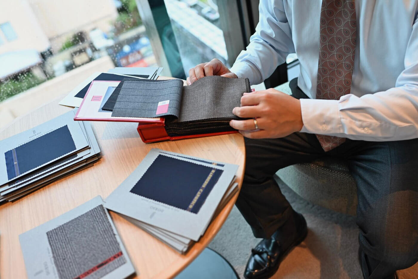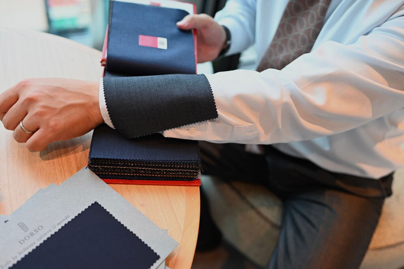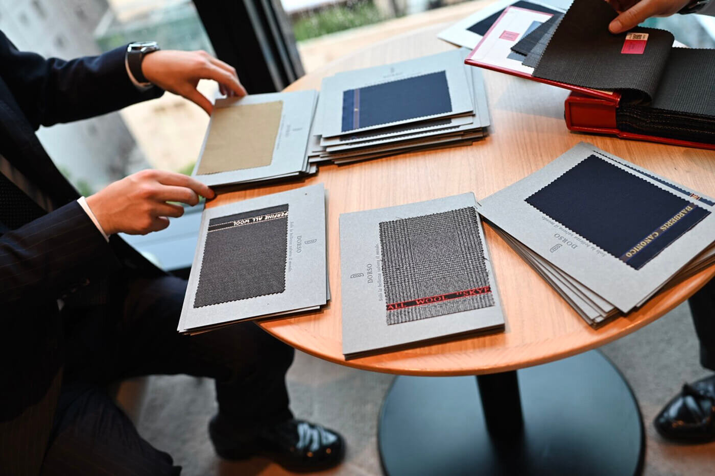 DORSOのトランクショーは今までにオーダーで洋服を仕立てた経験がない方やトランクショーに参加をしてオーダーをしたことがない方にとっても安心してお越しいただけるように、事前にメールやお電話でできる限りお話をさせていただいた上で当日お会いした時にお客様のご期待に添えるDORSOらしい提案をさせていただく事を大切にトランクショーを開催しております。