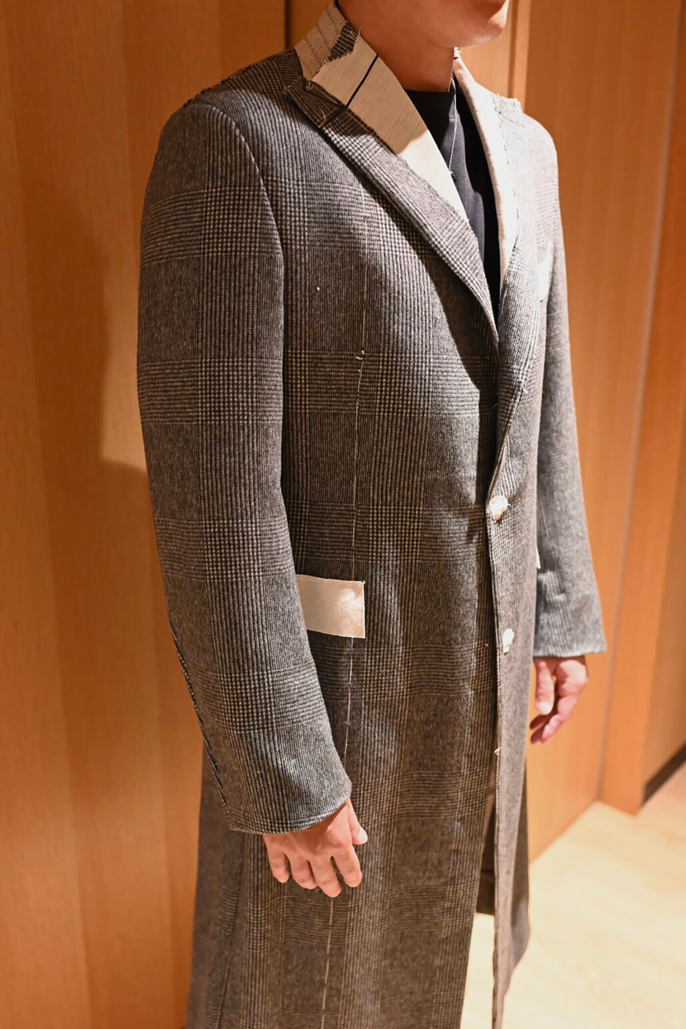 大阪トランクショーでオーダーを頂戴したシングルチェスターコートの仮縫い。
