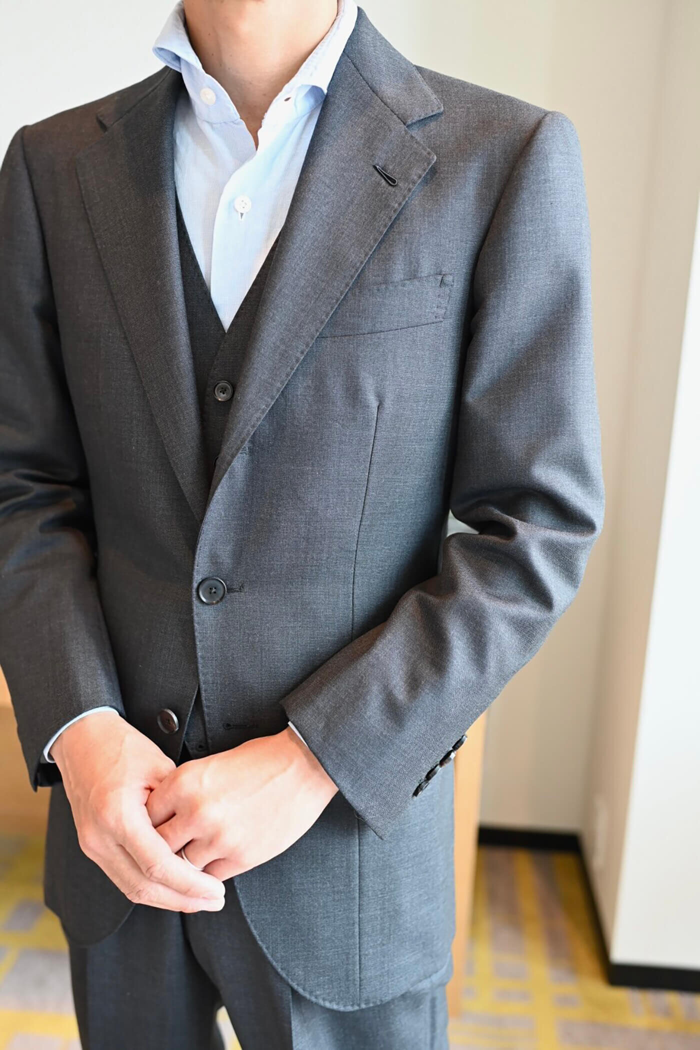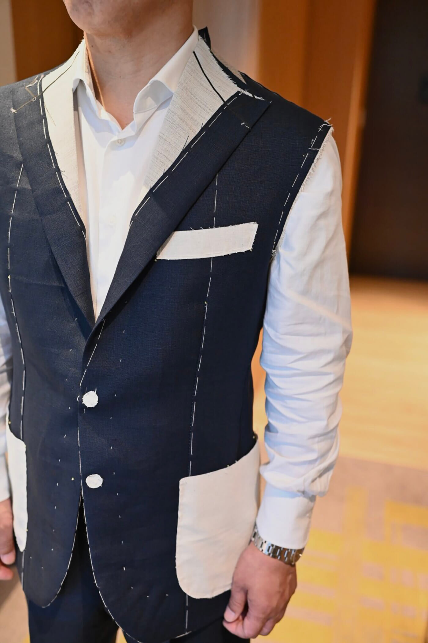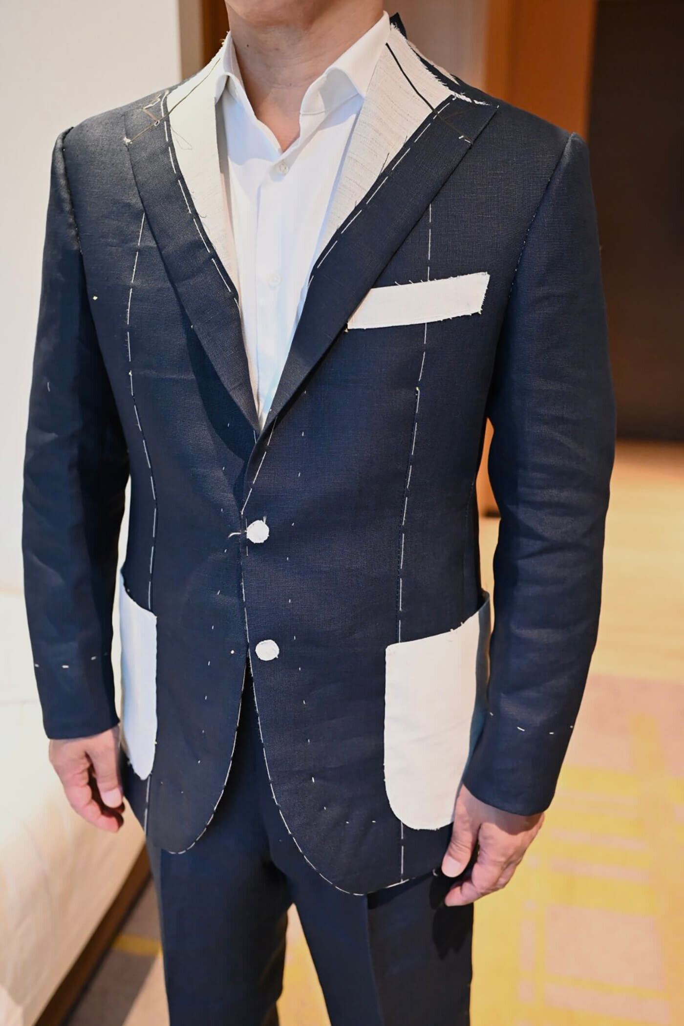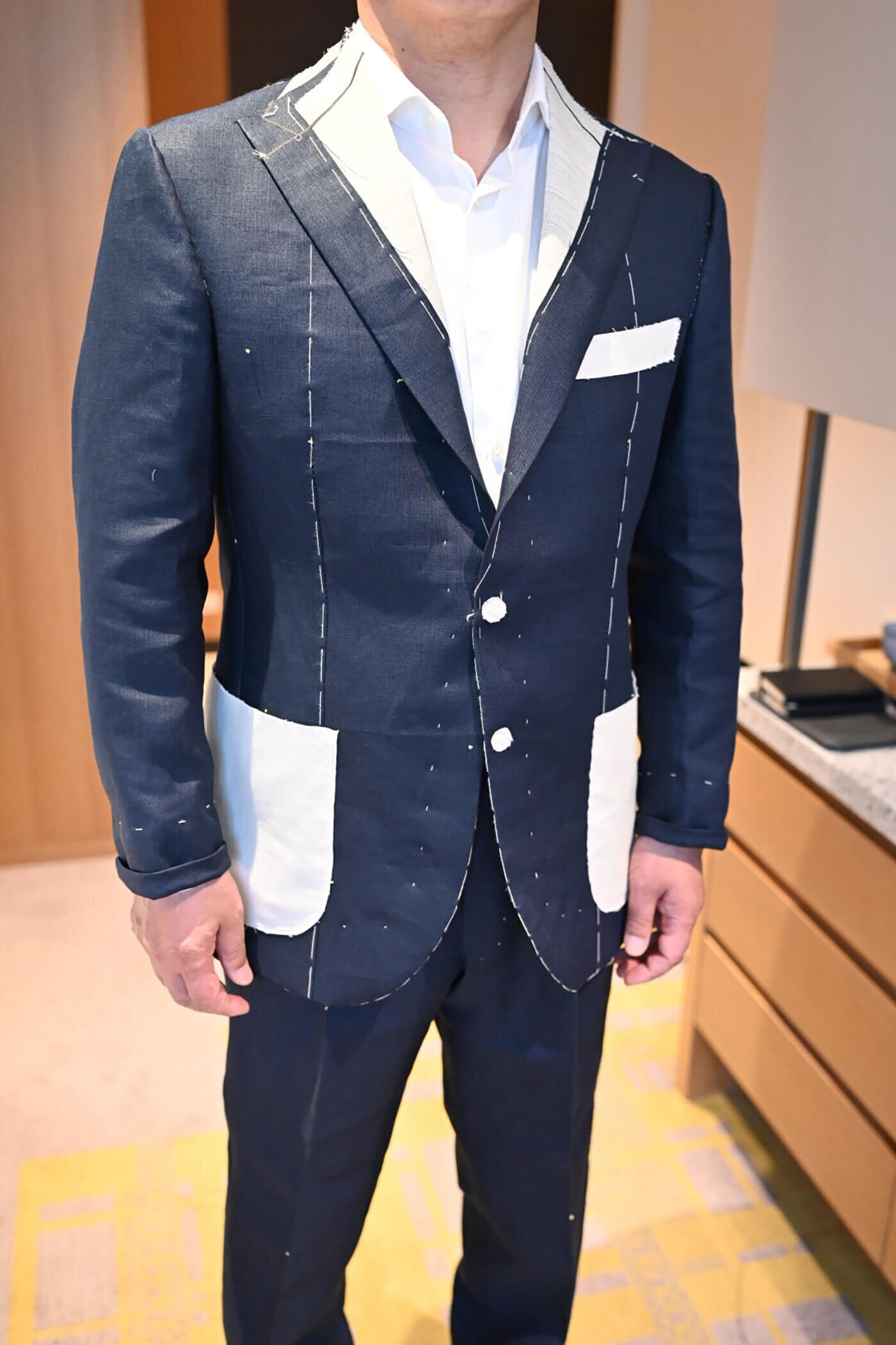 こちらのお客様は広島トランクショーでオーダーを頂戴したアイリッシュリネンのツーピーススーツの仮縫いをさせていただきました。
