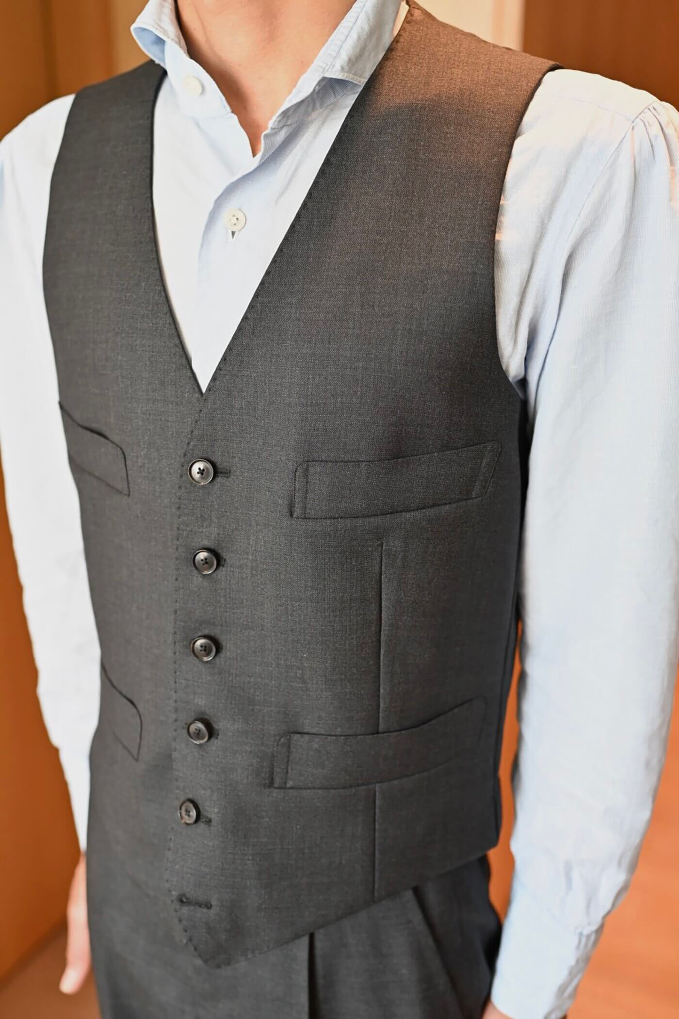 デッドストックのESCORIAL(エスコリアル)でお仕立てさせていただいたスリーピーススーツのご納品。